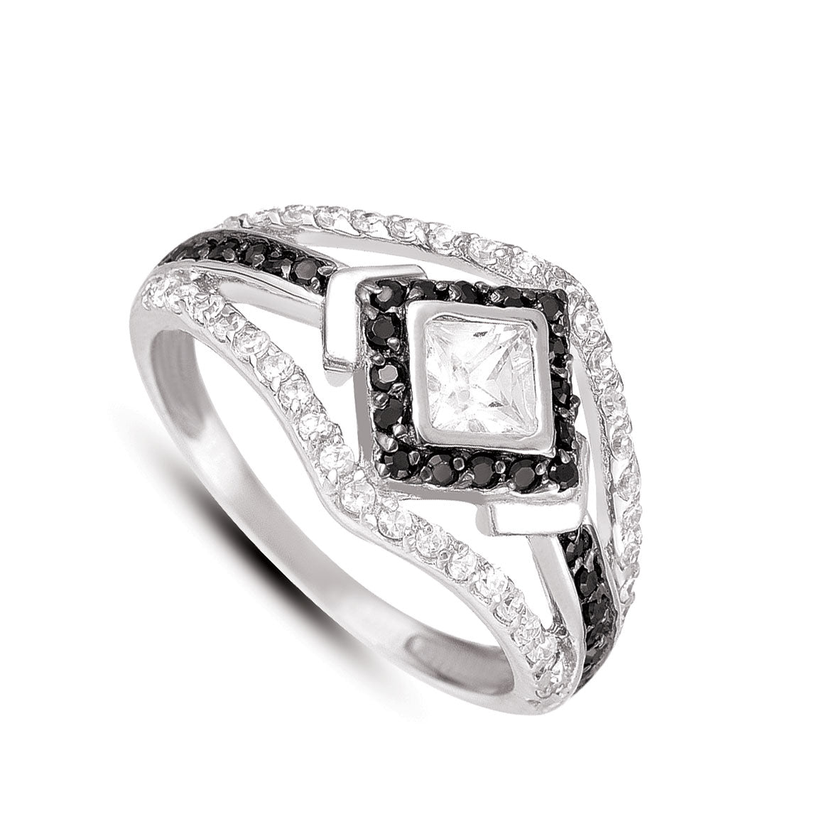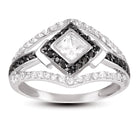 This stunning ring combining black and white cubic zirconia in a sterling silver setting works very well with any outfit.This ring is in a halo setting and is available at a very reasonable price.