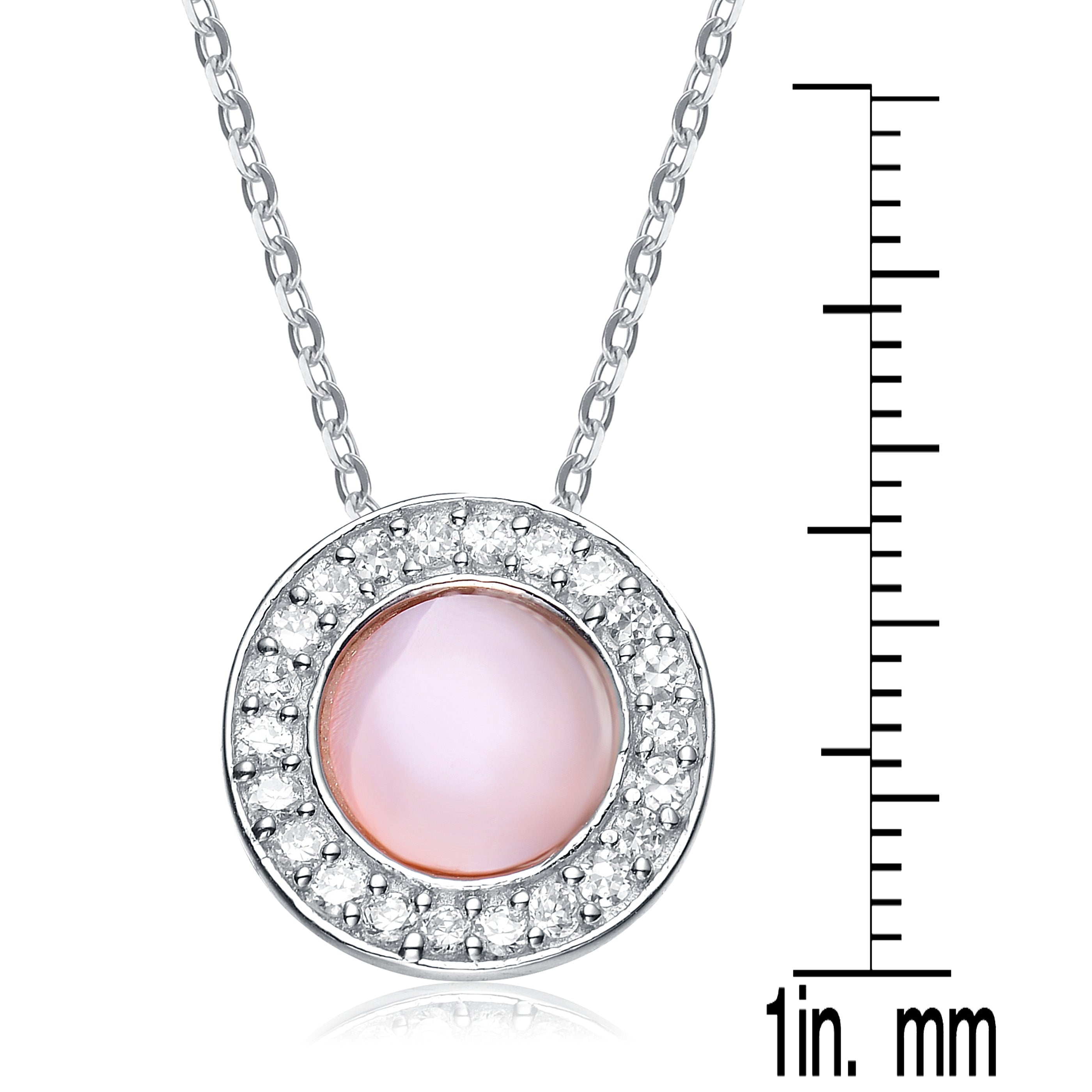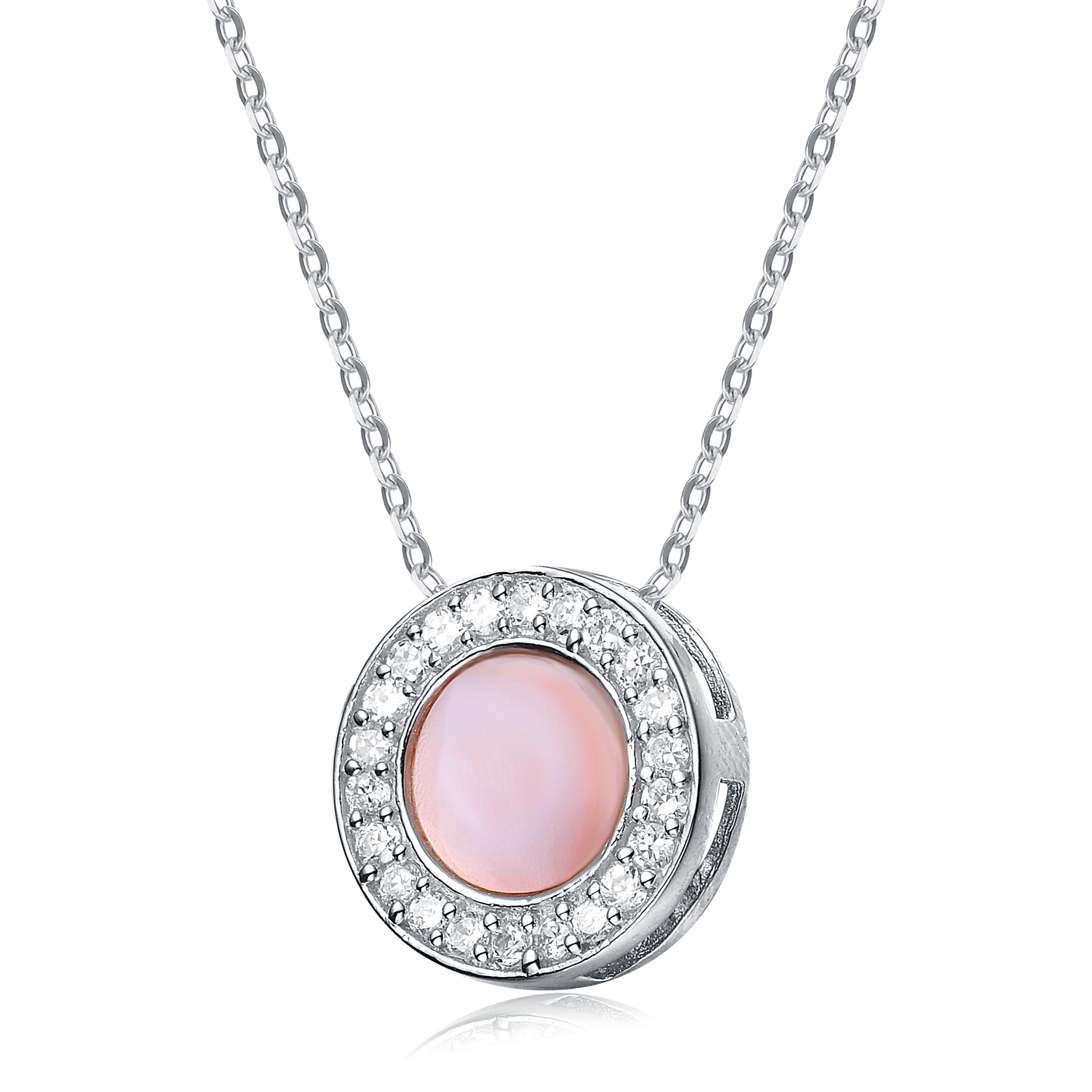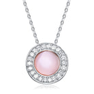 A beautiful soft circular pink cubic zirconia rests within a frame decorated with brilliant white cubic zirconia laid in sterling silver.This elegant necklace will work well to add that touch of girlish charm.