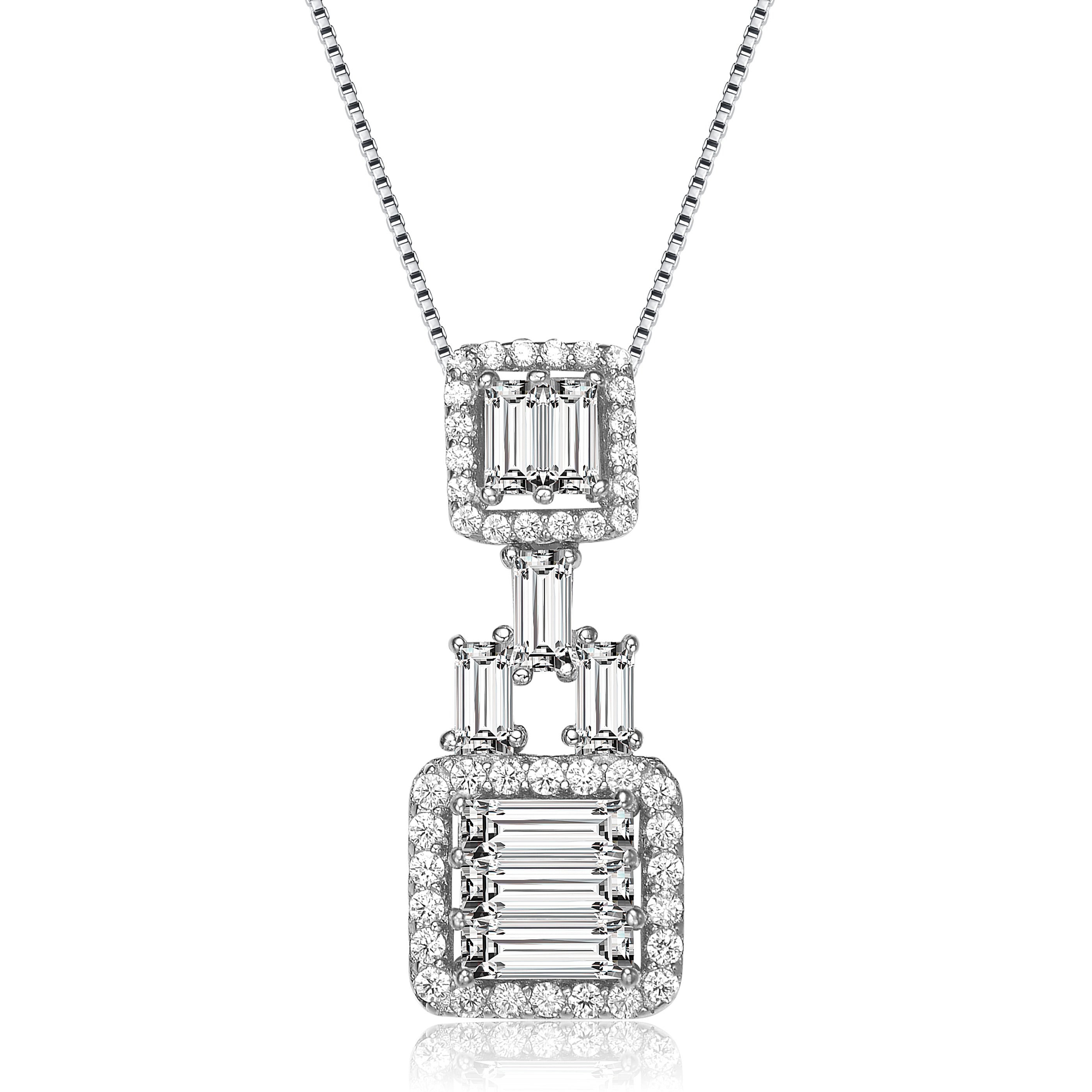 Features 2 square trinkets connected by mini bars with accents of clear white cubic zirconia gemstones. This pendant necklace is made from .925 sterling silver that makes it more classy and elegant.