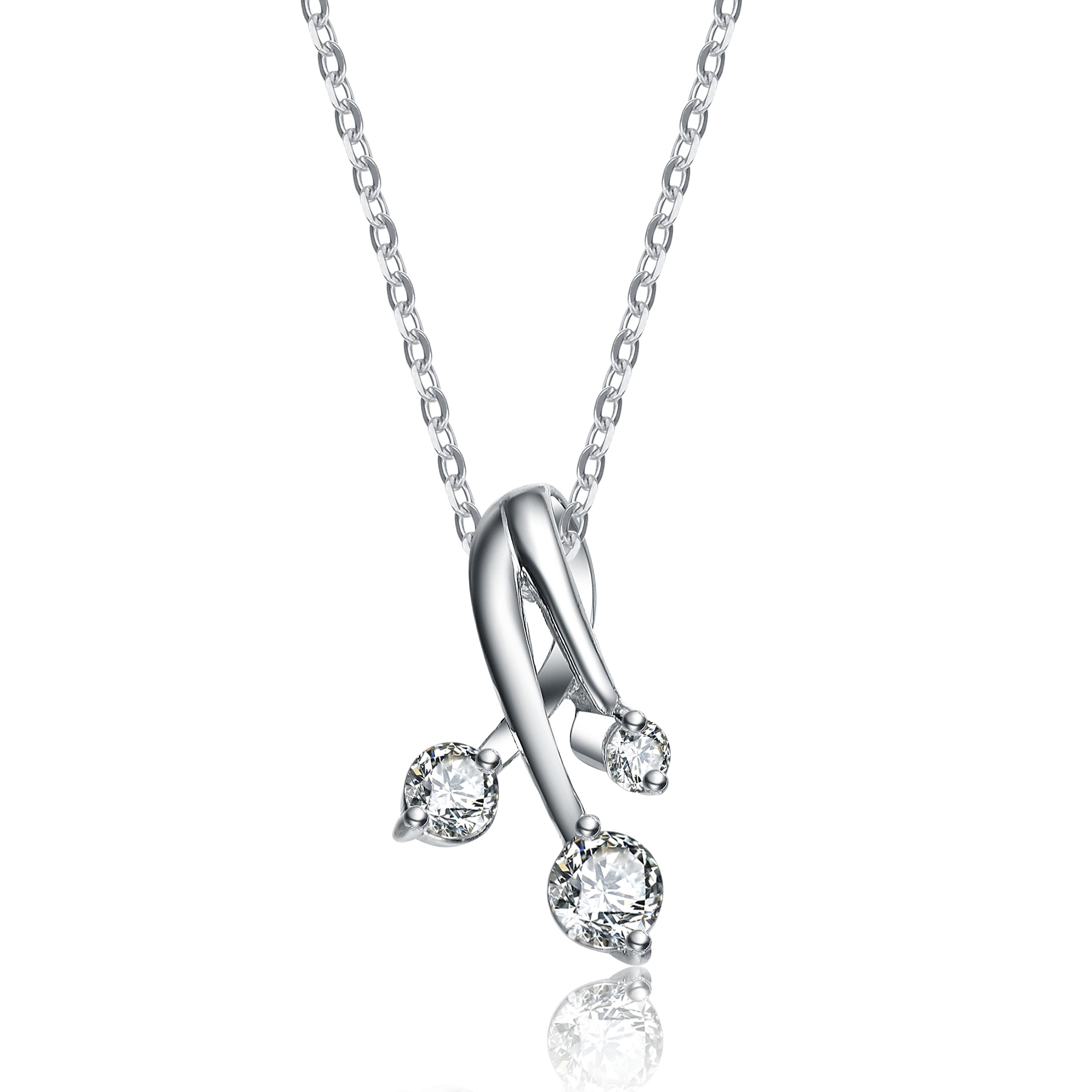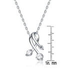 This is a whimsical sterling silver pendant with a design that seems to look like three small flowers with a rhodium-plated stem and large white cubic zirconia stones. The three pieces merge at the top forming a secure clasp which holds onto a rhodium-plated necklace chain; it is perfect for casual daily wear.