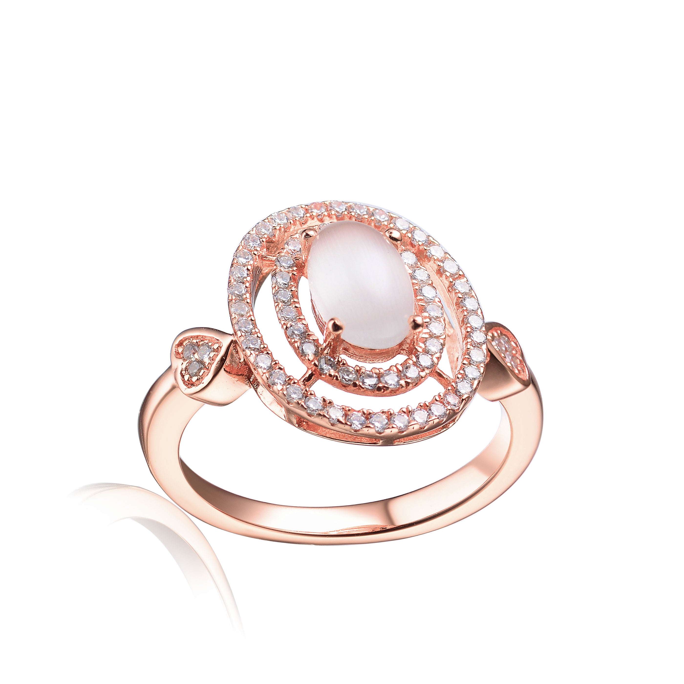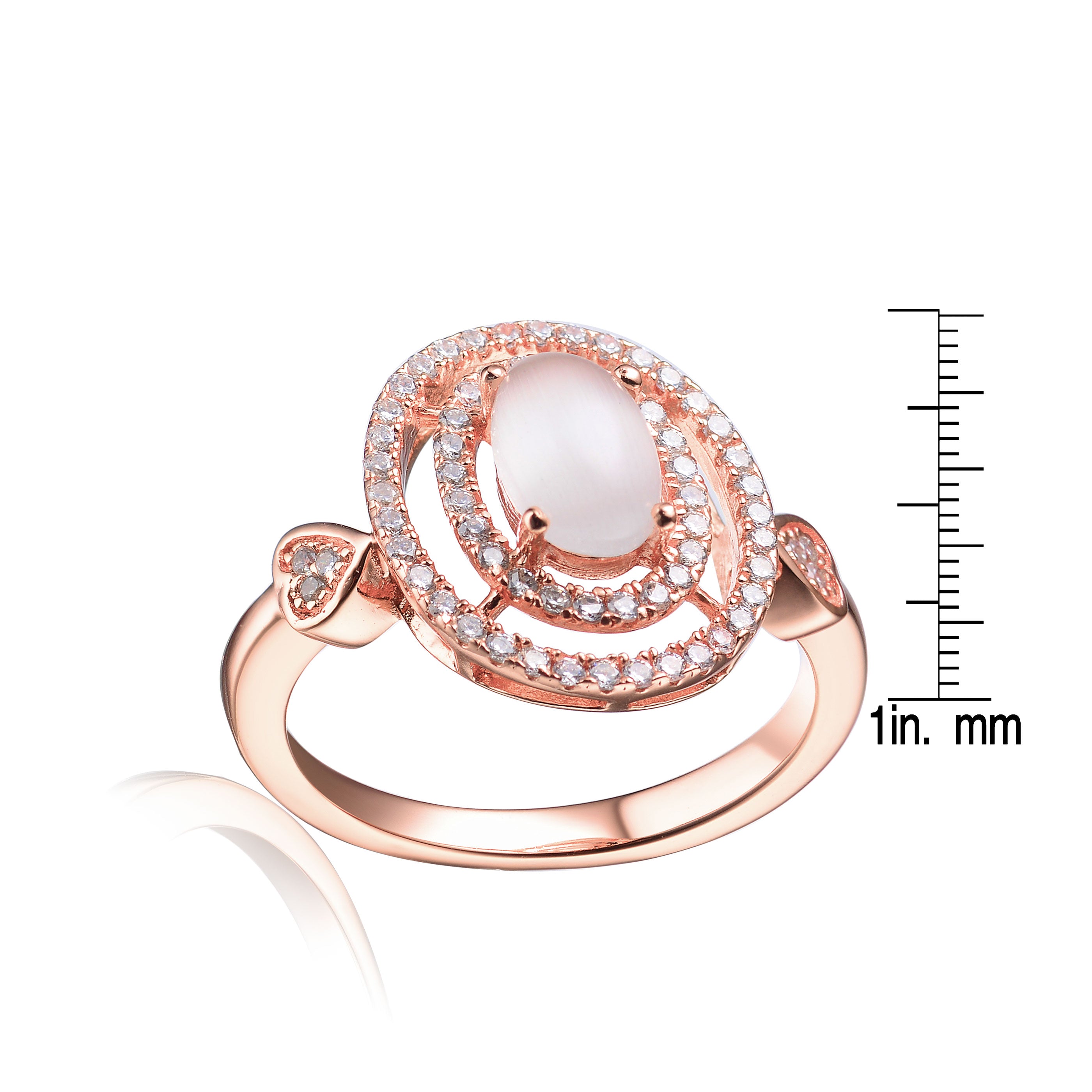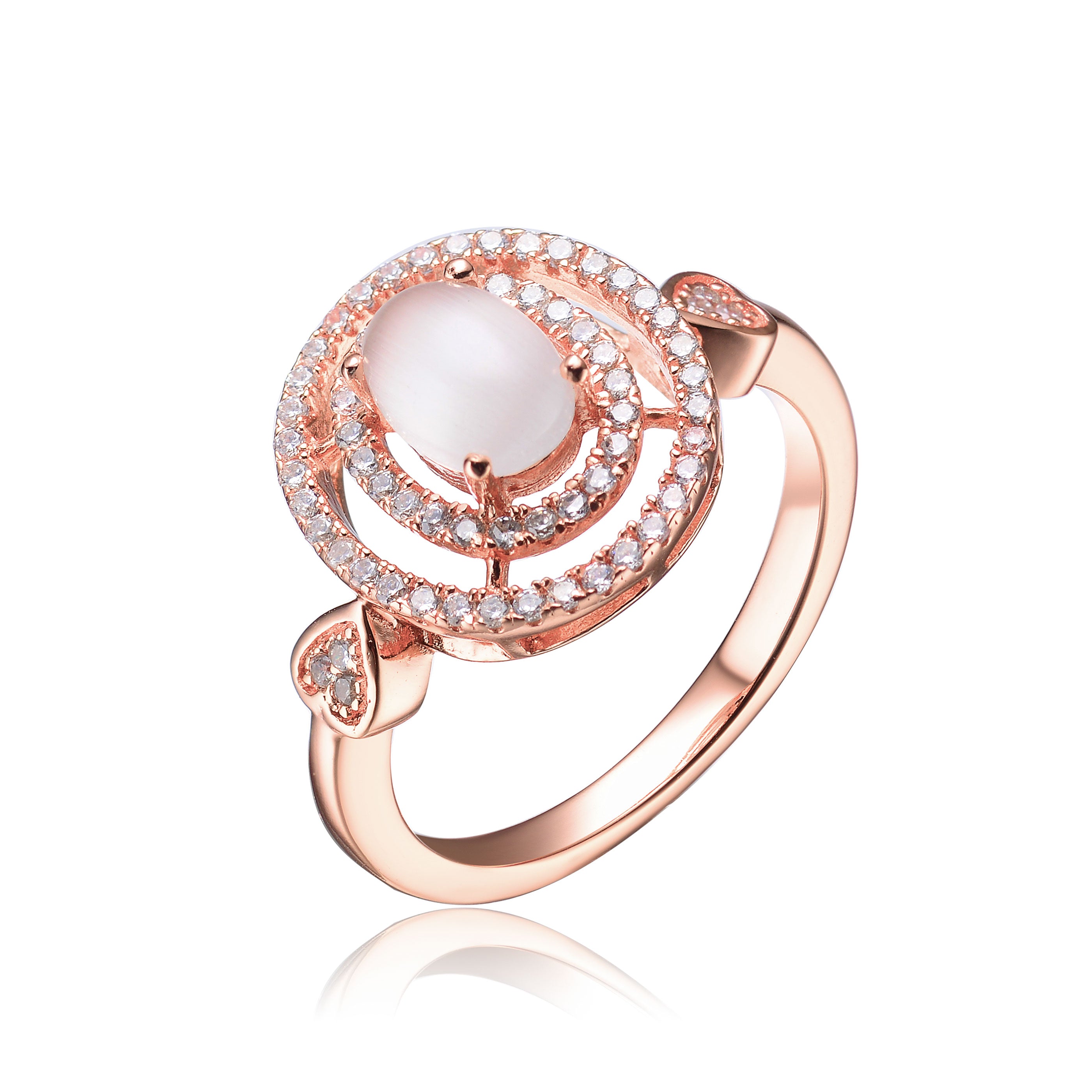 This halo styled setting holds a pearl in the center, surrounded by two rings made of white cubic zirconia set in rose plated sterling silver. This beautiful ring created by is the perfect accessory to compliment your feminity.