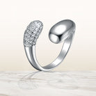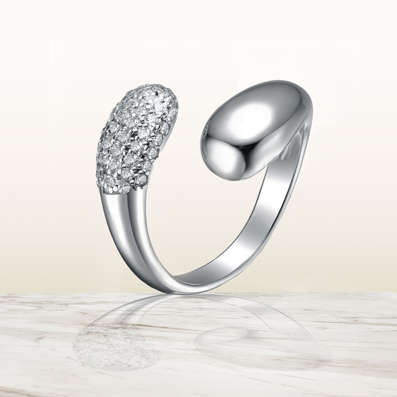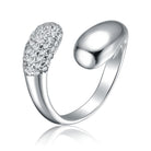 Classy White Gold Plated Cubic Zirconia Bypass Ring. This design features two bands passing each other on the top, the bands are pear shaped on the top, one paved with clear round cubic zirconia stones and the other made out of solid metal. Crafted of White Gold Plated and it is available in sizes 6,7 or 8. Makes a great gift as well.