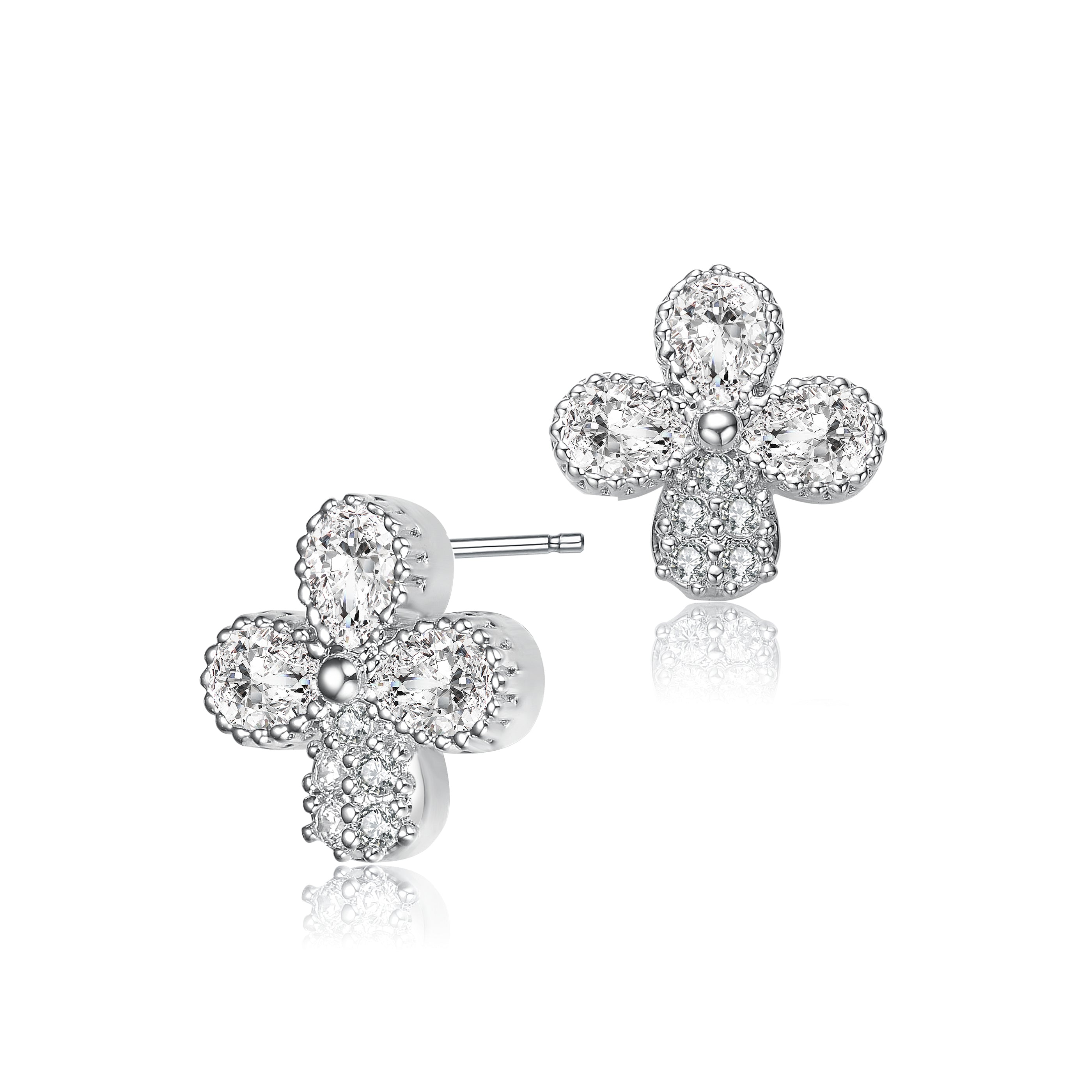 Artfully crafted stud earrings feature three clear pear Cubic Zirconia and a cluster of clear round Cubic Zirconia formed together to create a four petal clover. Crafted of Sterling silver with Rhodium plated the earrings secure with butterfly clasps.