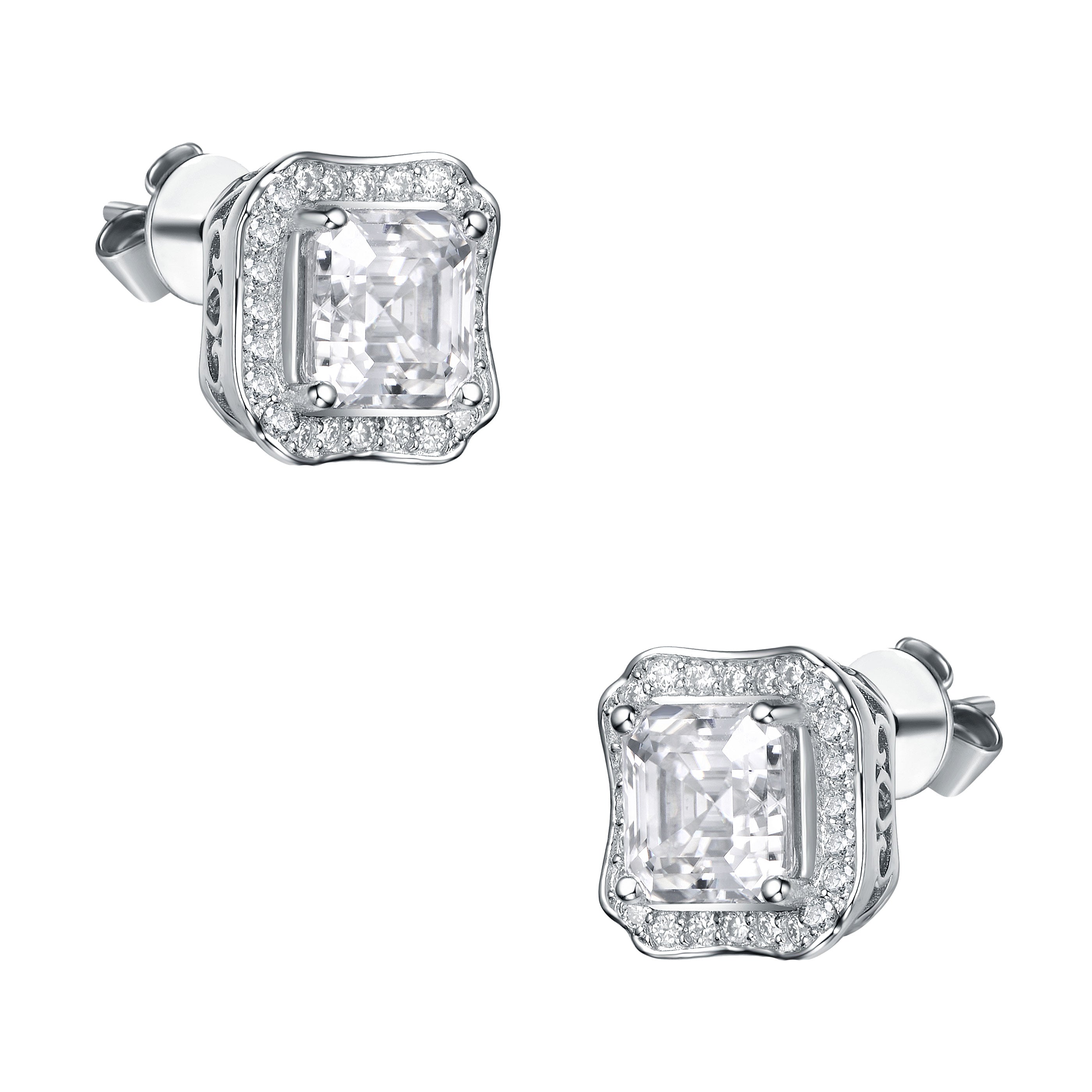 Sterling Silver with 2.50ctw Radiant Lab Created Moissanite Halo Vintage Geometric Square Stud Earrings. These stunning sterling silver earrings display 2.50 carats of pure glamor, perfect for selecting as the main focal point for your work, casual, or night look. Sparkling radiant cut and round brilliant cut lab created moissanites prong set in dazzling square shapes give these pretty earrings a vintage influence and have VVS1 clarity and D color. Butterfly backs keep these earrings secure.