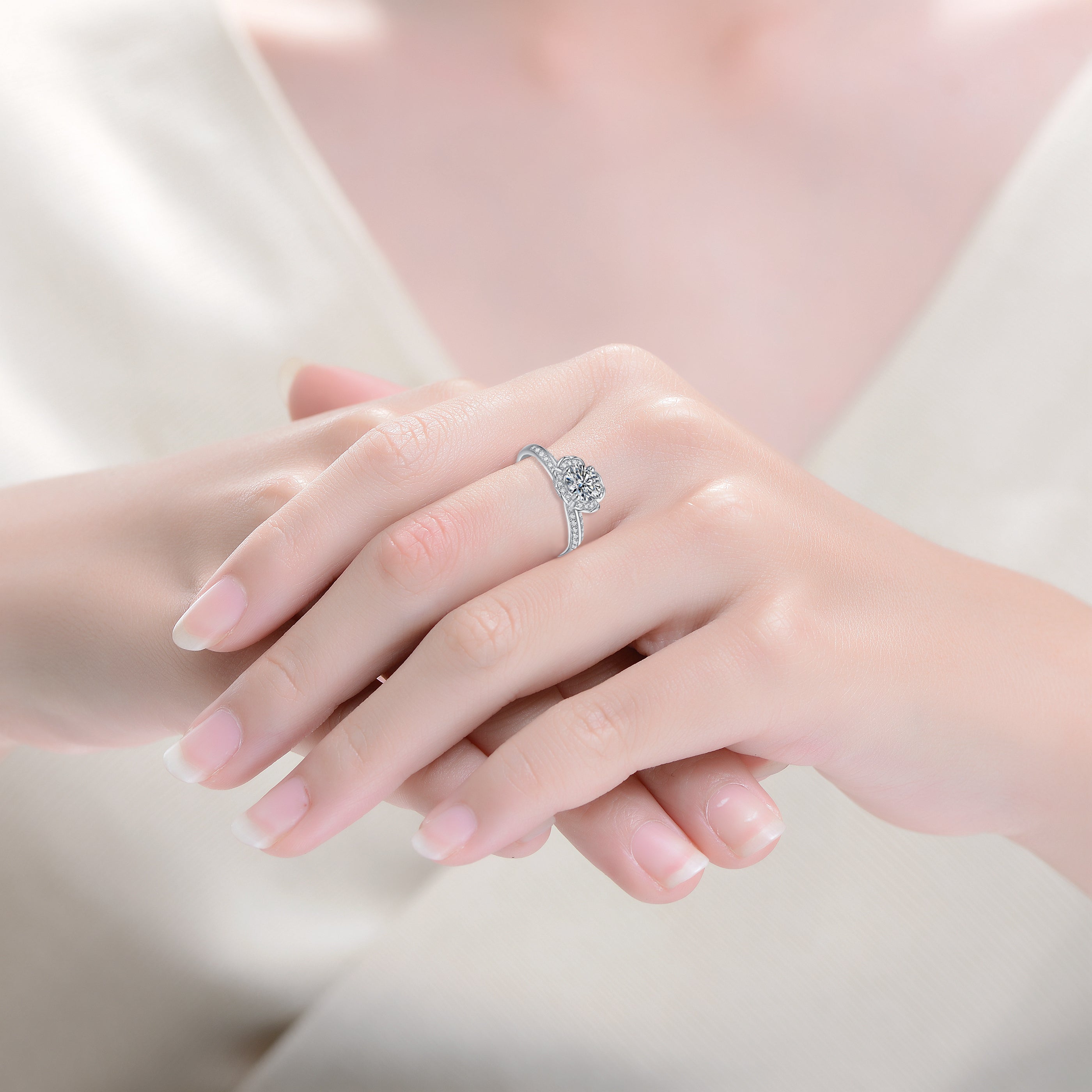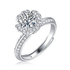Sterling Silver with 2ctw Lab Created Moissanite Tulip Pave Engagement Adjustable Ring. This gorgeous sterling silver engagement ring features a sparkling round brilliant cut lab created moissanite secured in a raised four-prong setting. A glittering halo of round brilliant cut lab created moissanites surround this center stone in a romantic halo tulip cluster complemented by additional moissanite stones on the adjustable band. All moissanites have VVS1 clarity and D color, glittering from all angles when worn for a romantic style.