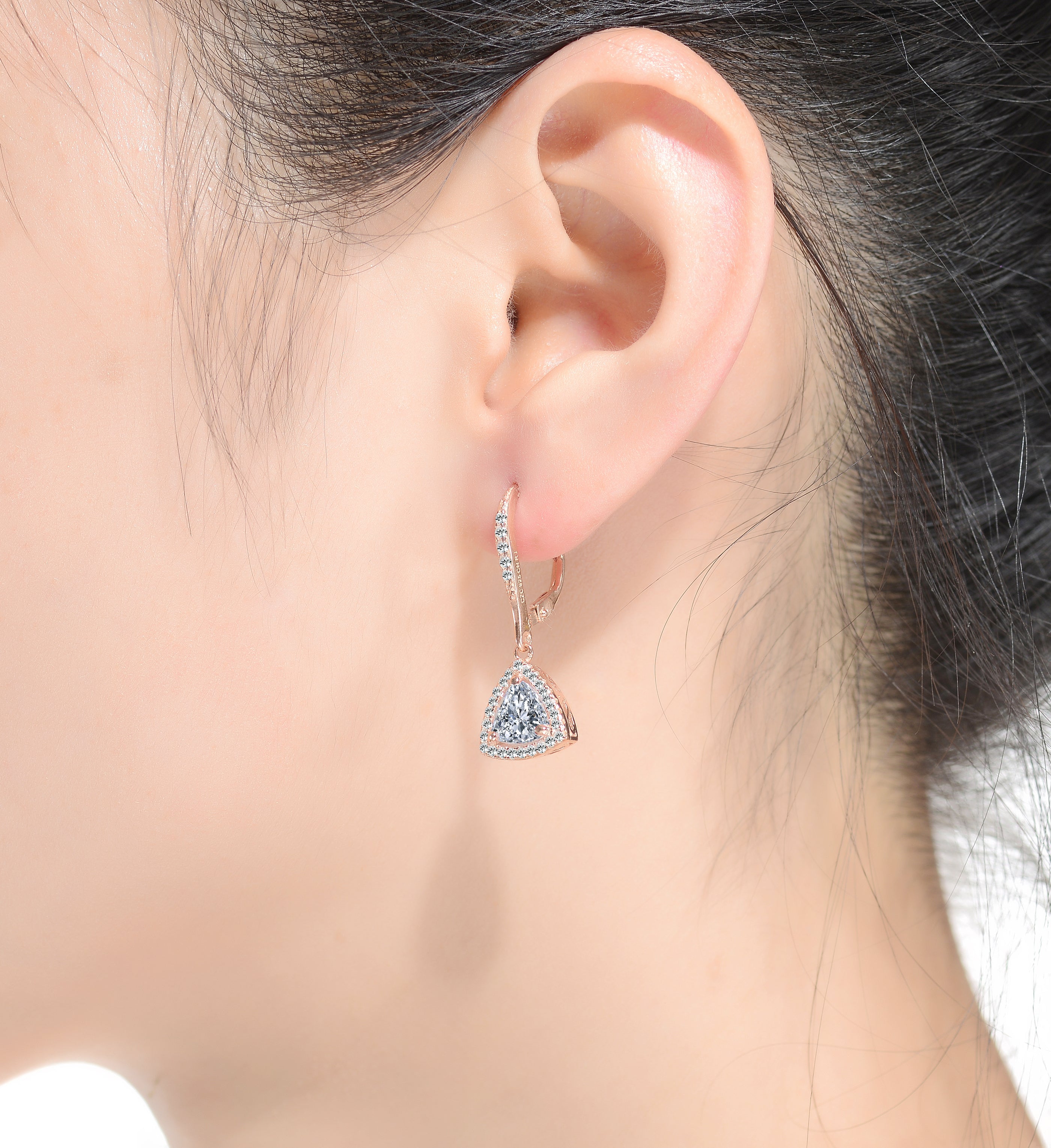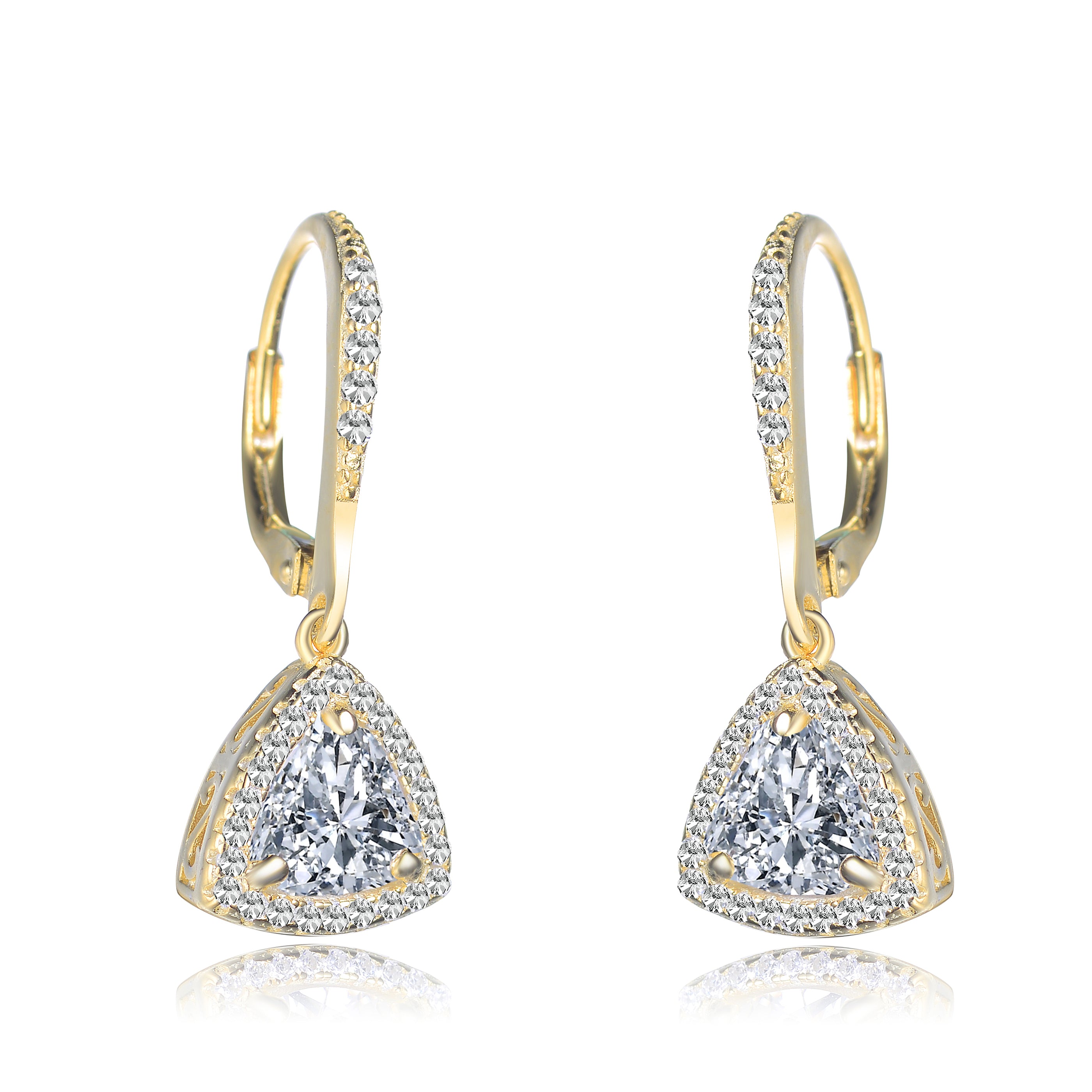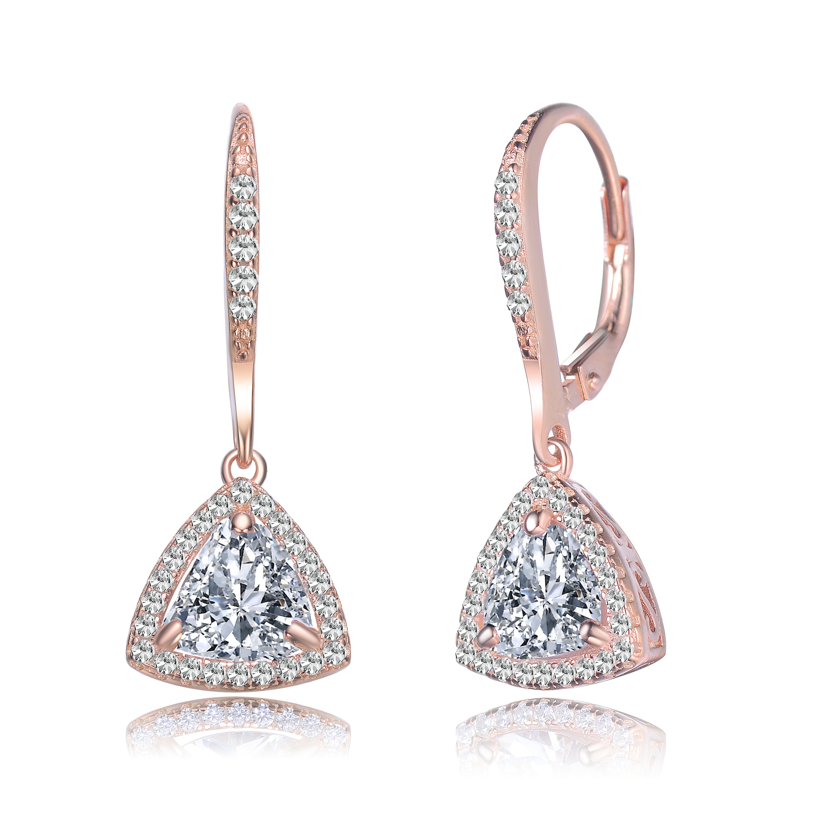 Add a touch of dazzling sophistication to your look with these stylish drop earrings, crafted from genuine .925 sterling silver. These dainty earrings showcase brilliant cubic zirconia stones in elegant geometric designs, perfect for enhancing any outfit. Choose from designs featuring a combination of clear round-cut and triangle cubic zirconia stones, set in either Gold plating for a bright finish, or an elegant Rose Gold Plated finish that highlights a charming clear triangle CZ accented with round stones. Both styles secure comfortably and reliably with a secure leverback clasp, making them a fantastic and versatile addition to your jewelry collection. Available in Gold and Rose Gold