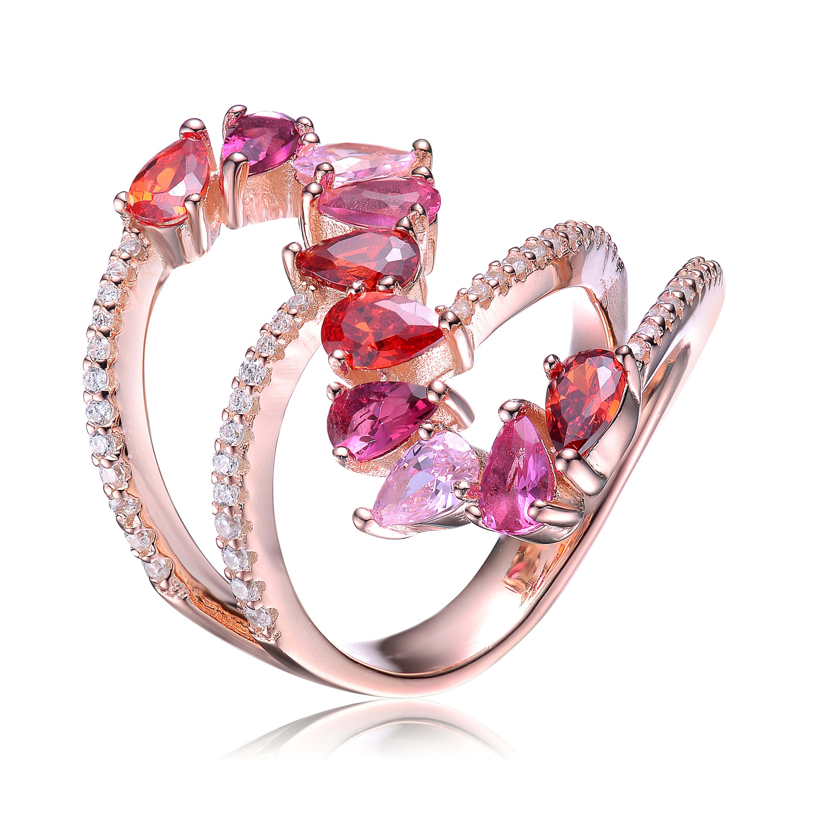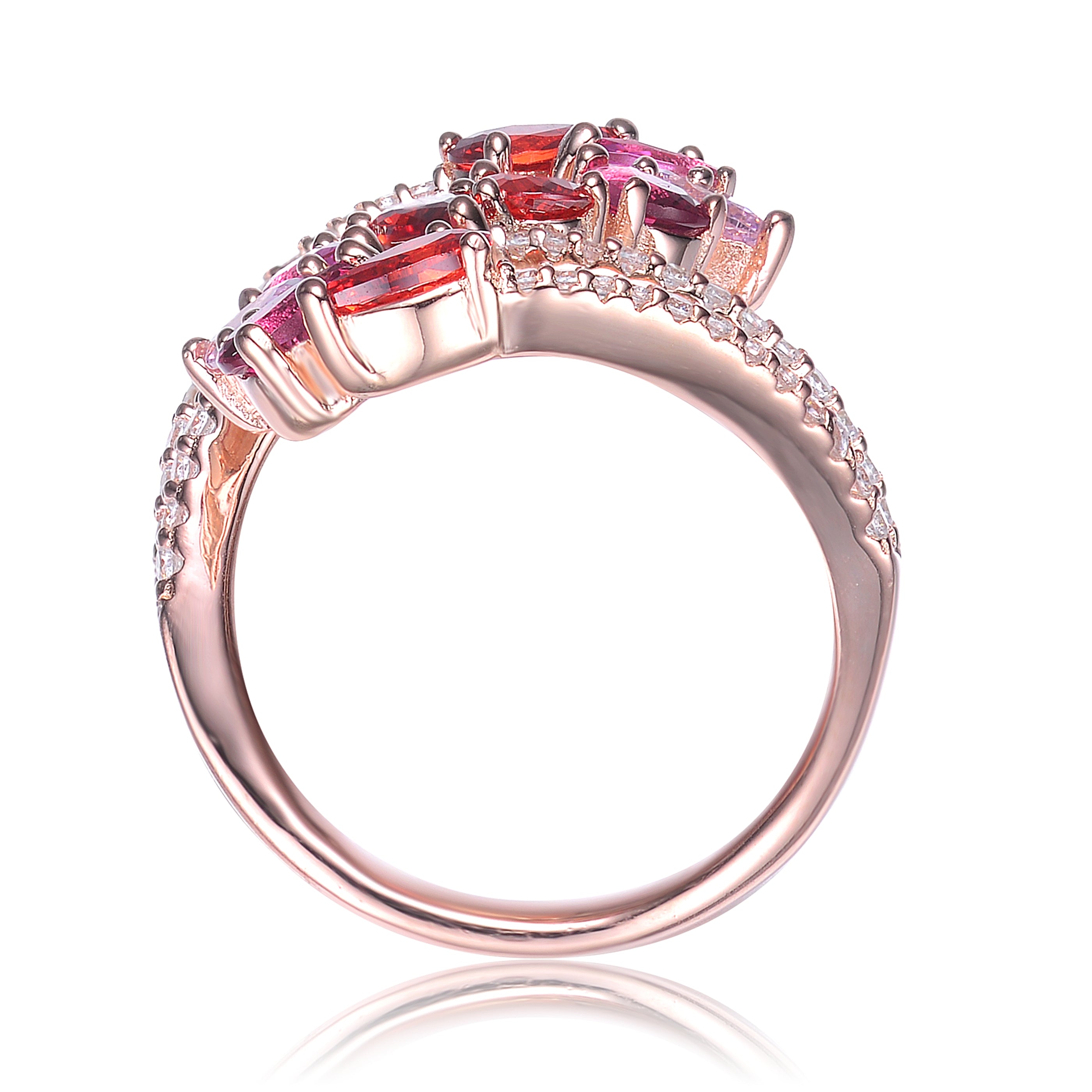 This unique and gorgeous bypass ring can add a pop of color to your look. This ring features pear Cubic Zirconia in variant red color that is accentuated with clear round Cubic Zirconia along the rings' split shank. This ring is set in Sterling silver with Rose Gold plated and has a size 6 band. This piece can easily be paired with any ensemble with its simple yet stunning design.
