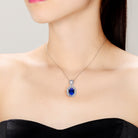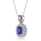 Fall in love with this beautiful and timeless pendant. It features a clear pear Cubic Zirconia on top of the pendant with an exquisite Sapphire blue oval Cubic Zirconia solitaire surrounded by smaller clear round Cubic Zirconias. It has a spring ring clasp to secure it around your neck.