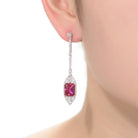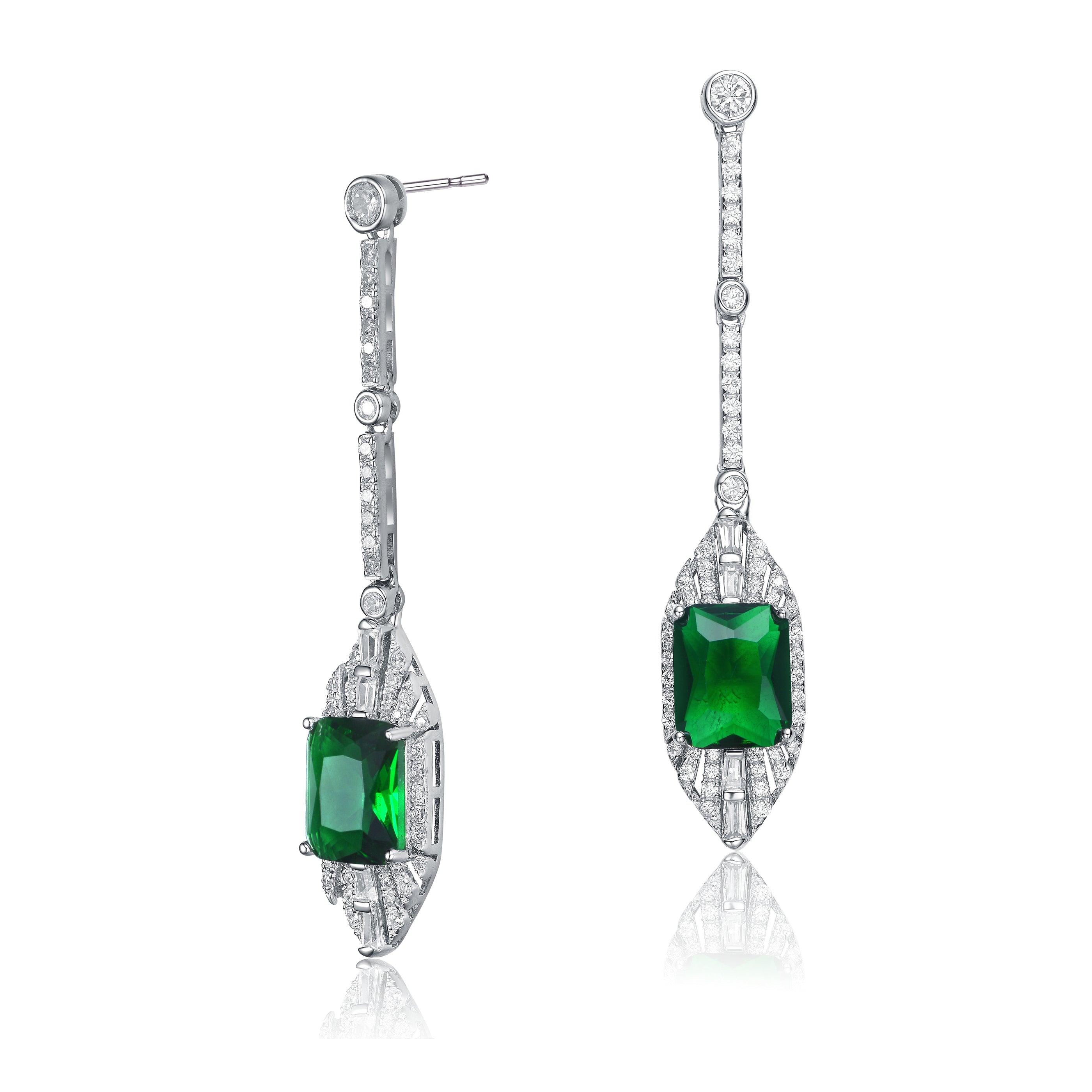 Stylish Sterling Silver with Rhodium Plated Drop Earrings. These earrings feature large radiant Sapphire Blue Cubic Zirconia stone on the bottom, set in the center of the metal frame. It is accented by two clear trapped baguette and clear round Cubic Zirconia stones set above and below. The upper part is decorated with small clear round Cubic Zirconia stones set linearly. Crafted in Sterling silver with Rhodium plated and secure with butterfly clasp. Add an additional style to your look everytime you wear these earrings. Availabe in multiple stone colors.
