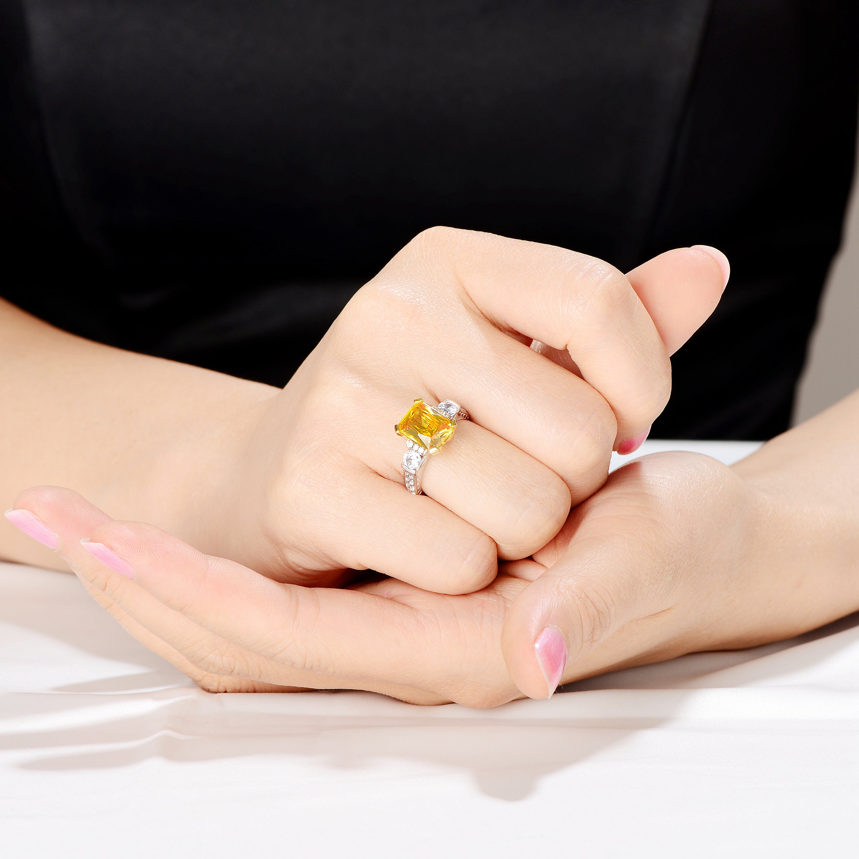 A handsome double of band of cubic zirconia stones is featured in this sterling silver ring. The divine brilliant cut yellow cubic zirconia solitaire makes this ring the perfect gift for any occasion.