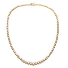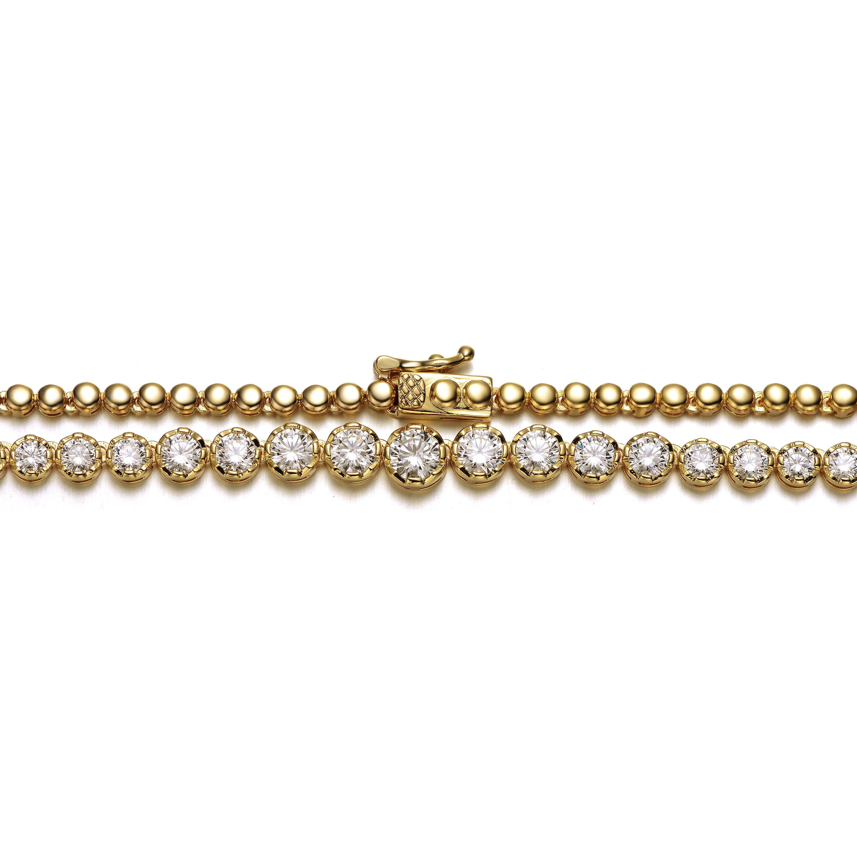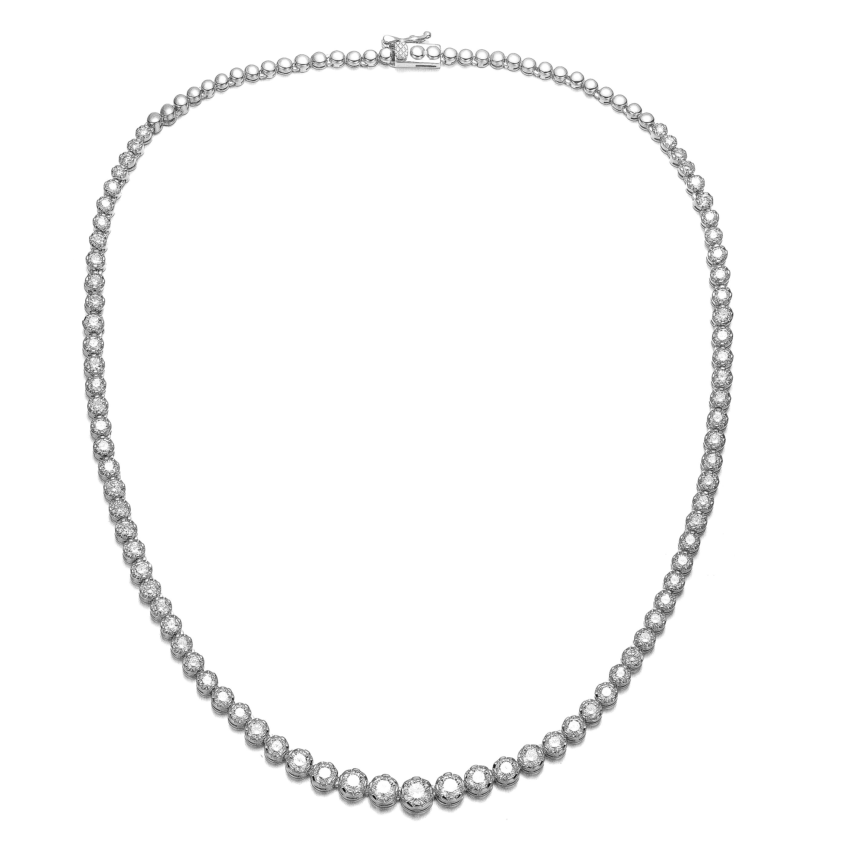 White Gold Plated with Cubic Zirconia Graduated-Size Tennis Chain Anniversary Necklace. Make romantic memories last every day by gifting this elegant white gold or 14K Yellow Gold Plated graduated-link tennis chain necklace to your beloved. Sparkling round brilliant cut cubic zirconias set in round links gives this pretty tennis chain elevated modern glamor. A hidden box clasp and safety latch keeps this flat necklace secure when worn, allowing it to sit gracefully on the collarbone. Necklace measures 17" long. Available in Rhodium or 14K Yellow Gold