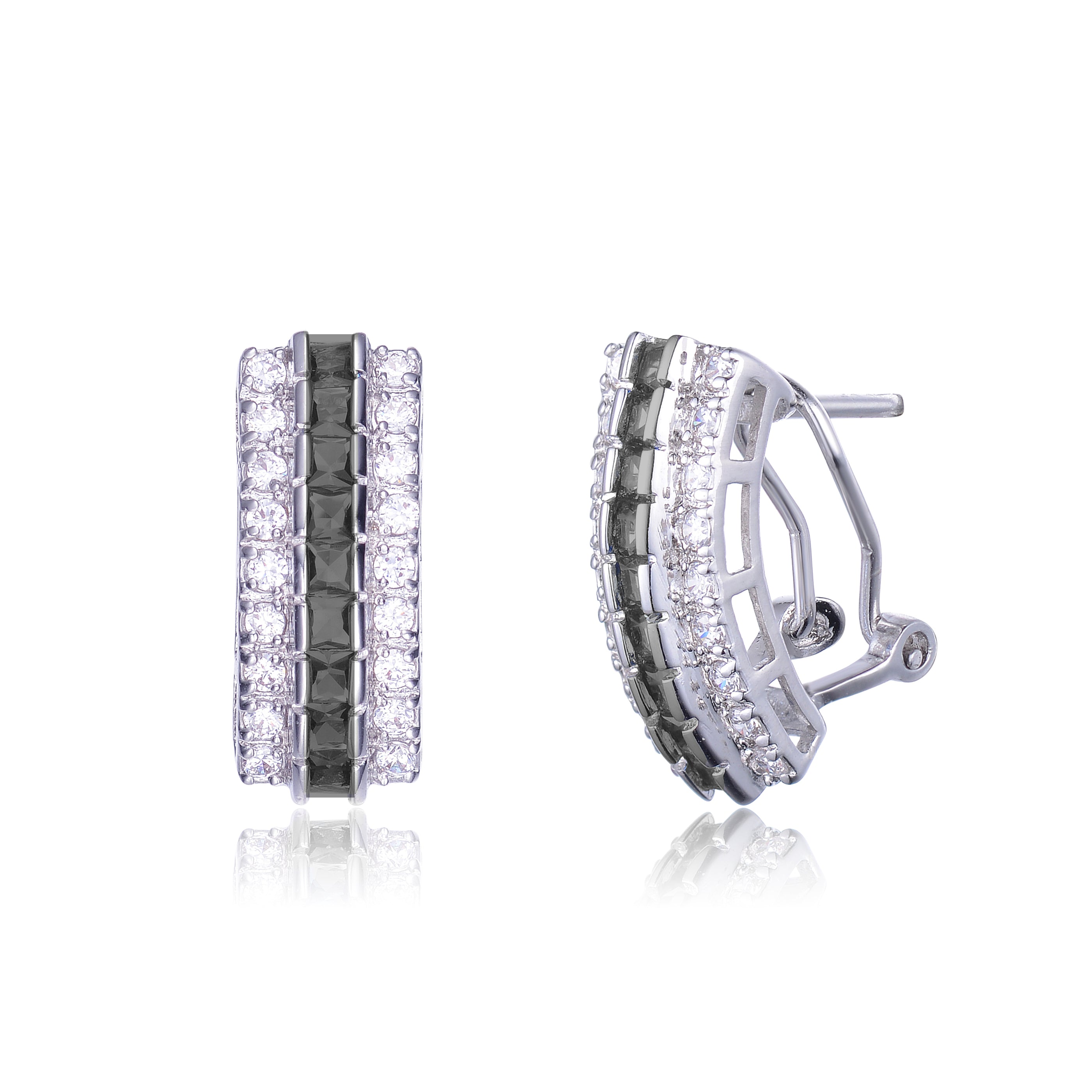 Sterling Silver Rhodium Plated Black And Cubic Zirconia Three Row Classic Earrings