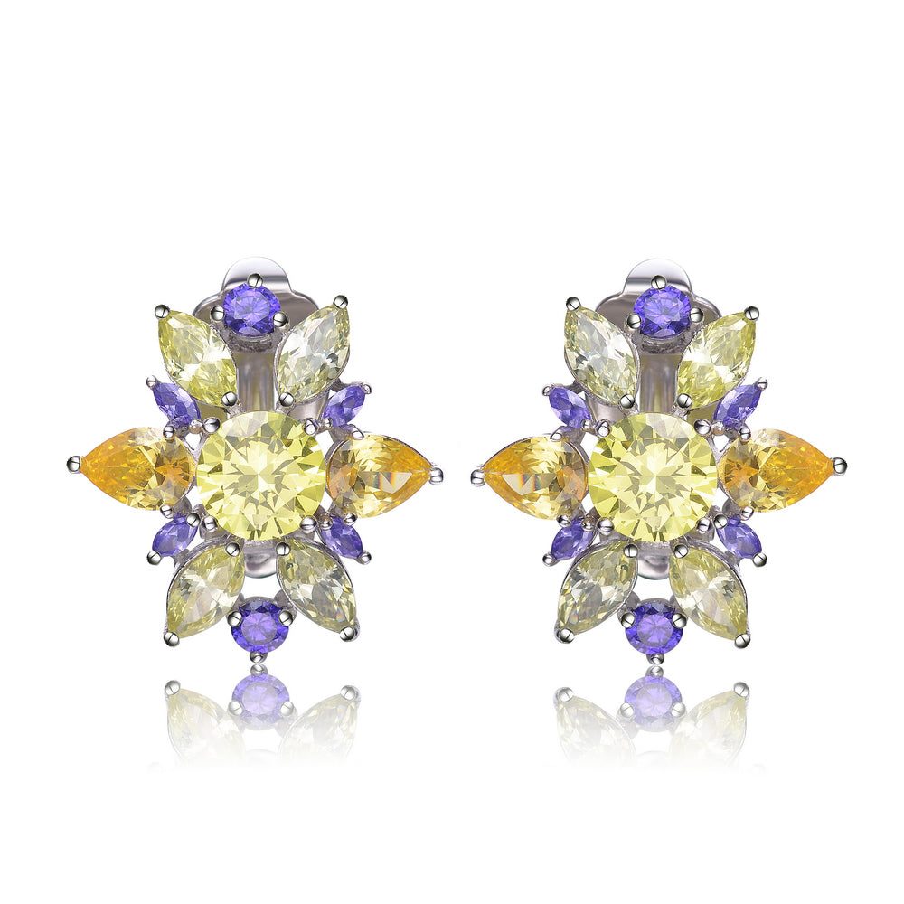 Cubic Zirconia Sterling Silver Rhodium Plated Lemon, Amethyst And Peridot Flower Earrings