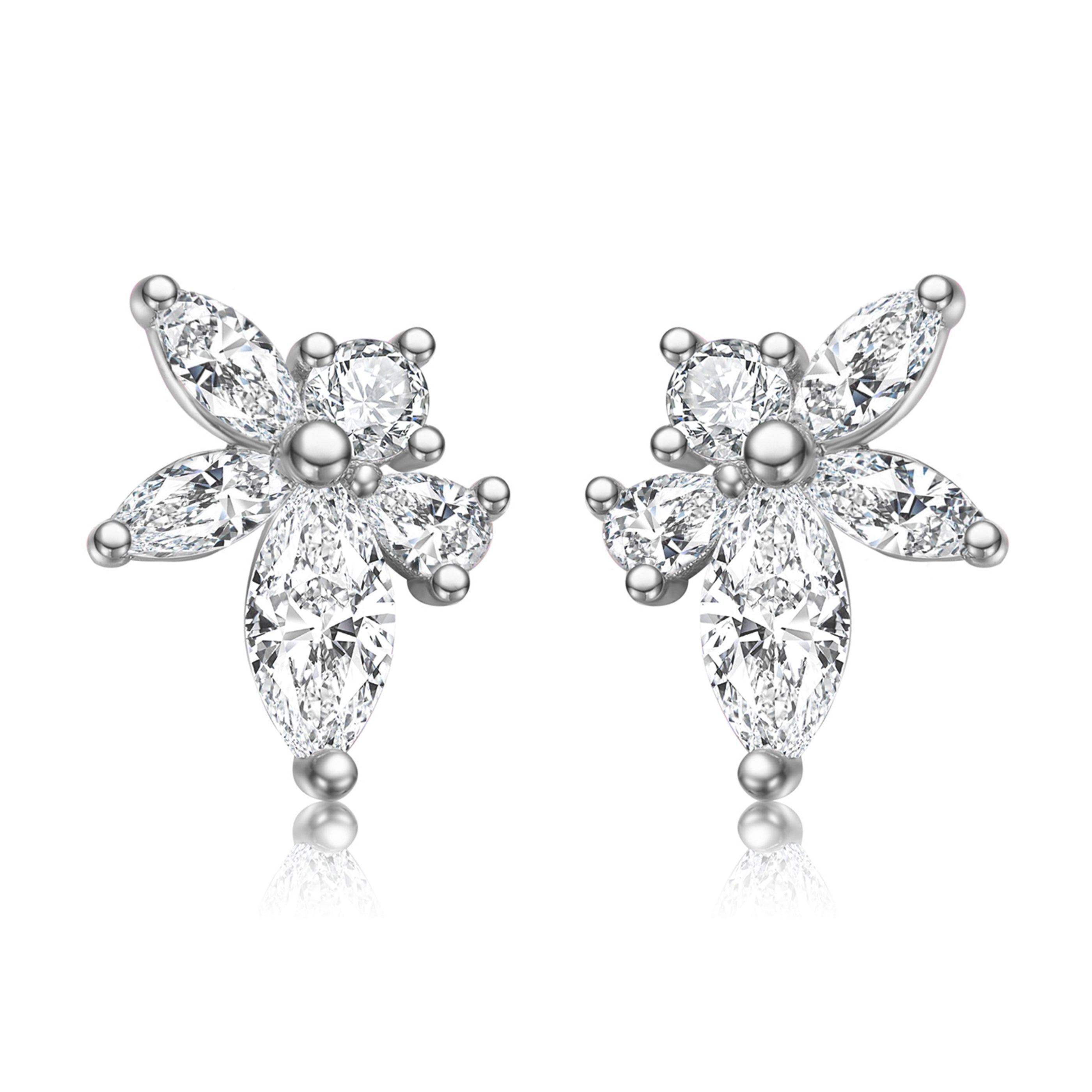 Sterling Silver White Gold Plated with Lab Created Moissanite Leaf Cluster Stud Earrings