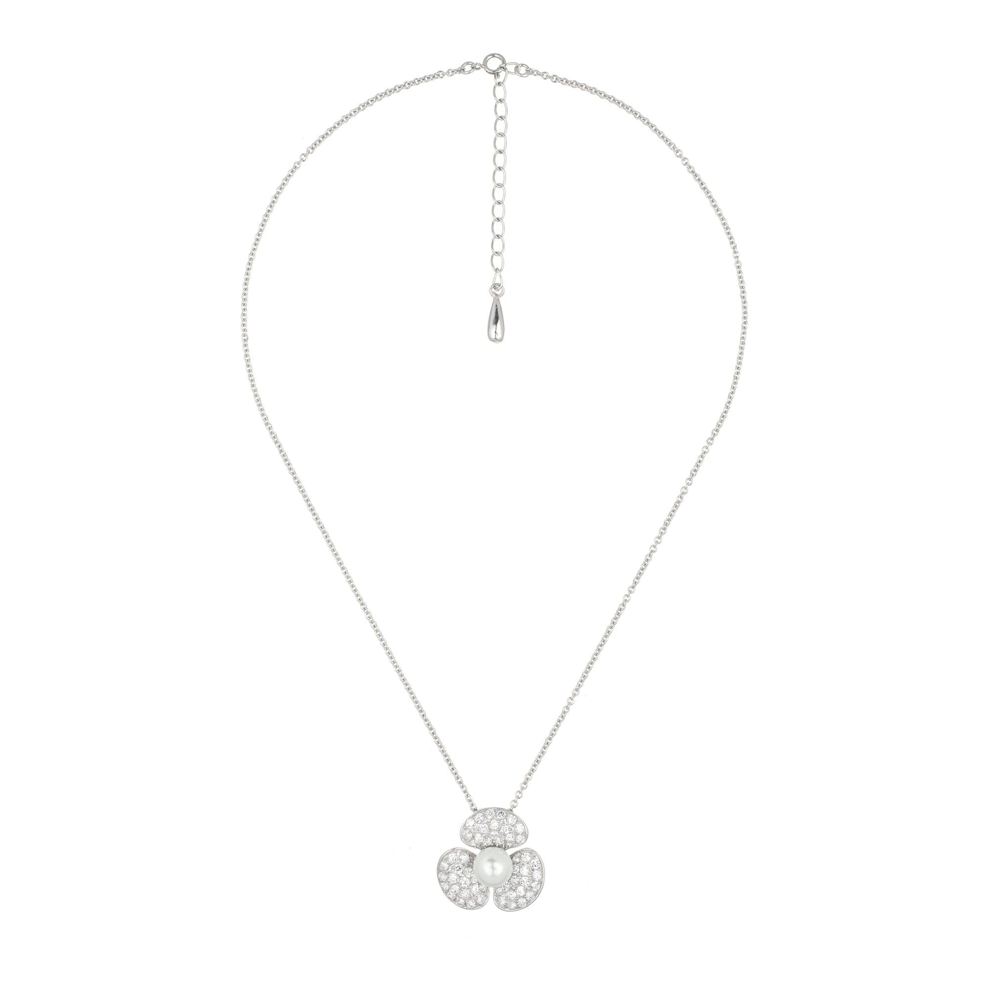 Cubic Zirconia Sterling Silver Rhodium Plated Mother Of Pearl Round Flower Pendant