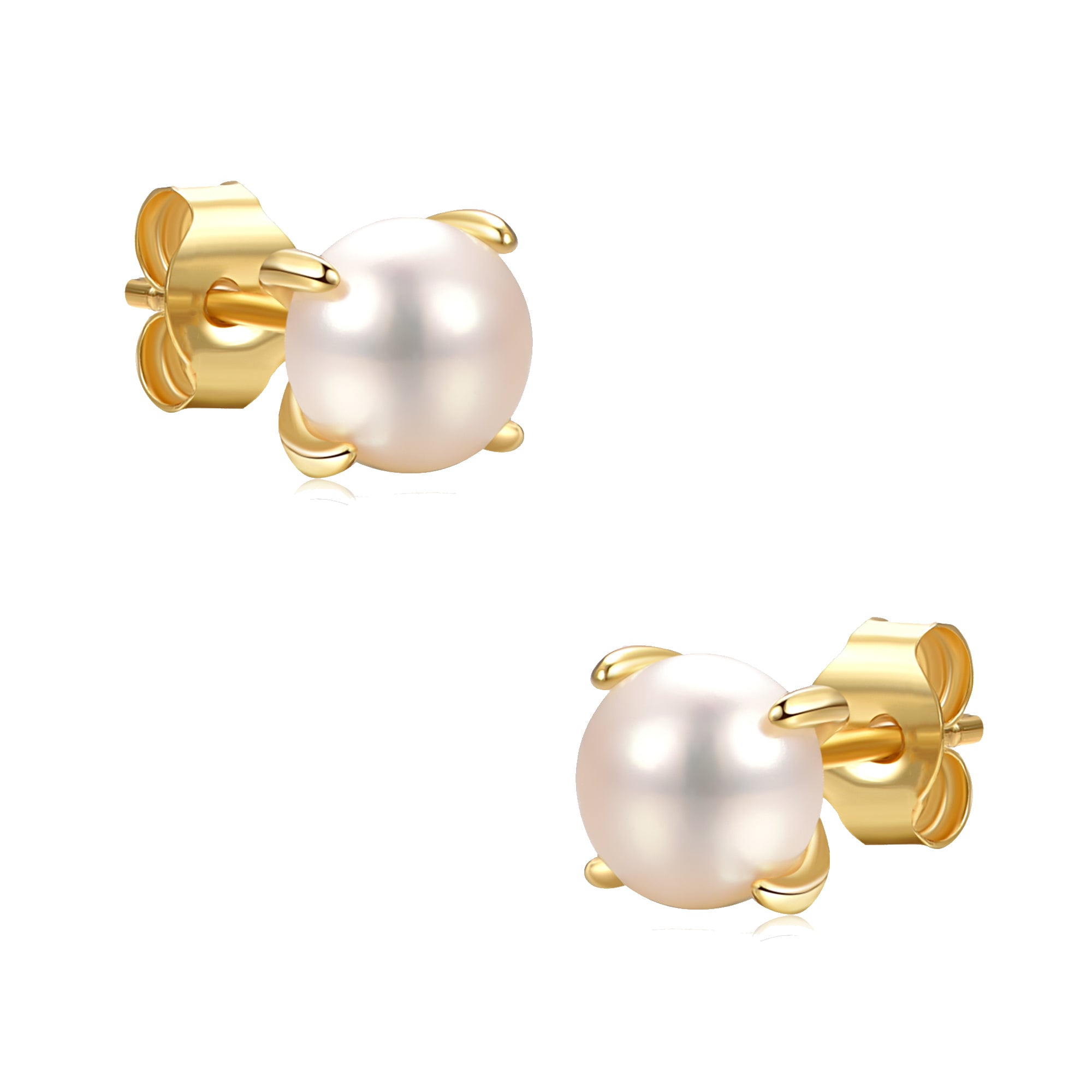 14k Gold Plated with 6mm Round White Genuine Freshwater Pearl Solitaire Stud Earrings in Sterling Silver
