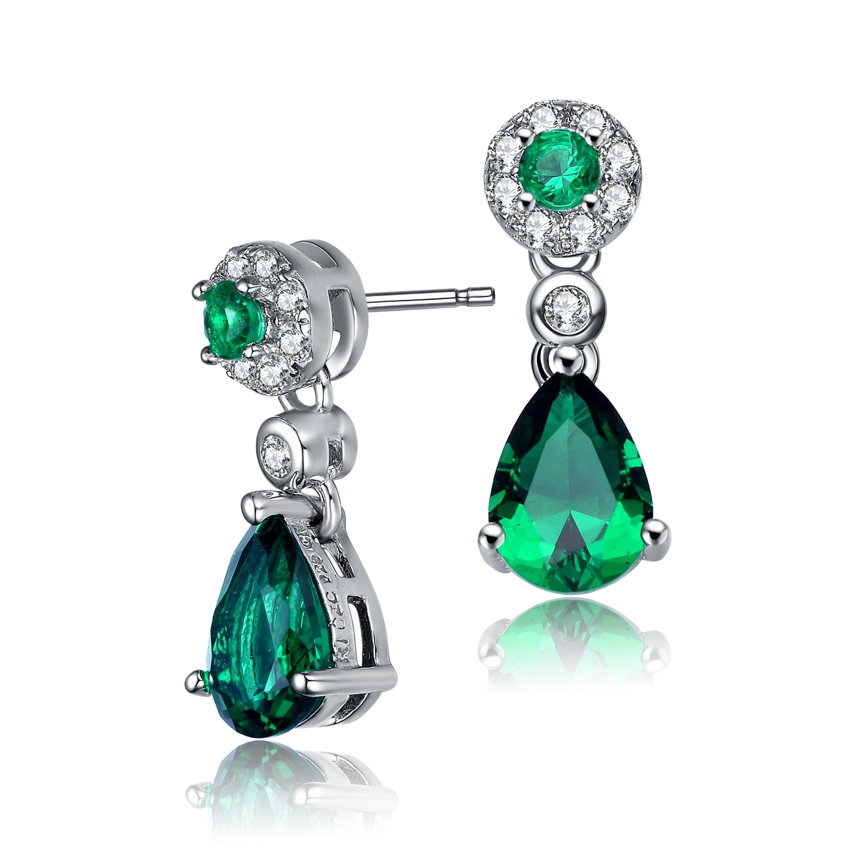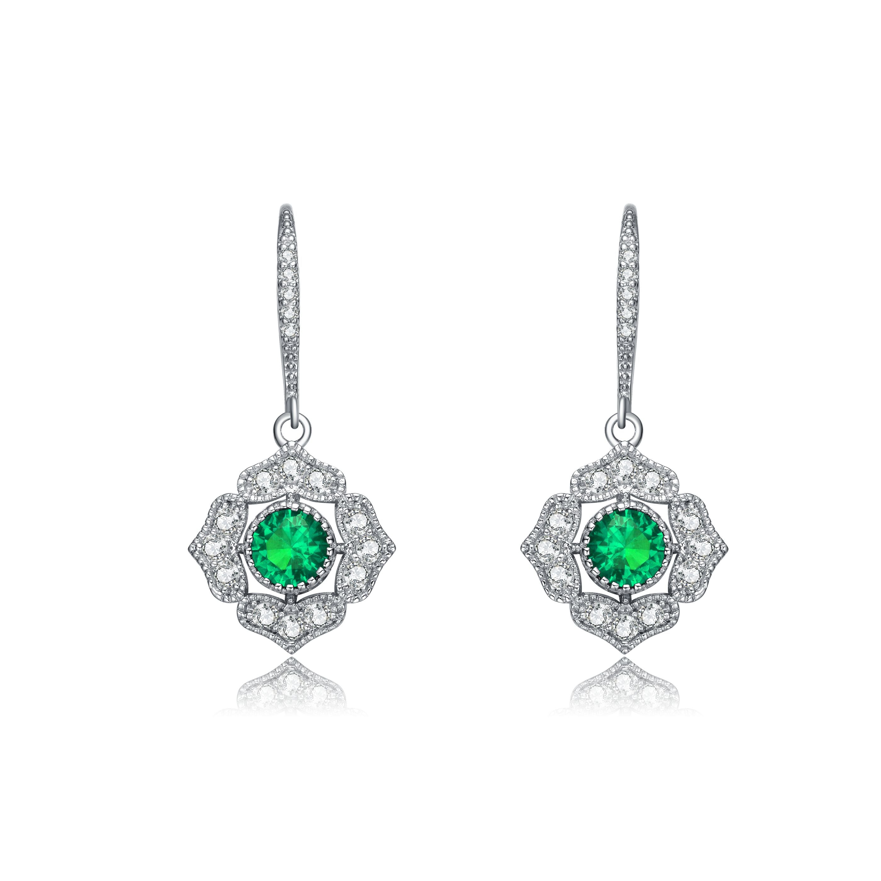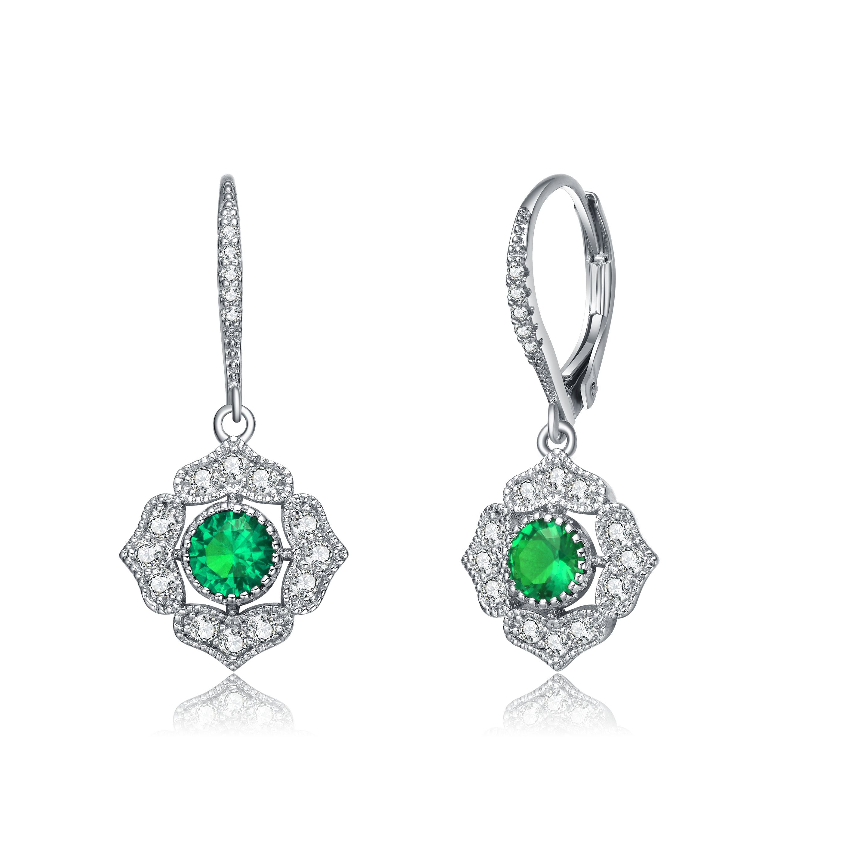 C.Z. Sterling Silver Rhodium Plated Round Emerald Earrings