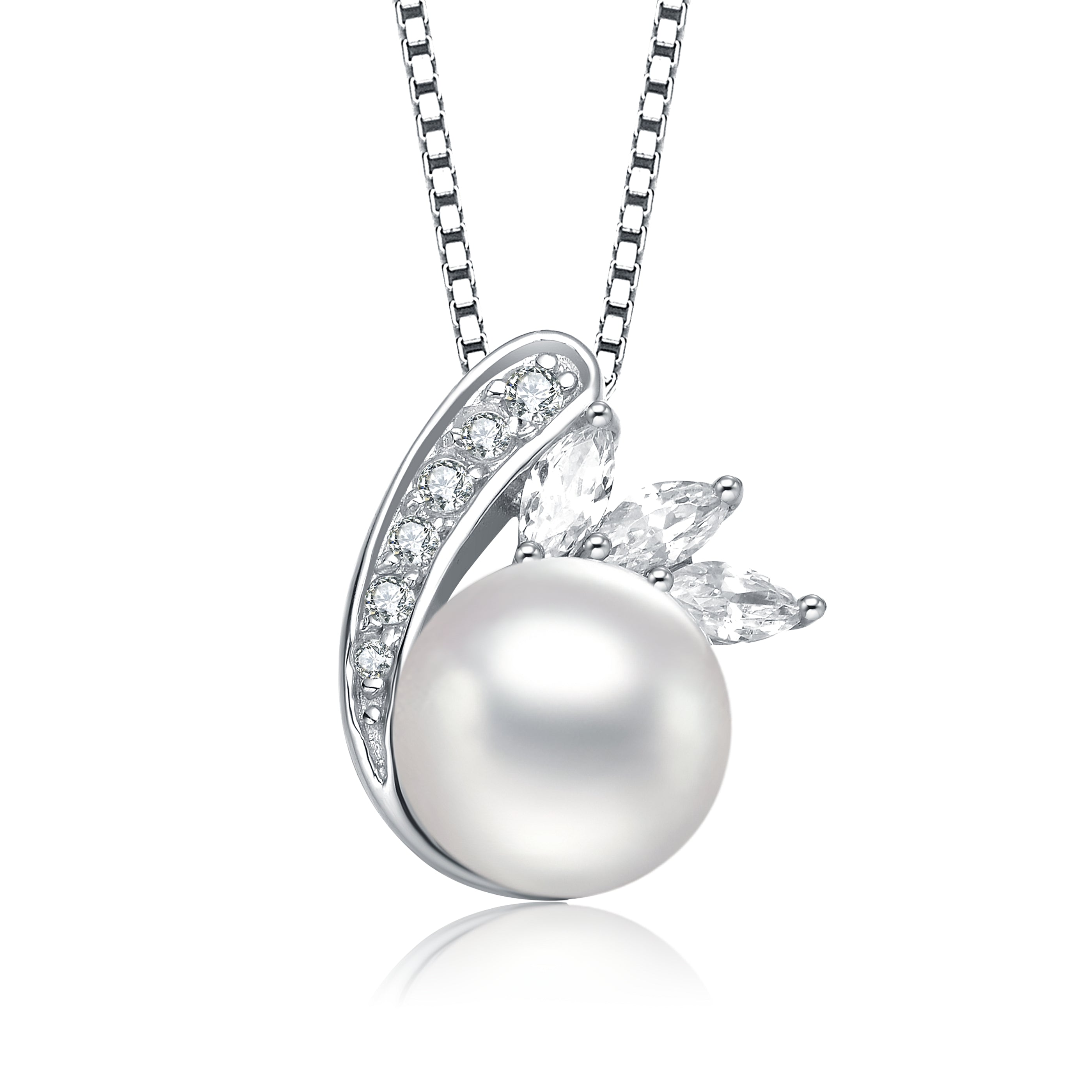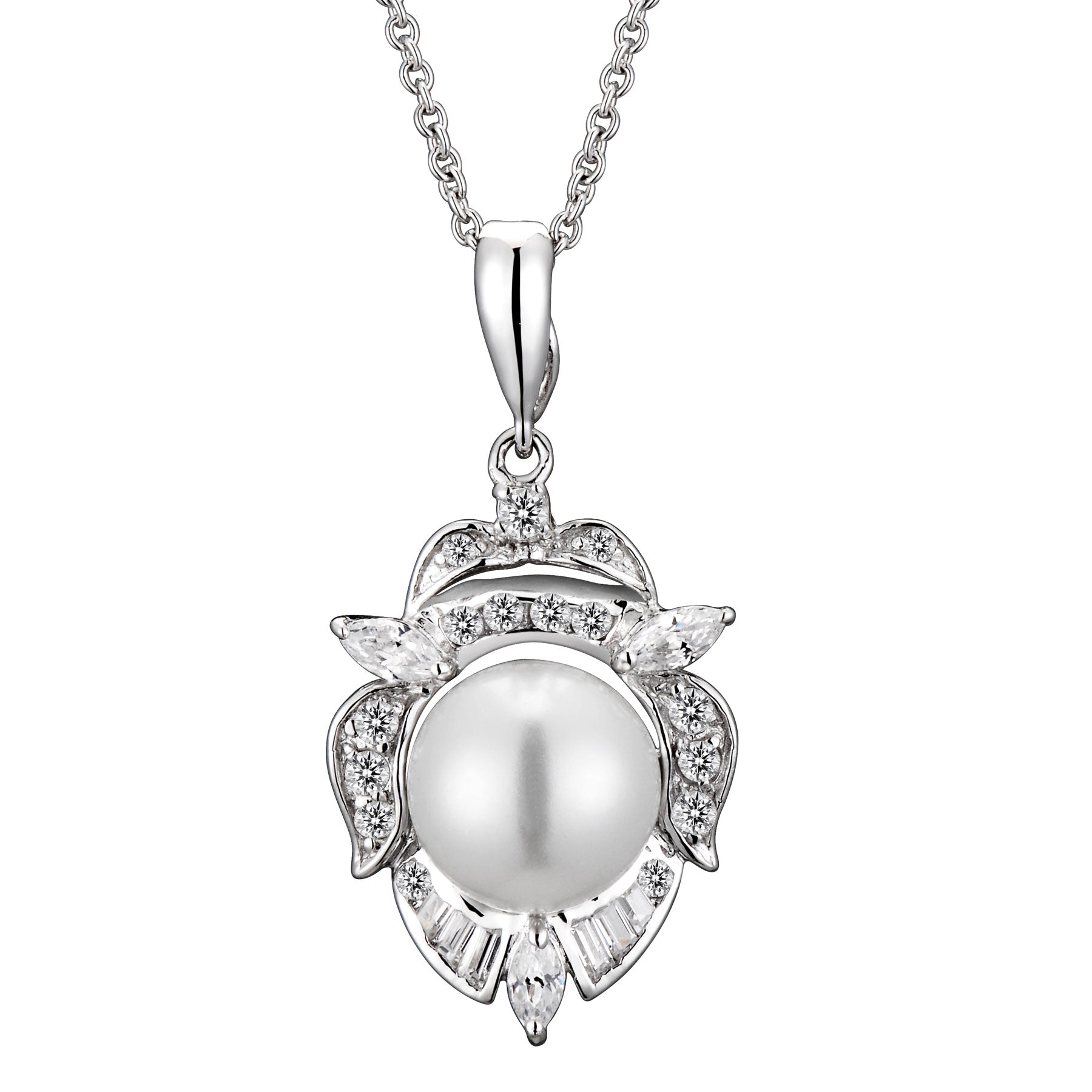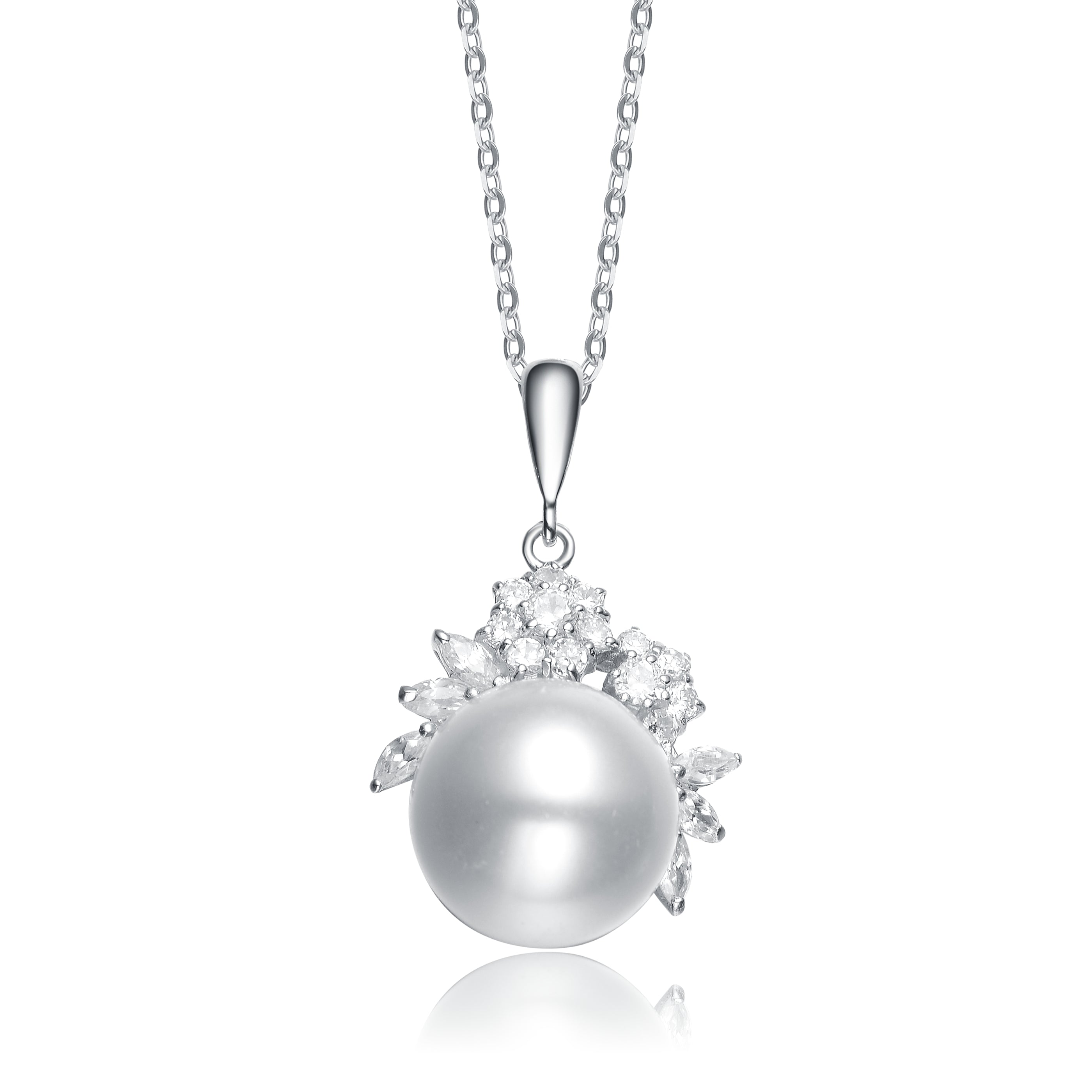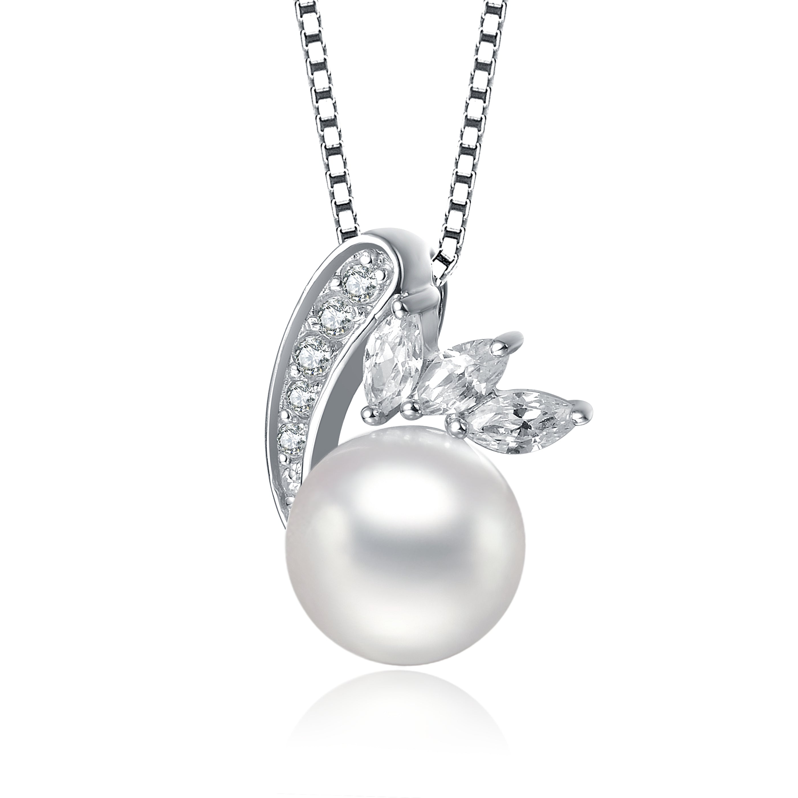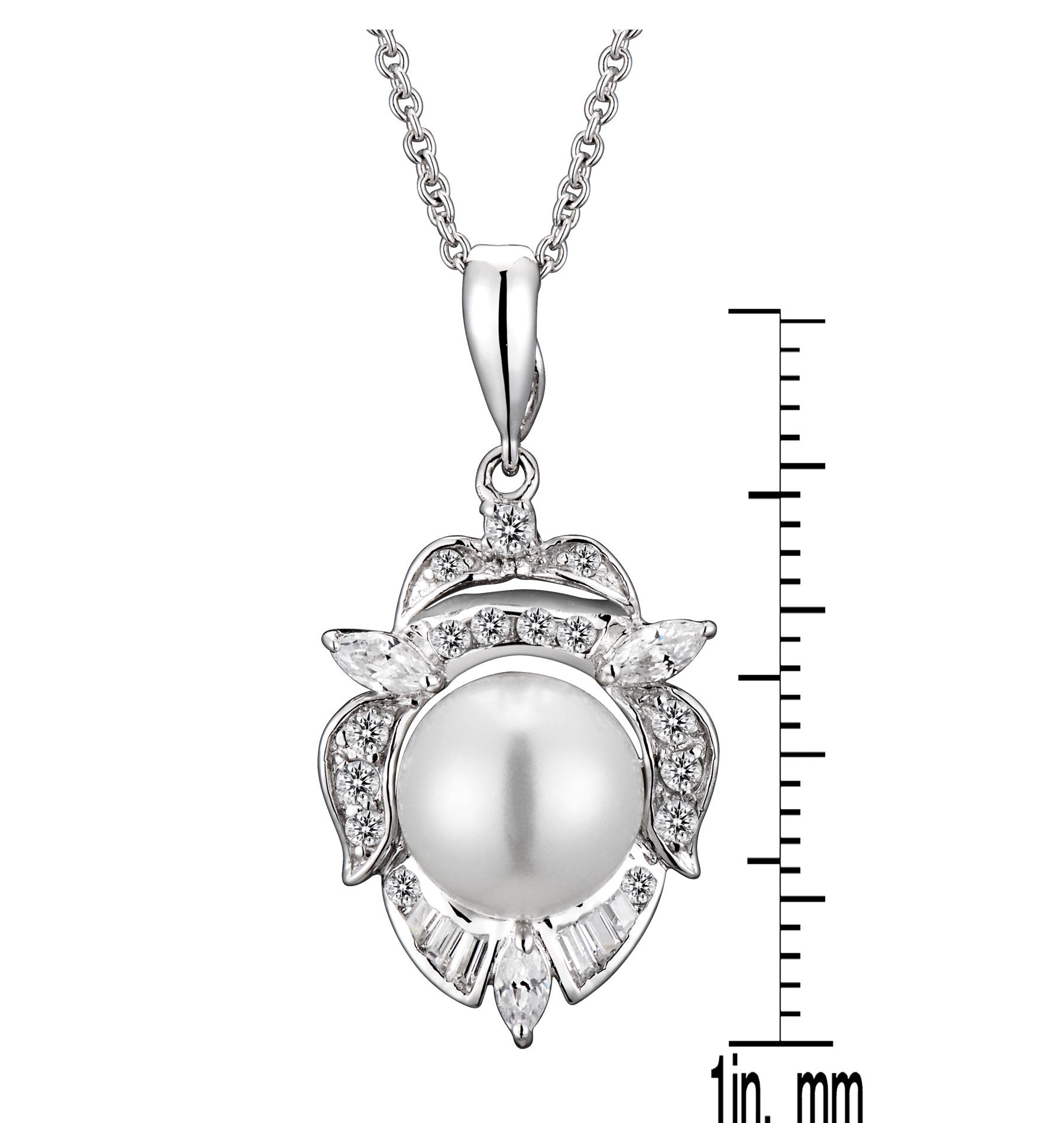 Sterling Silver Pearl and Cubic Zirconia Leaf-Inspired Pendant