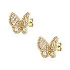 Add another level of joy and happiness to your accessory collection with these butterfly stud earrings. Baguette and round brilliant cut cubic zirconias are prongs set in glittering clusters, giving them glamor. These beautiful butterflies are crafted in 14k yellow gold plated sterling silver with a rich shine, finished with butterfly post backs to keep them secure.