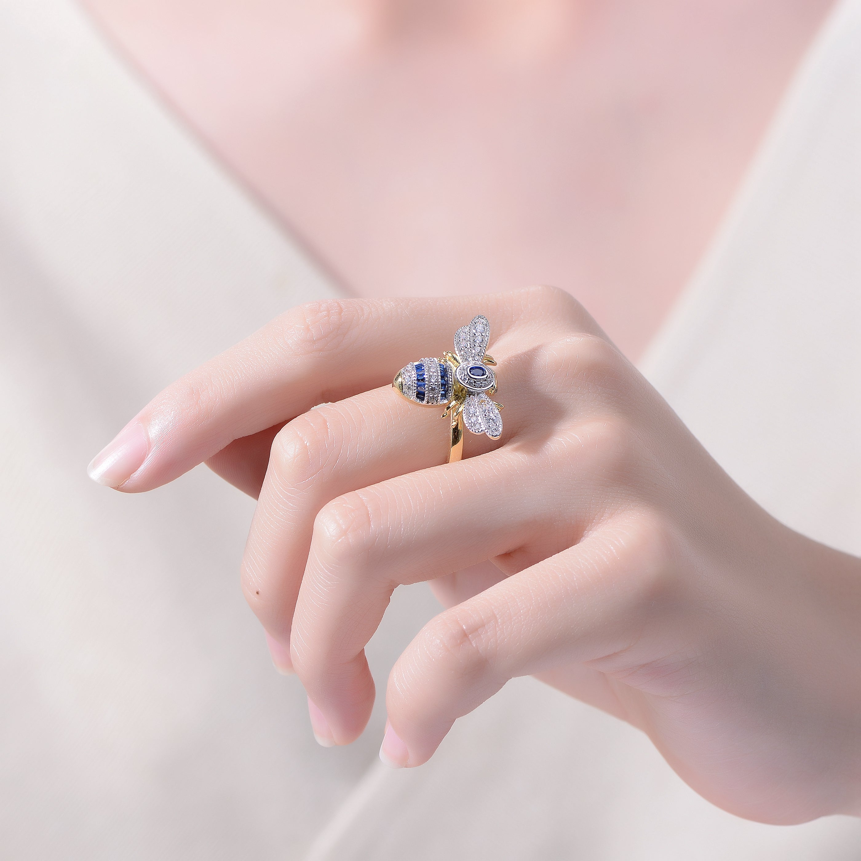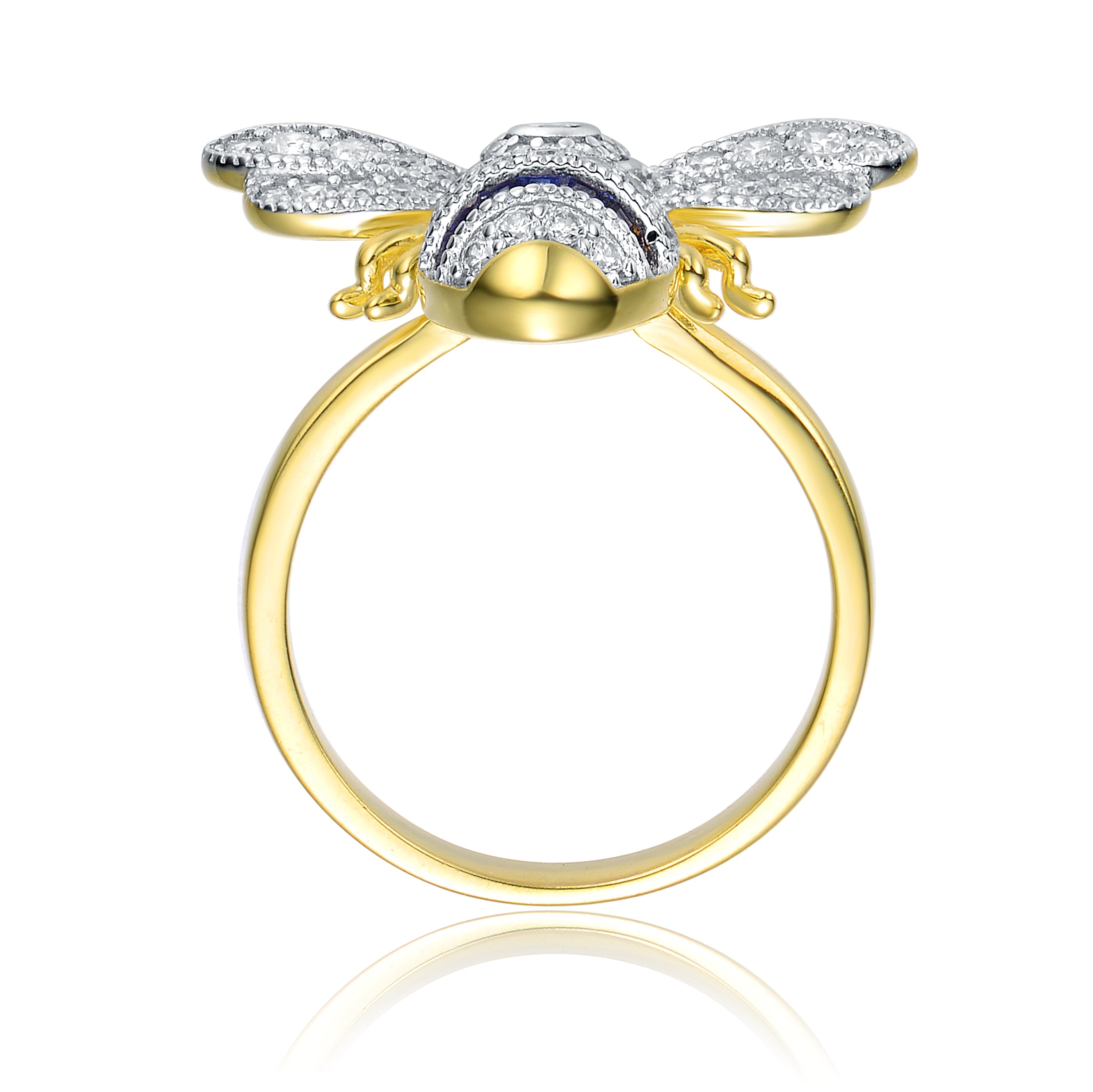 This bold wasp-inspired ring delivers playful character with luxurious detailing. Crafted from sterling silver and finished in rich 14K yellow gold plating, the sculptural design stands out instantly. Sapphire-toned cubic zirconia stones are pavé set, adding vibrant sparkle to the wings. The polished finish enhances the ring’s dimensional form. Designed to make a statement, it works beautifully as a focal piece. A distinctive ring that blends whimsy, glamour, and craftsmanship.