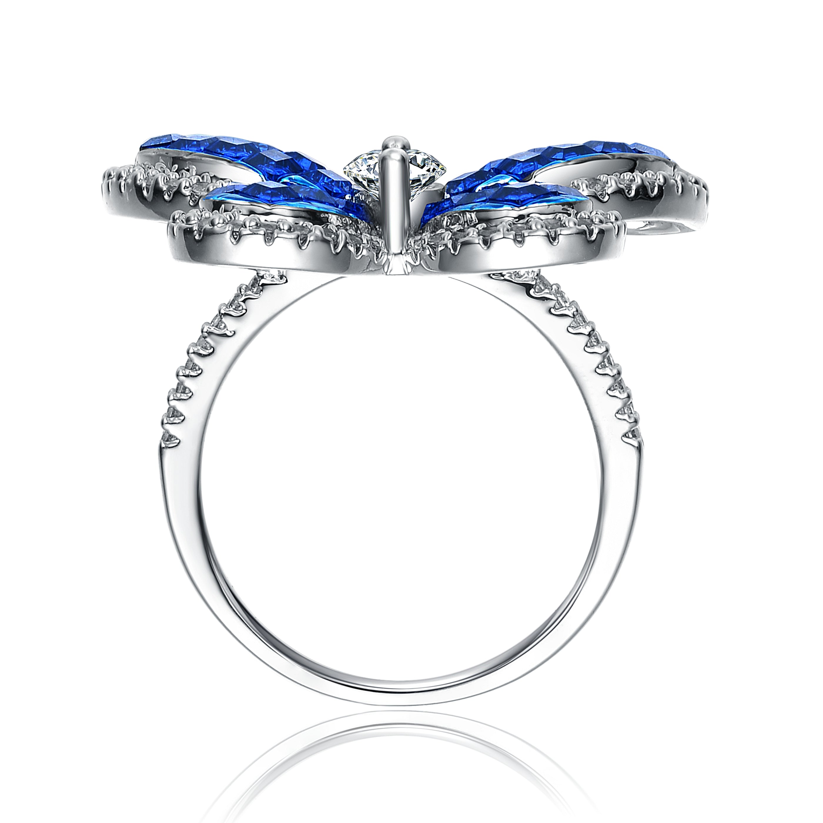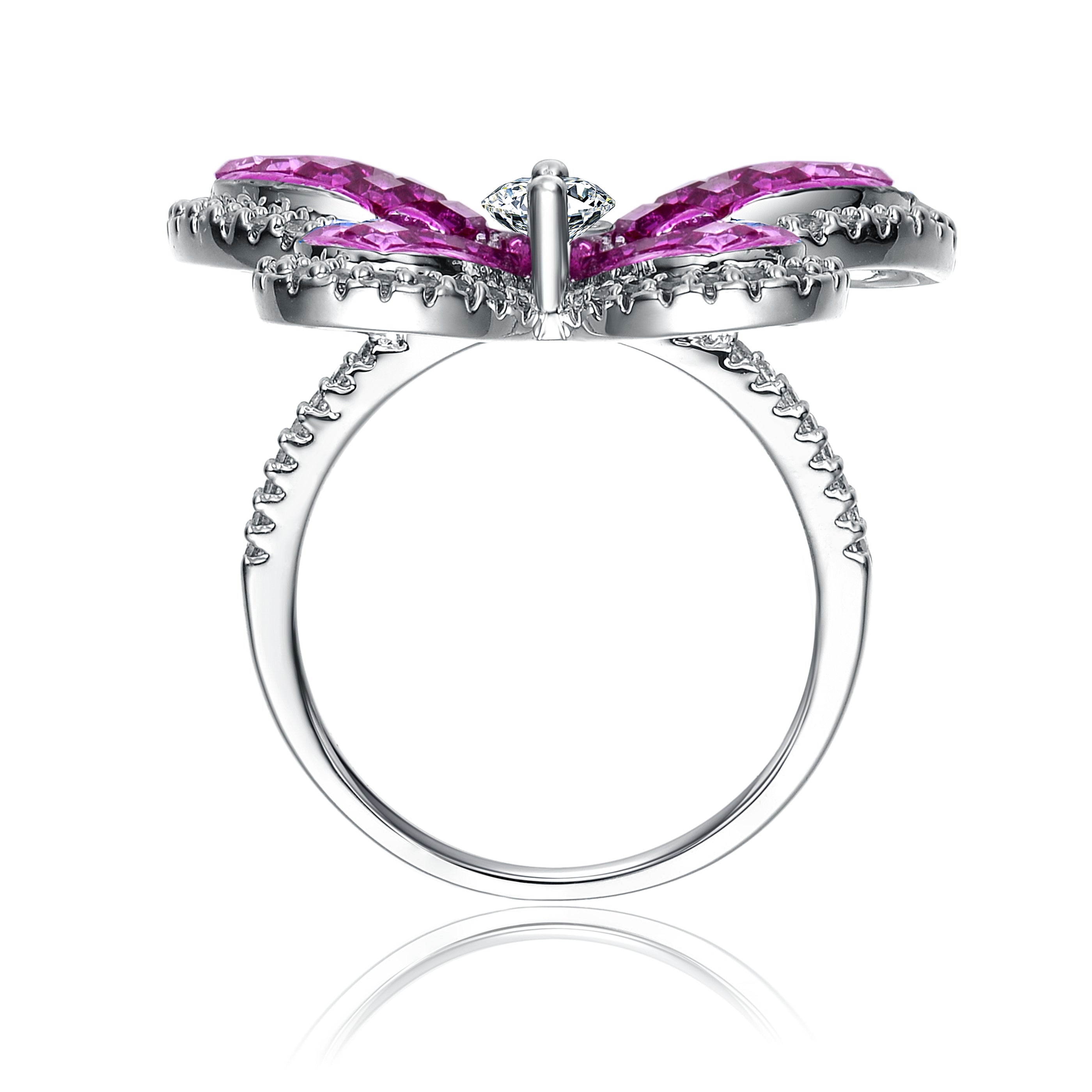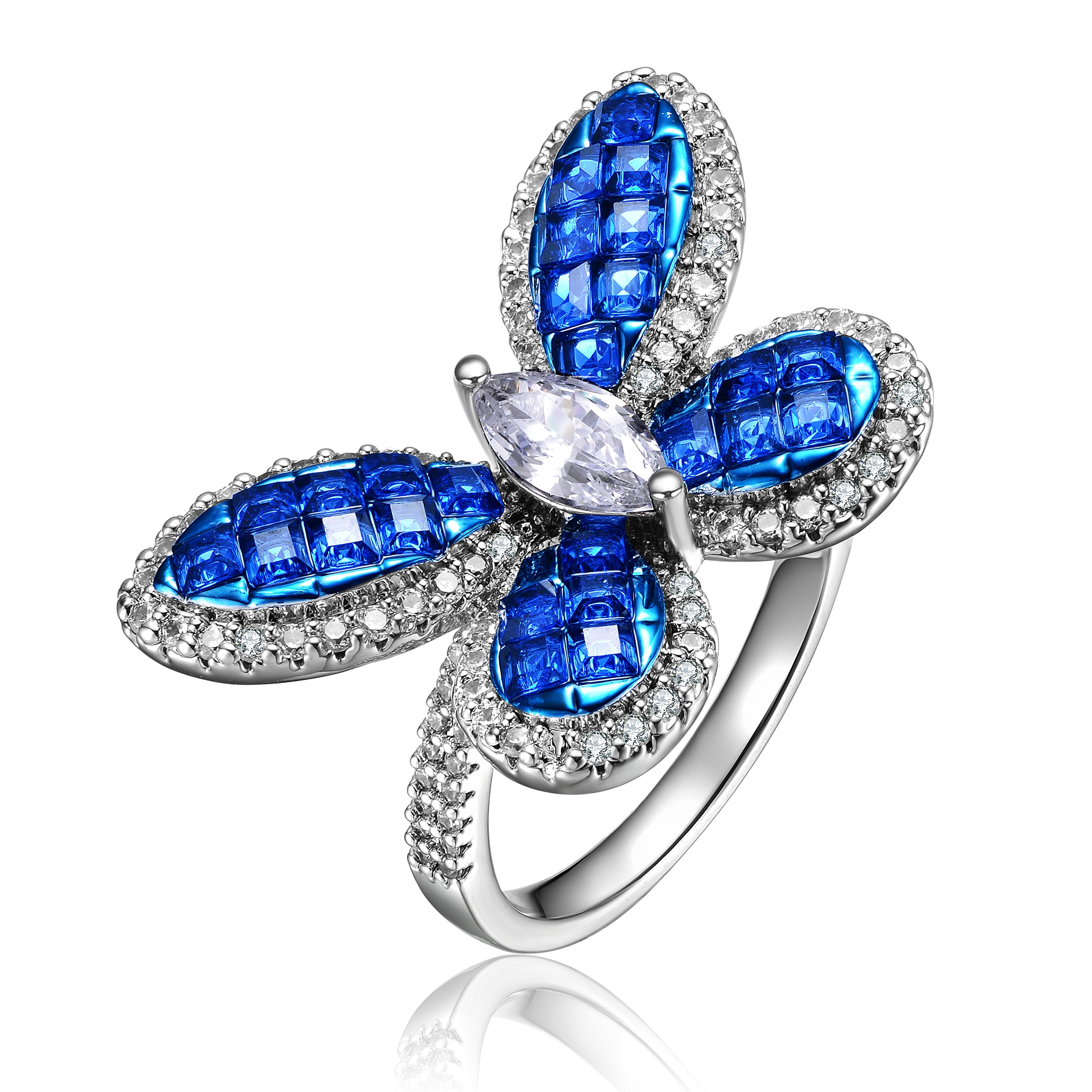 This elegant butterfly ring is crafted from sterling silver with a sleek rhodium-plated finish, offering a refined and polished look. The butterfly silhouette is brought to life with vibrant, princess-cut cubic zirconia stones forming the wings, complemented by marquise and round clear cubic zirconia accents at the center. A delicate pavé of smaller clear stones outlines the frame, adding extra sparkle and dimension to this eye-catching design.