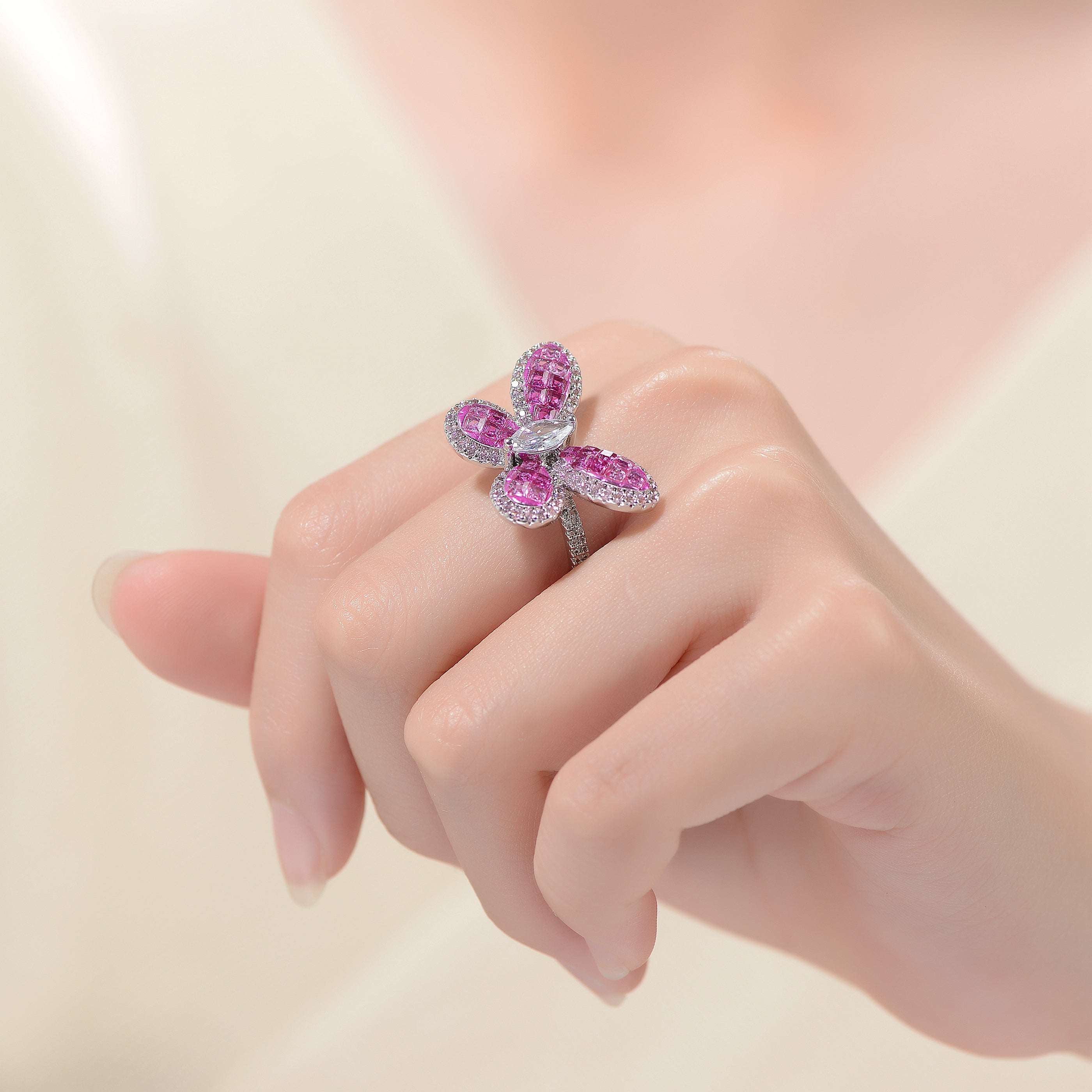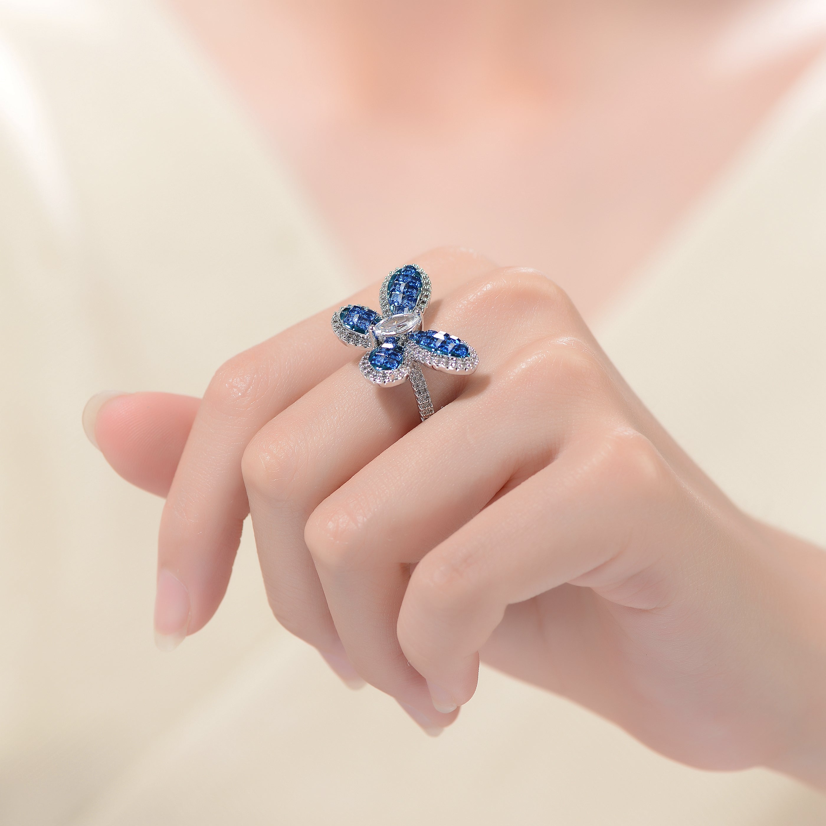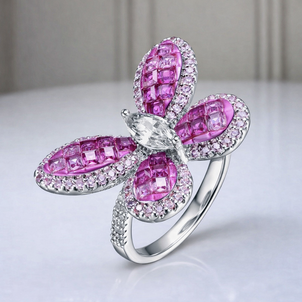 This elegant butterfly ring is crafted from sterling silver with a sleek rhodium-plated finish, offering a refined and polished look. The butterfly silhouette is brought to life with vibrant, princess-cut cubic zirconia stones forming the wings, complemented by marquise and round clear cubic zirconia accents at the center. A delicate pavé of smaller clear stones outlines the frame, adding extra sparkle and dimension to this eye-catching design.
