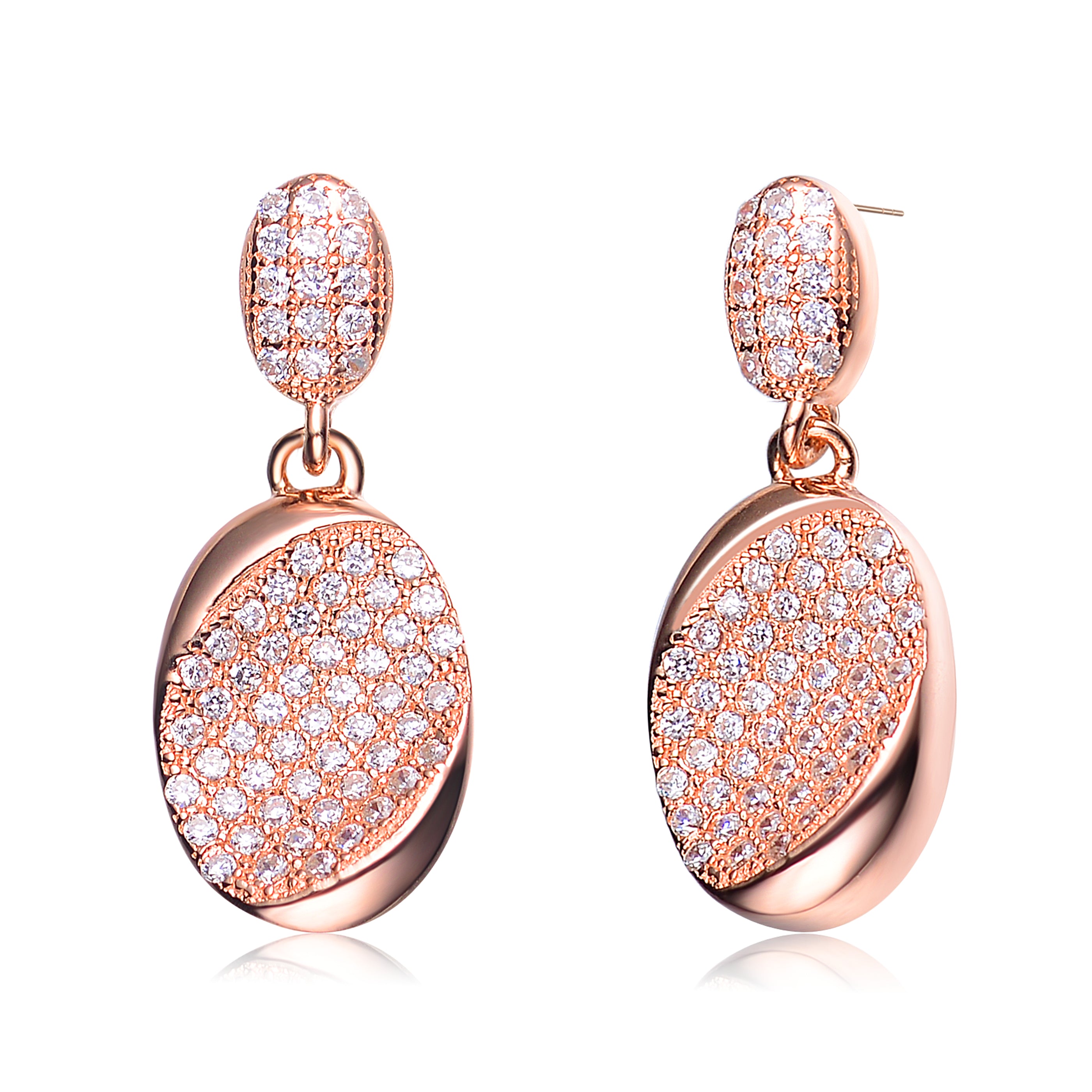 Pave clear cubic zirconia stones are carefully placed into 18K Rose Gold Plated overlay that it shaped into an oval in this set of earrings. The dangle earrings are elegant to the core.