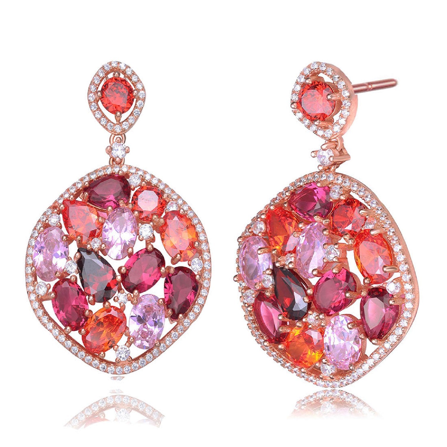 Elegant Sterling Silver with Rose Gold Plated and Ruby Cubic Zirconia Dangle Earrings. These earrings feature interesting colorful design that consists of ruby red, orange, pink and red, in oval, round and pear cut cubic zirconia stones set in prong in the center of the frame, accented with small clear round cubic zirconia stones on the outter part paved on the frame, and large red round cubic zirconia stone on the top, where it continues to the post. Crafted of Sterling Silver with Rose Gold Plating and secures with butterfly closure. Makes a great gift as well.