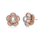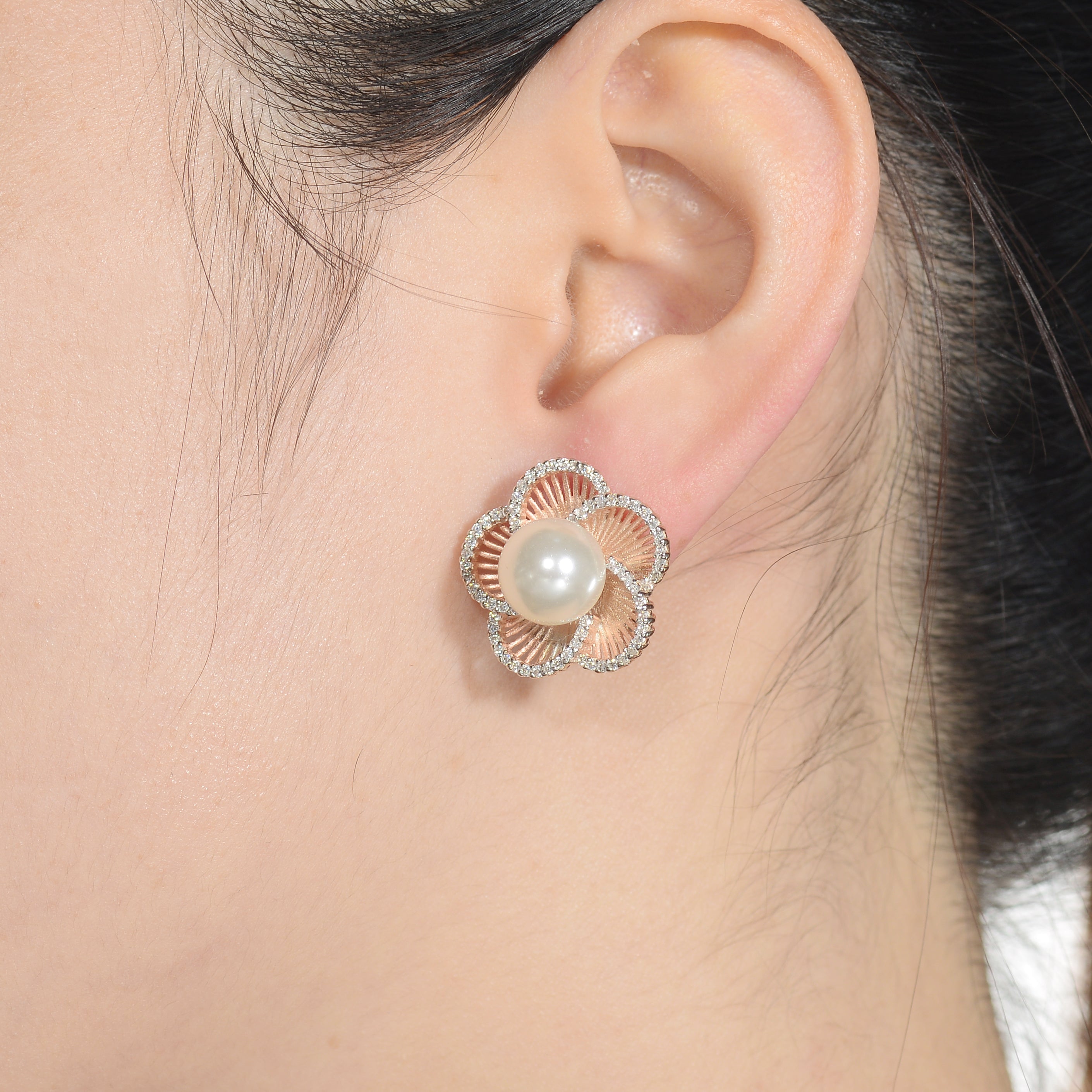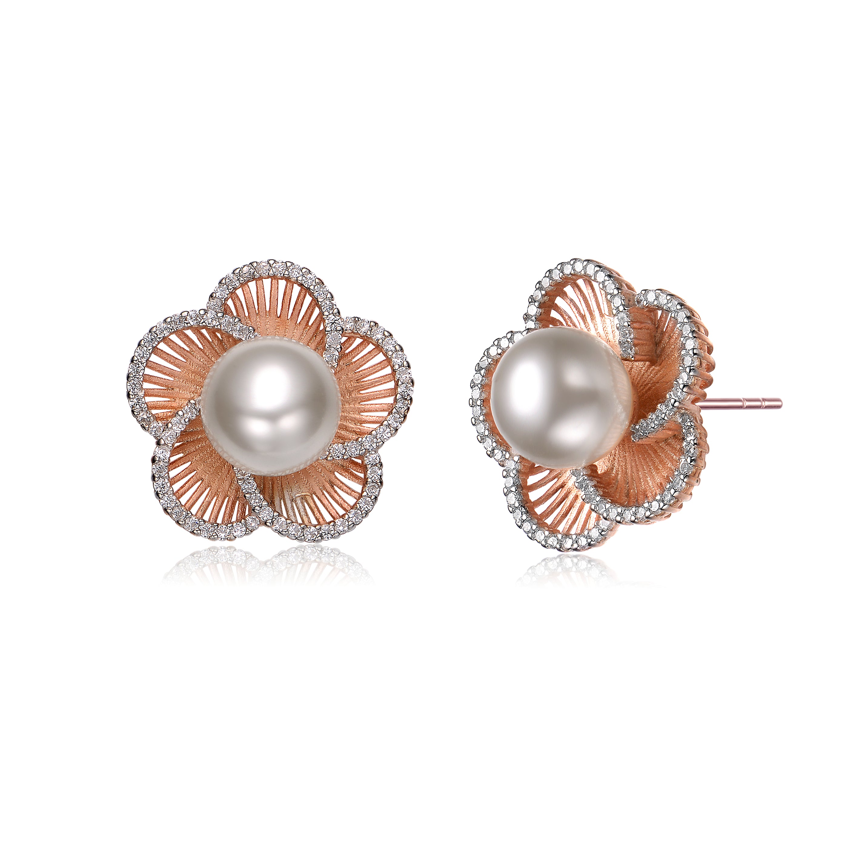 Flower design 18K Rose Gold Plated .925 sterling silver earrings with a centerpiece of a white cubic zirconia stone, a traditional look but gives out a radiance brought to us by the cubic zirconia and class of the 18K Rose Gold Plated sterling silver.