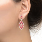 Beautifully crafted features unique design with purple cubic zirconia placed inside and paved clear gemstones in the layer. These dangle earrings are made from .925 sterling silver plated with 18K Rose Gold Plated and secured with butterfly clasp.