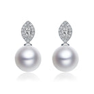 Simple and classic pearl earrings. These earrings feature white pearl and are accentuated with clear marquise cubic zirconia stone haloed with clear round cubic zirconia to create the earrings post. Crafted of .925 Sterling silver with rhodium plated and secure with butterfly clasp.