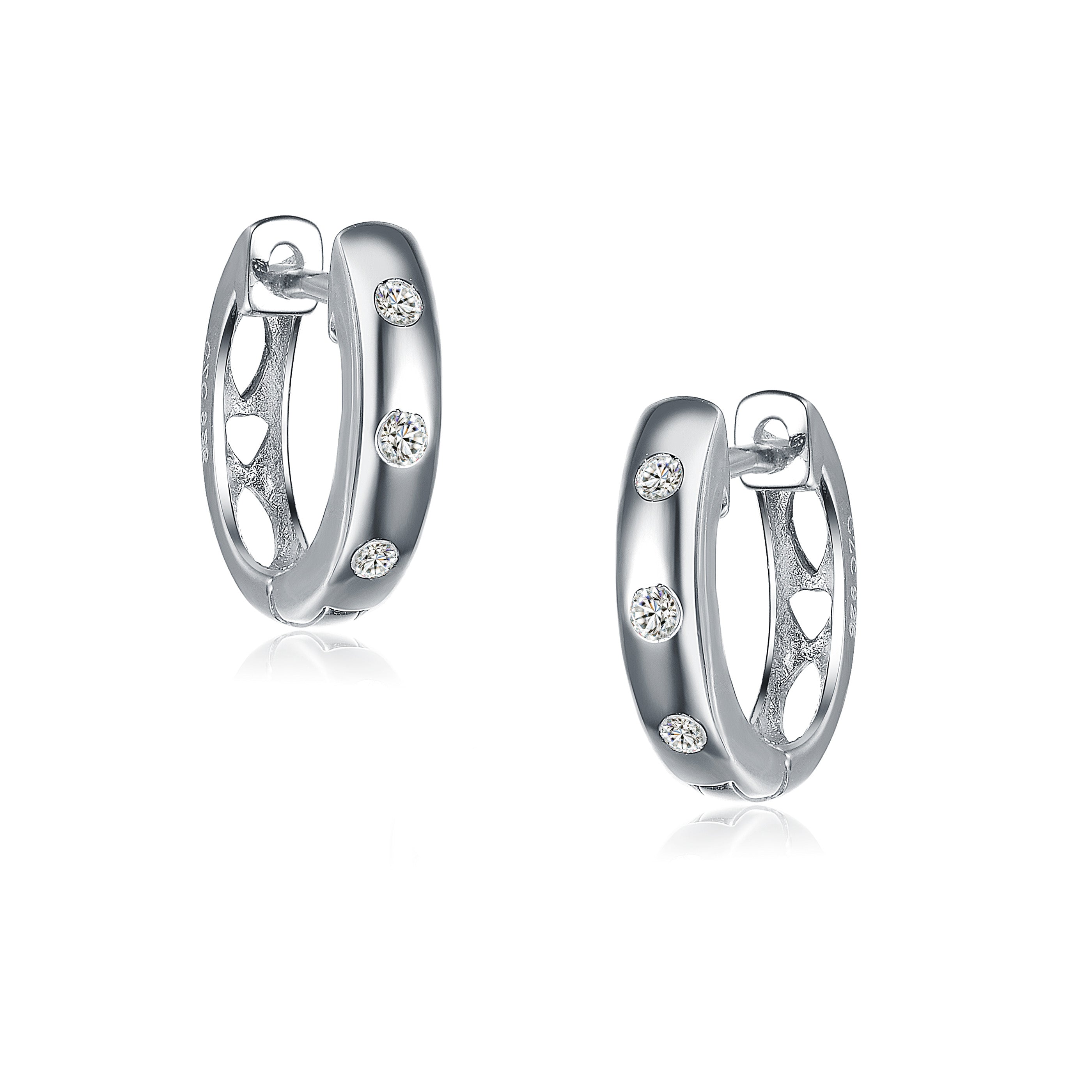 These mini hoop earrings showcase white round-cut cubic zirconia stones in bezel settings. Crafted of .925 sterling silver with rose plating, the earrings secure with clip-in clasps.