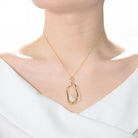 Elegant Sterling Silver with Gold Plating and Freshwater Pearl Halo Necklace. This beautiful necklace boasts of a curvy oval gold plated metal halo pendant that has a piece of Freshwater pearl that sit at the core center arc area of it. Crafted in .925 Sterling Silver, the jewelry is secured with a spring clasp. This jewelry is perfect for a formal event. It is also a great present for a special ocassion.