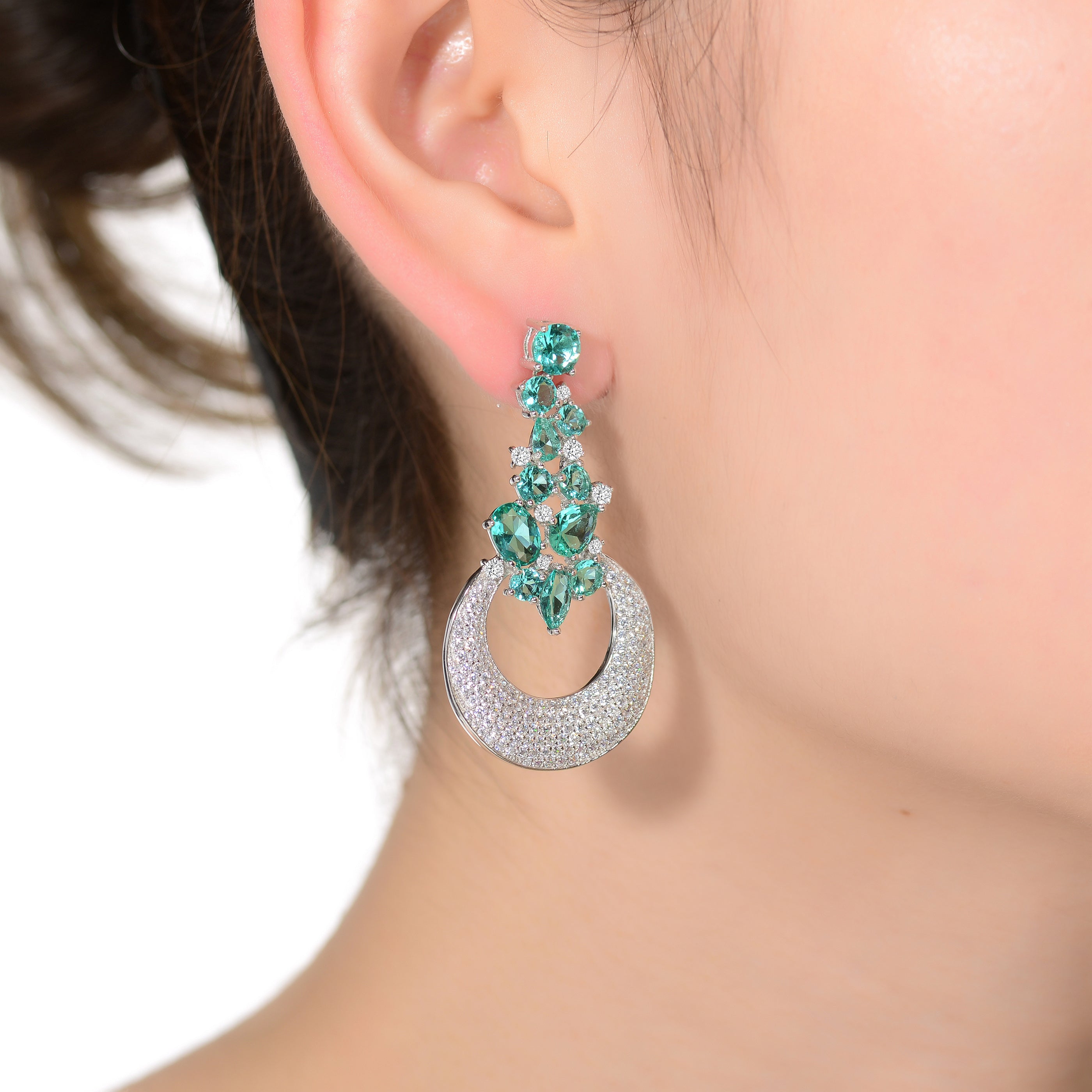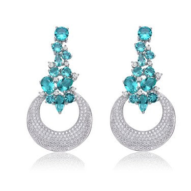 Sterling Silver Open Round Circle Shape Clustered Round Earrings Crescent moon inspired dimension features purple or blue cubic zirconia and paved clear gemstones on the crescent moon design. These dangle earrings are made from .925 sterling silver and secured with butterfly clasp. Available in Amethyst with Rose Gold platting or Aqua Rhodium platting.