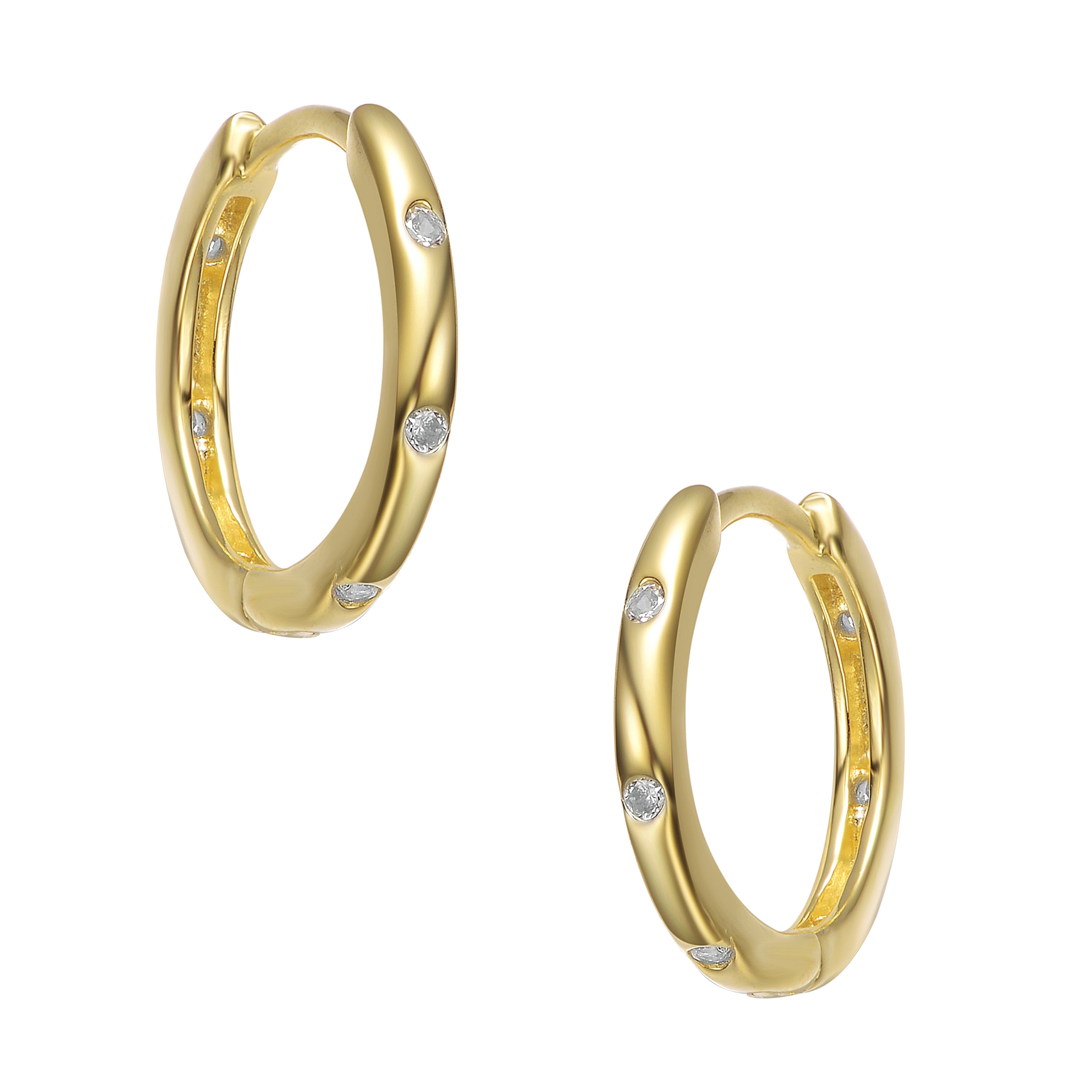 Sterling Silver 14K Gold Plating Cubic Zirconia. Add a pop of luxurious color with these sterling silver designer-inspired hoop earrings! Rich, sparkling -like cubic zirconias alternate in a 14k yellow gold plated finish. Hinged posts secure these unique hoops.