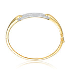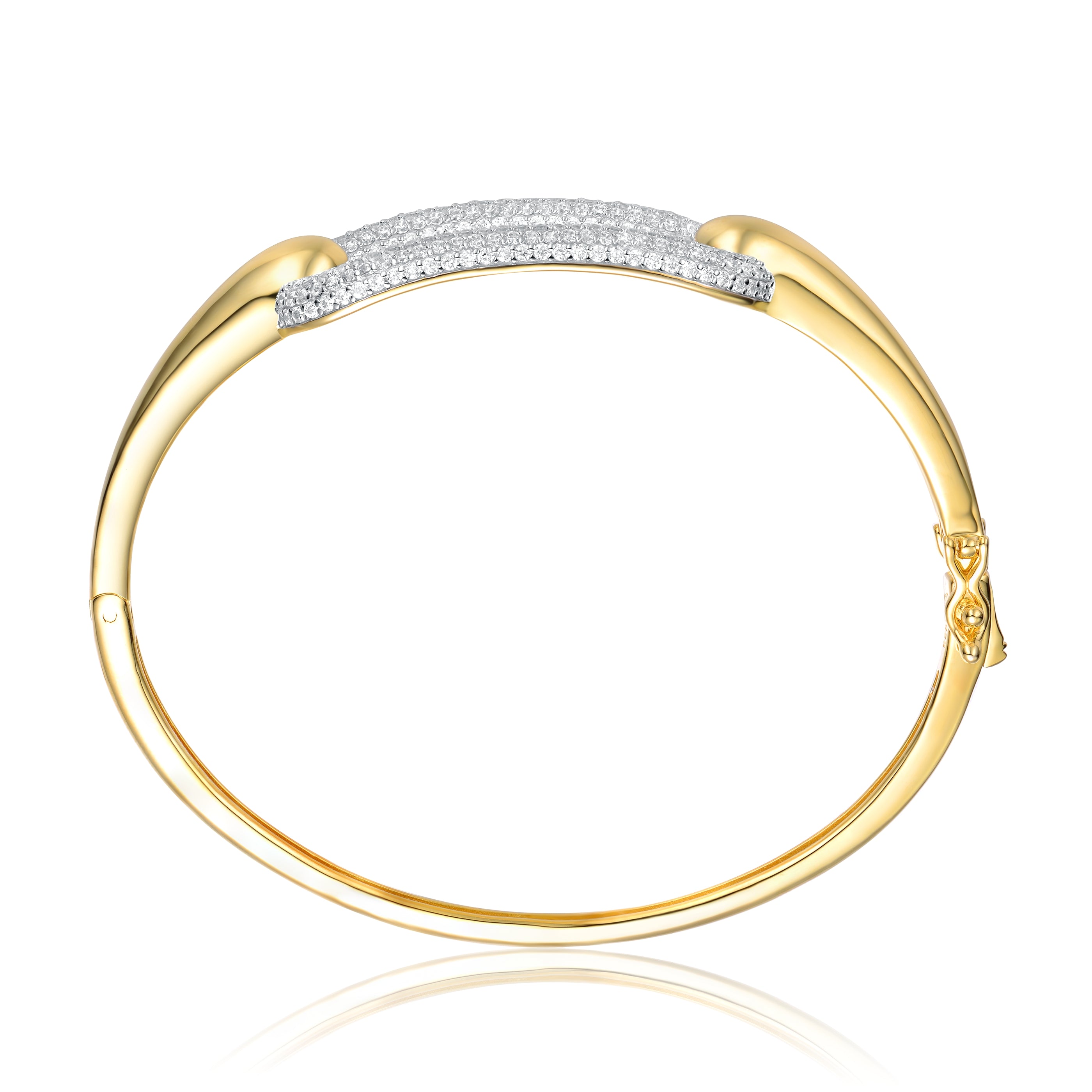 Sterling Silver 14k Yellow Gold Plated with Cubic Zirconia French Pave Geometric Link Bangle Bracelet. Add elegance to your day or night wardrobe with this stunning sterling silver 14k yellow gold plated bangle bracelet featuring round brilliant cut cubic zirconias French pave set on the top geometric open link. This ultra-shiny bracelet keeps secure with a box clasp on one side and a hinge on the other, creating effortless wearability for your convenience. The tapered, round shape silhouette from top to bottom allows this glam bracelet to sit gracefully on the wrist.