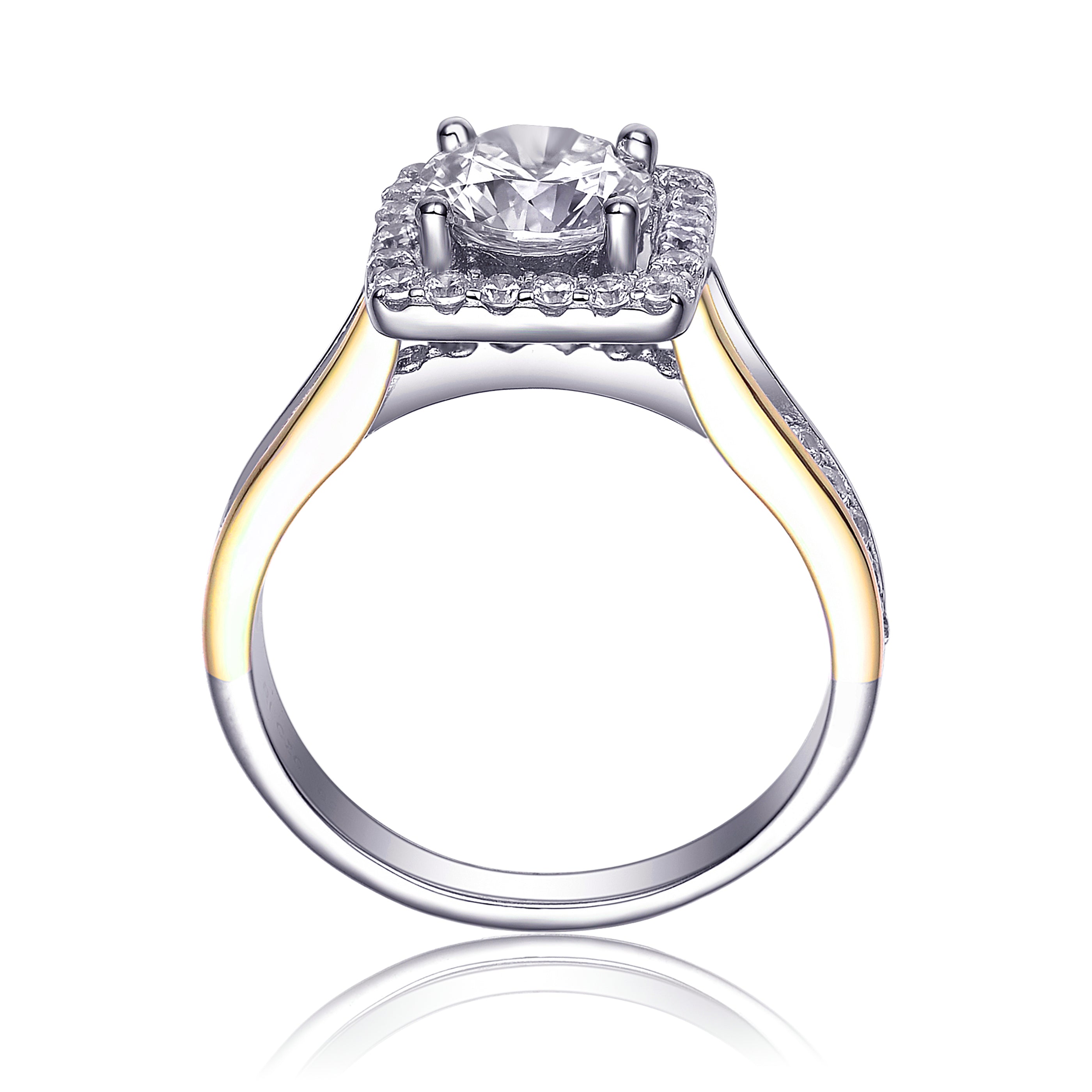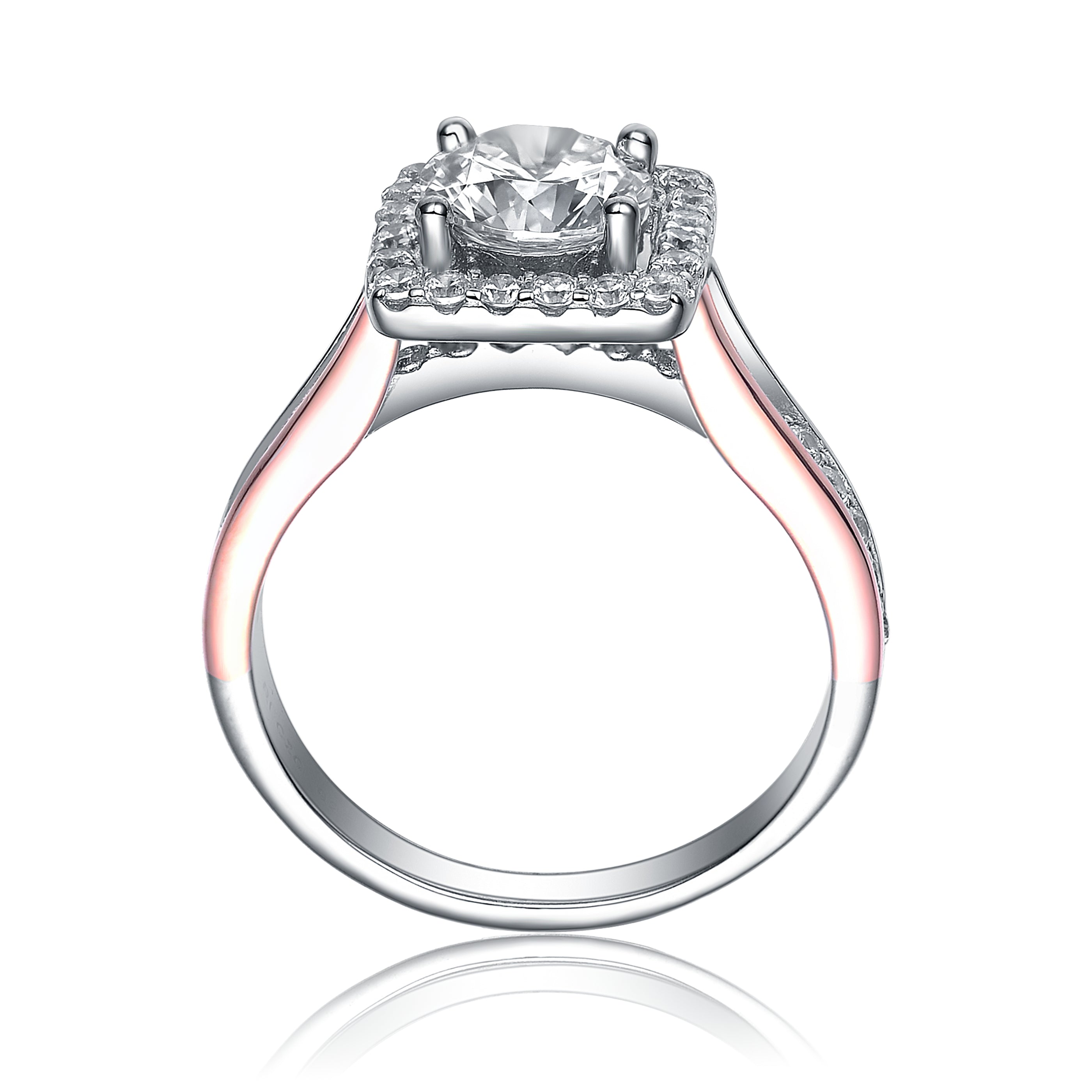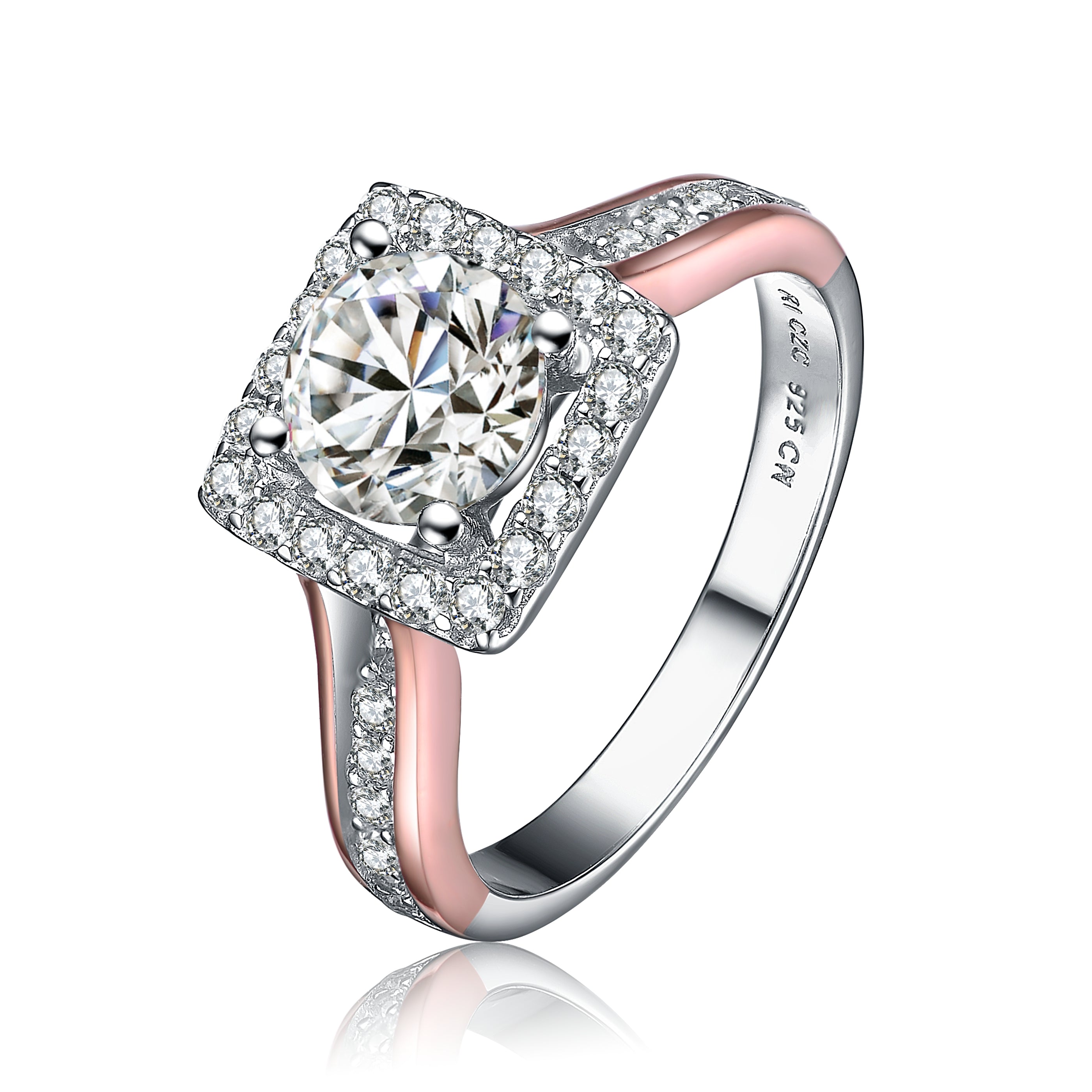 Stylish Sterling silver 18K Rose Gold Plated cubic zirconia pave engagement ring. This two tone ring is accented by Rose Gold overlay on two sides of the band. At the center sits a large clear round cubic zirconia accented by small clear round cubic zirconia stone. Crafted in Sterling silver with White and 18K Rose Gold plating and it is available in sizes 6, 7, 8. Makes a great gift as well.