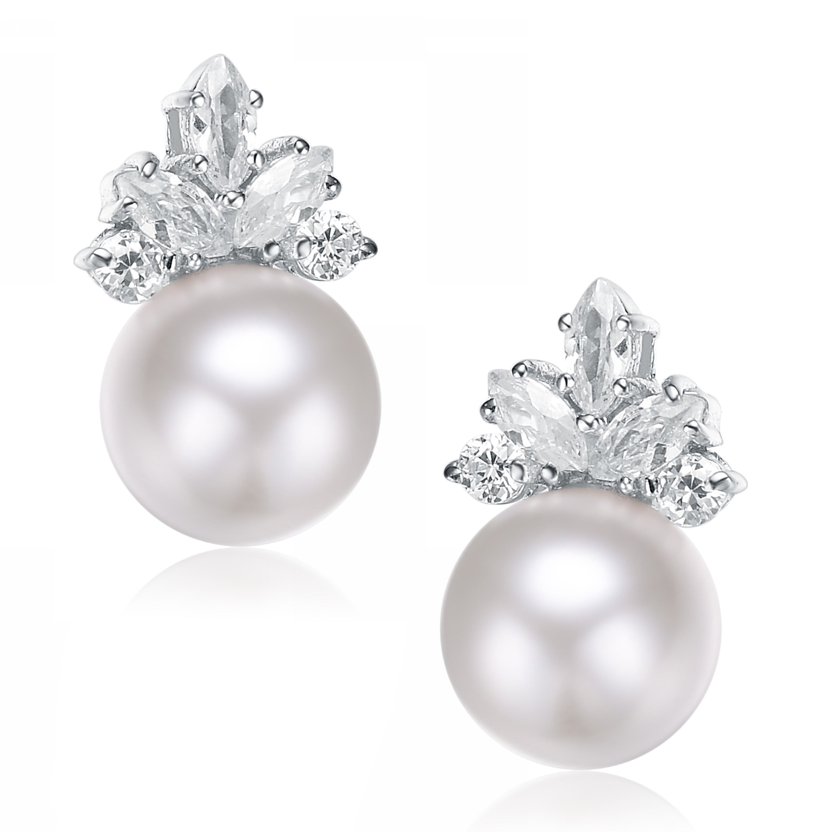 A single faux white pearl adorns each of these eye-catching stud earrings, crowned by marquise and round-cut clear cubic zirconia gemstones. The earrings are crafted of .925 sterling silver with highly polished White Gold plating.