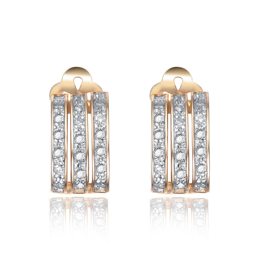 These sophisticated earrings feature a gold-plated sterling silver design, showcasing a trio of vertical bars. Each bar is adorned with sparkling cubic zirconia stones, meticulously set to catch the light from every angle. The top of each earring curves gracefully, adding a touch of elegance to the geometric precision. Perfect for adding a luxurious yet modern touch to any outfit.
