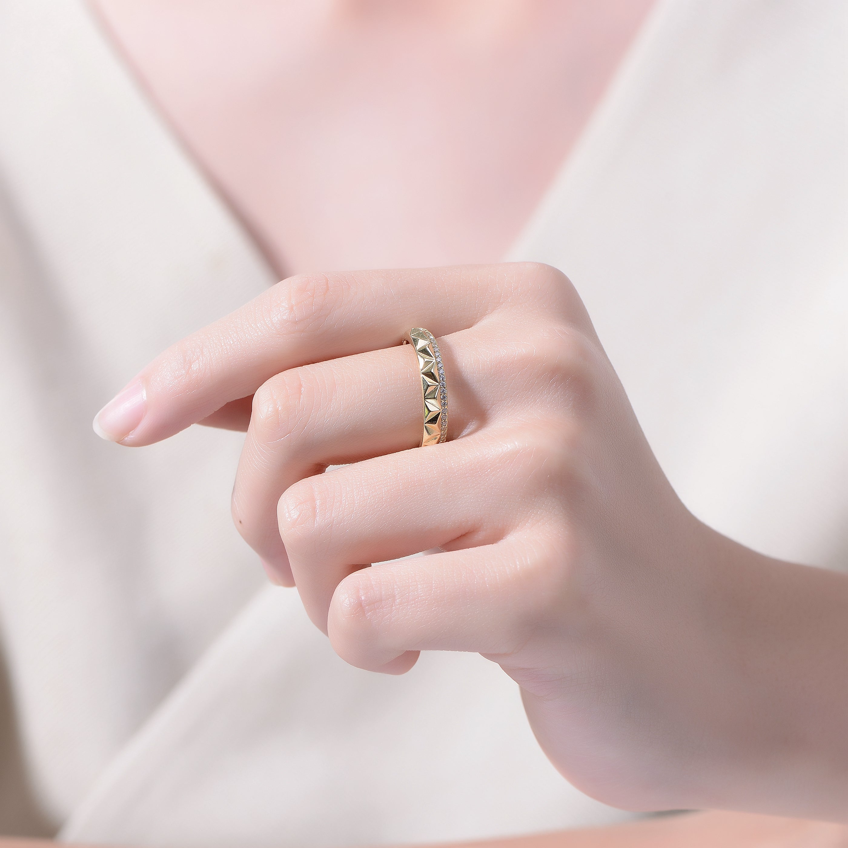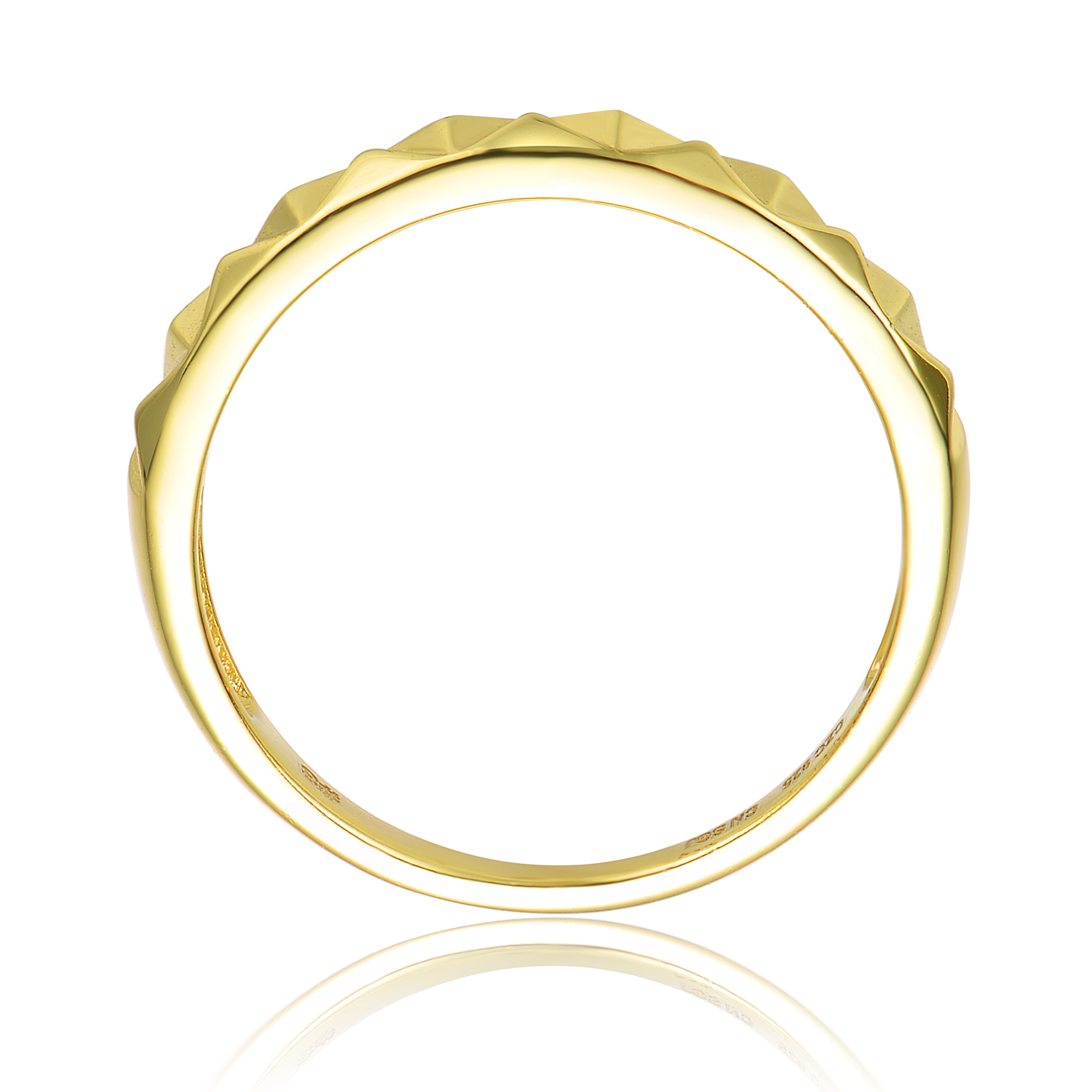 Elegant Sterling Silver 14K Gold Plated and Clear Cubic Zirconia 2-Row Modern Ring . This ring item features a sophisticated design that is made out of spiked pyramid of solid gold and one small trail of clear round cubic zirconia stones on the other side. Crafted of Sterling Silver with 14K Gold Plating and it is available in size 6 or 8. Perfect piece of jewelry for stylish combinations. This item also makes a sensational gift.