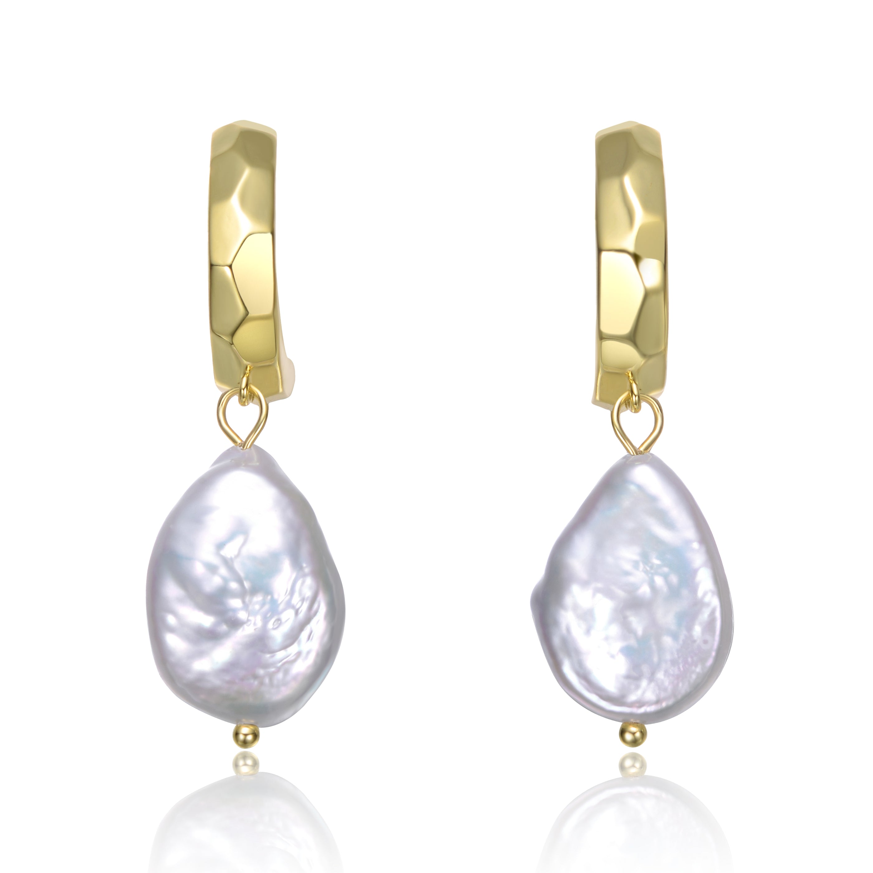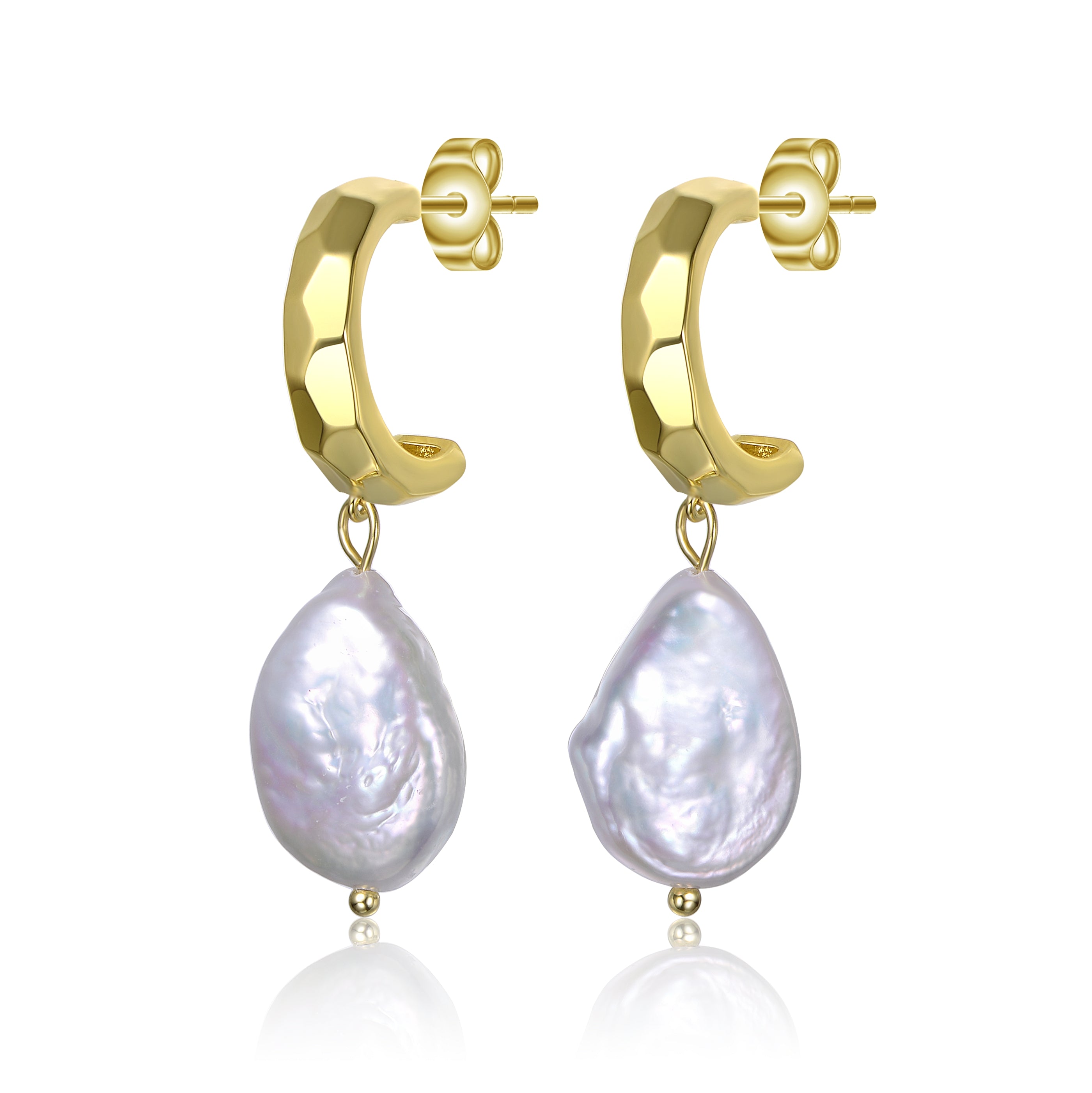 These elegant earrings feature a 14K Gold Plated sterling silver base with a sleek design that adds a touch of sophistication. Each earring is adorned with a unique, irregularly shaped freshwater pearl, showcasing the natural beauty and individuality of each piece. The combination of gold and pearl creates a timeless and versatile accessory, perfect for both casual and formal occasions. With their secure and comfortable fit, these earrings are a must-have addition to any jewelry collection.