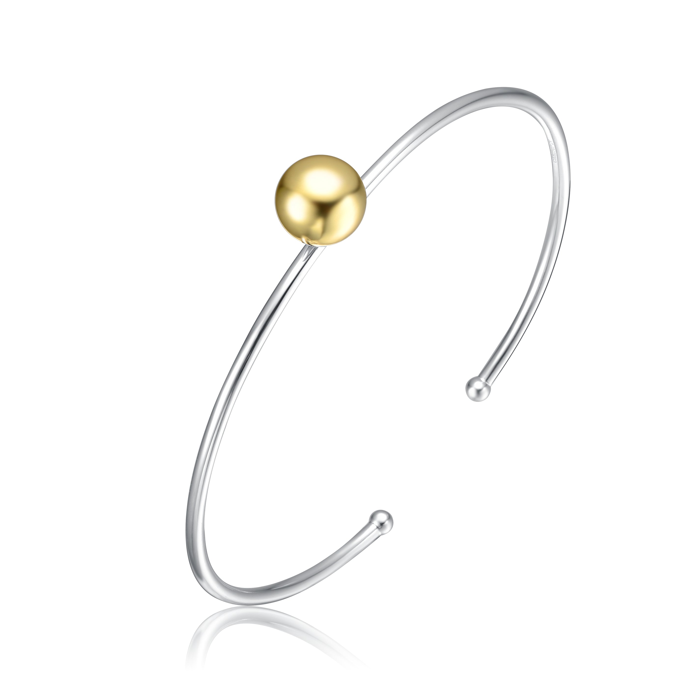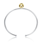 Embrace minimalist elegance with our Sterling Silver Two-Tone Open Cuff Bracelet. This stunning piece features a captivating 14K gold plated sphere at its center, beautifully contrasting with the sleek White Gold Plated design. The open cuff structure ensures a comfortable fit and easy styling, making it a versatile accessory for any occasion. Wear it alone for a chic statement look or layer it with other bracelets for a trendy stacked effect. Crafted with high-quality materials, this bracelet combines modern design with timeless appeal, perfect for elevating both casual and formal outfits!