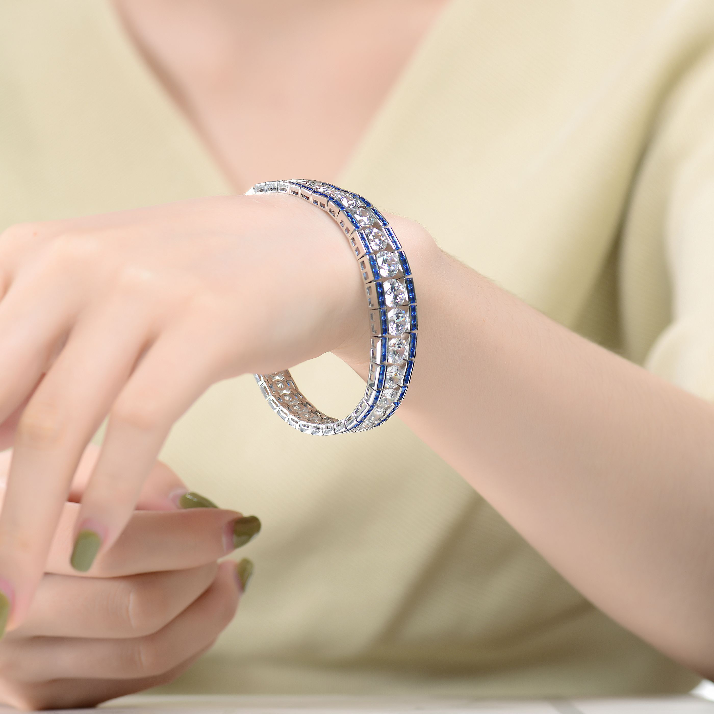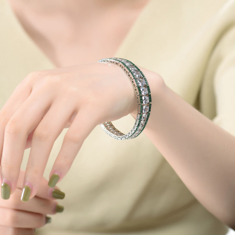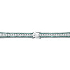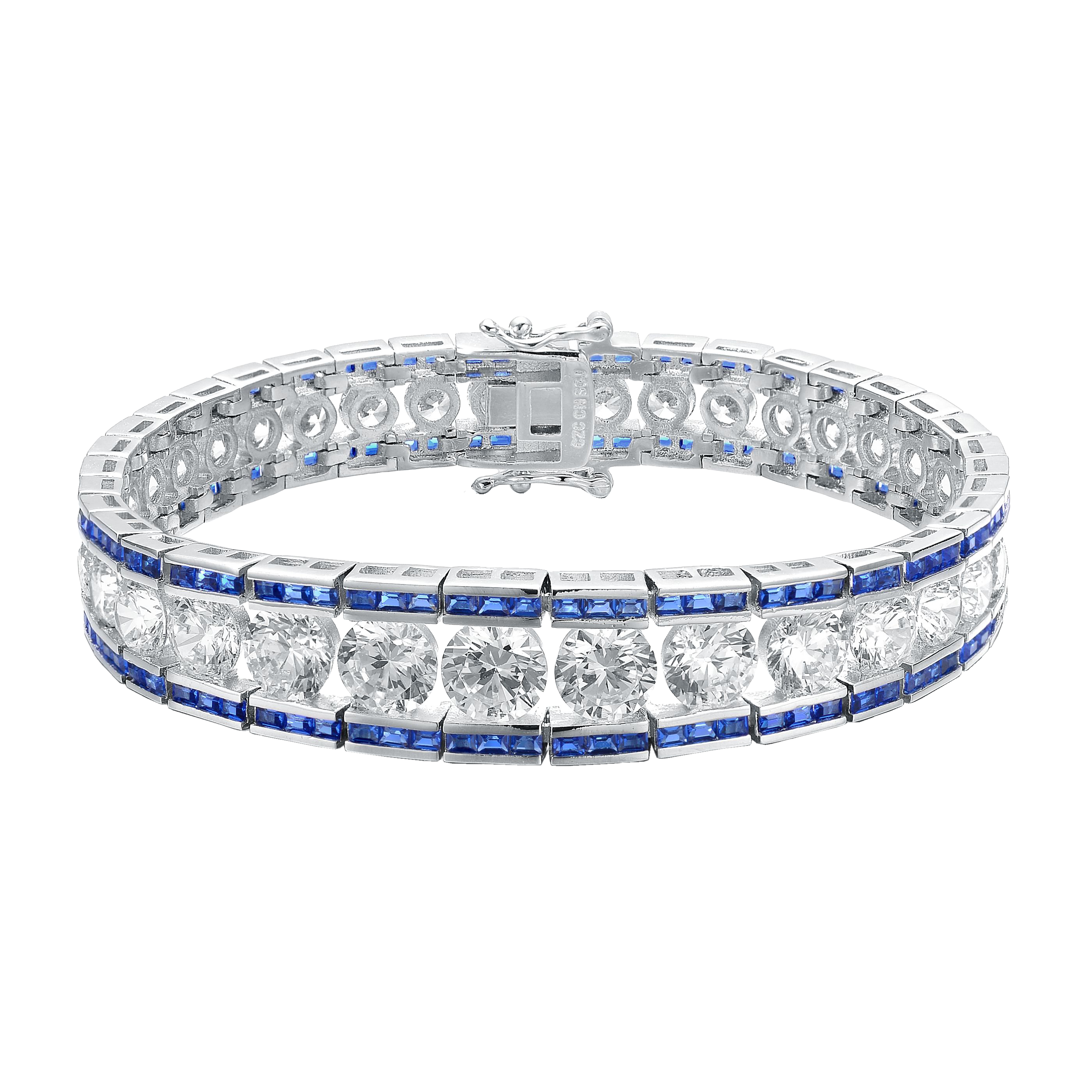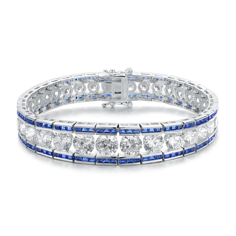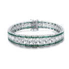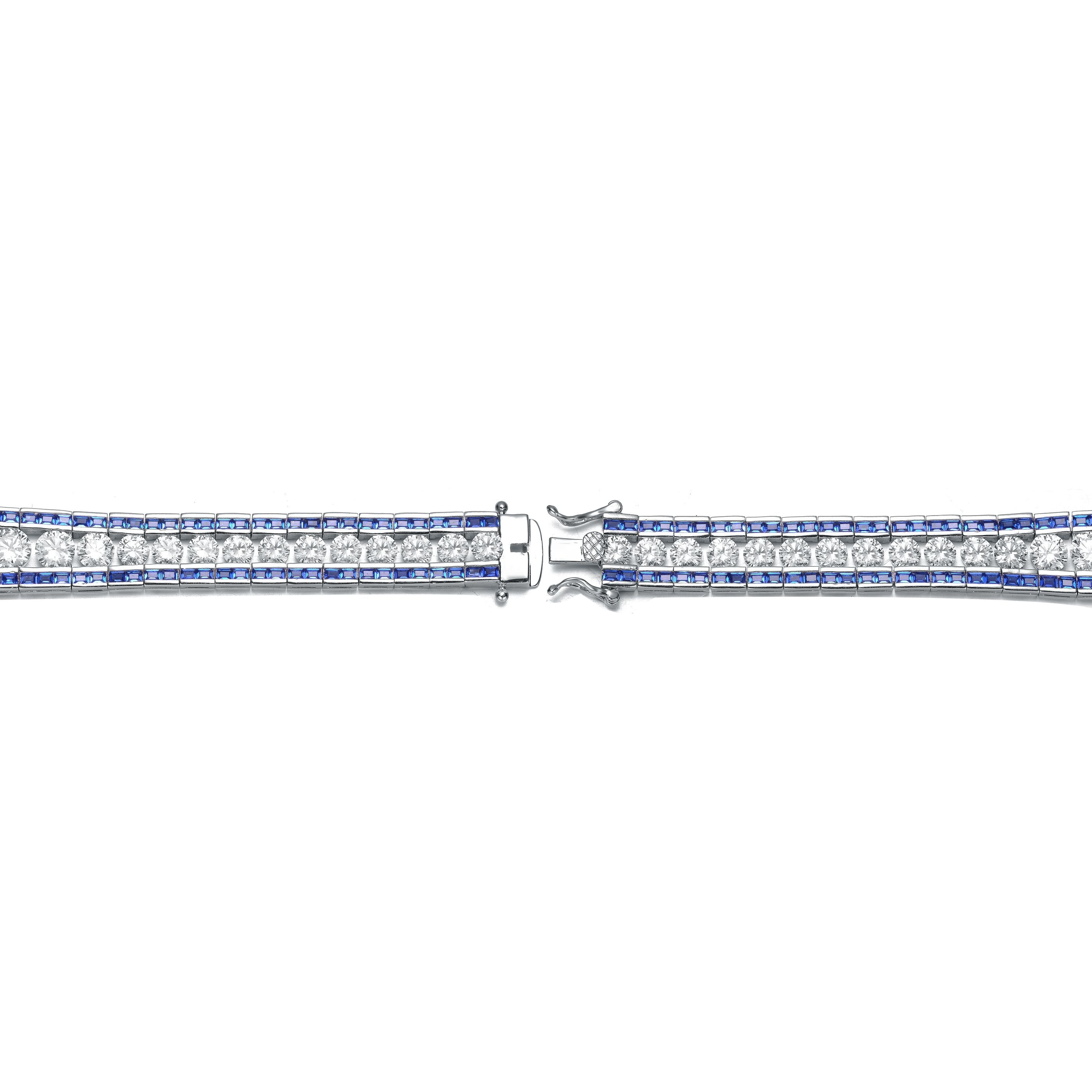 This refined .925 sterling silver link bracelet showcases a graduated design, accented with large clear round cubic zirconia stones and vibrant baguette-cut stones at both the top and bottom. Available in striking Green or Blue variations, it features a polished rhodium-plated finish and secures comfortably with a box clasp.