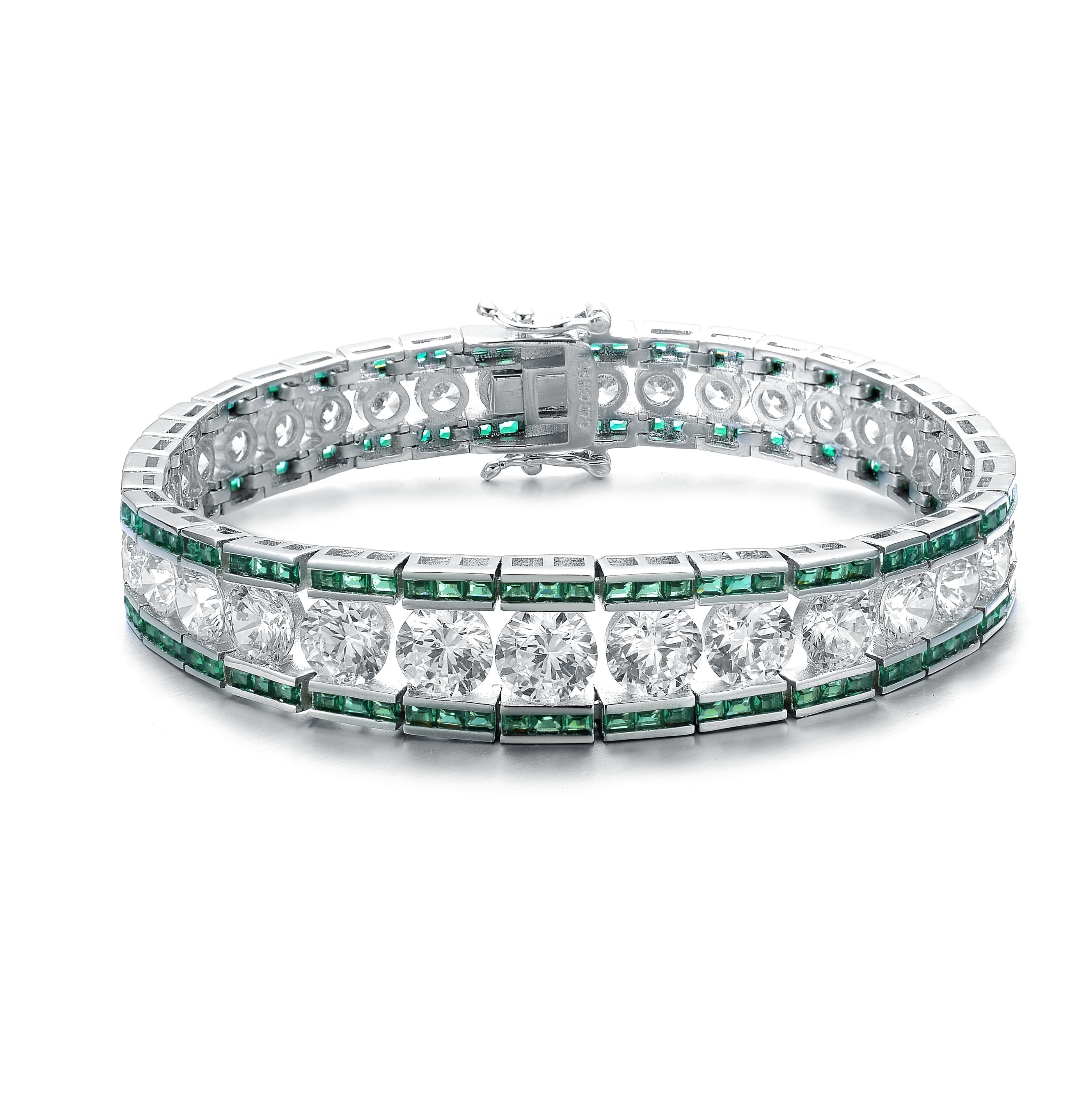 Elegant .925 Sterling silver link bracelet. This bracelet features graduating links decorated with large clear round cubic zirconia and green baguette cubic zirconia stones at the top and the bottom. Crafted of .925 Sterling silver with rhodium plated and it is secured with box clasp.