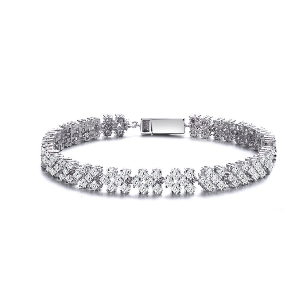This elegant looking bracelet features dazzling clear princess cubic zirconia that are clustered together and forms a lattice style pattern. This bracelet is set in .925 Sterling silver with rhodium plated and secures with a slide clasp.