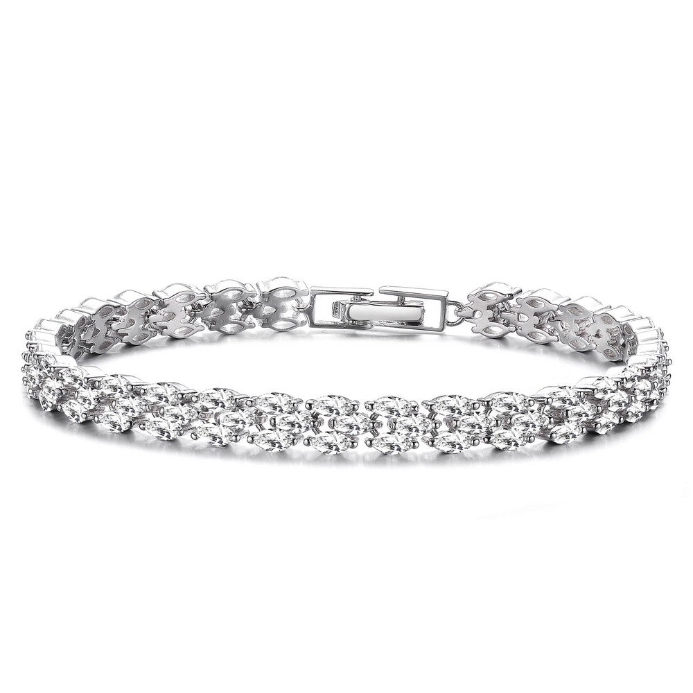 Go out with style when you wear this .925 Sterling silver with rhodium plated bracelet. This piece features three rows of clear marquise cubic zirconia that are arranged horizontally to give this bracelet a unique style. This bracelet is secured with a delicate fold over closure.