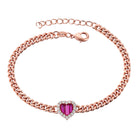Sterling Silver 18k Rose Gold Plated with Ruby Heart & Cubic Zirconia Adjustable Tennis Bracelet. Romantic moments should last today and tomorrow with this brightly polished 18k rose gold bracelet, a symbolic token of affection. A rubycubic zirconia solitaire nestles in the center. Glittering round brilliant cut cubic zirconias pong set on a dazzling tennis chain gives it extra glamour. A secure lobster claw clasp with an extension chain adjusts to your wrist size, making this bracelet ideal for gifting to any loved one.