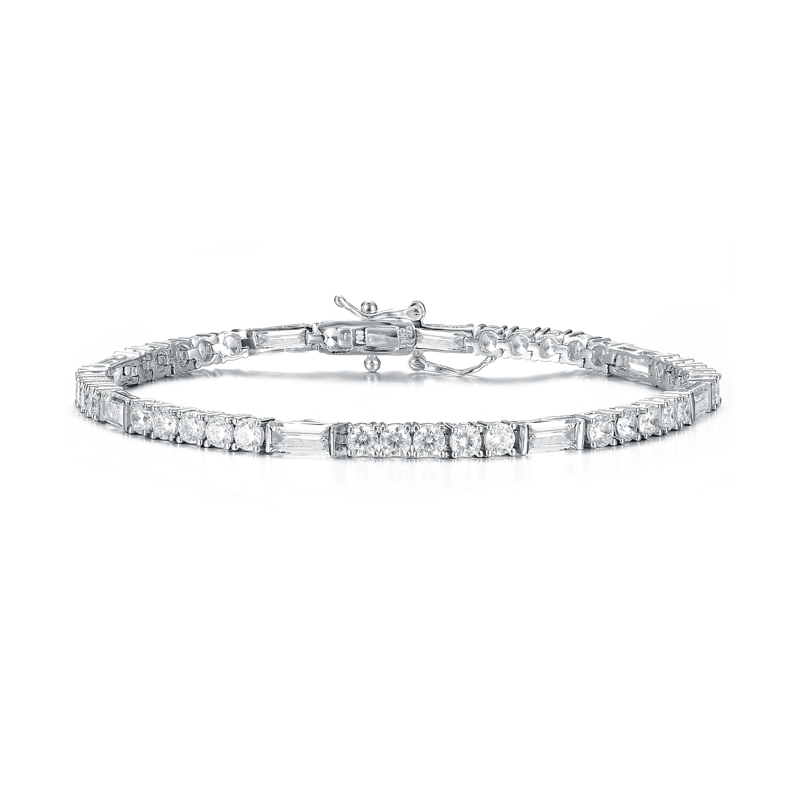 Elegant Rhodium Plated Sapphire Cubic Zirconia Tennis Bracelet. This beautiful bracelet features interesting design made out of clear round cubic zirconia stones set in four prong setting that accent the sapphire radiant cubic zirconia stones. The large radiant sapphire cubic zirconia stones are set in bar. Crafted of Sterling Silver with Rhodium Plating and it is secured with box clasp. Perfect piece of jewelry for stylish combinations. This also makes a sensational gift for a special birthday or occasion.
