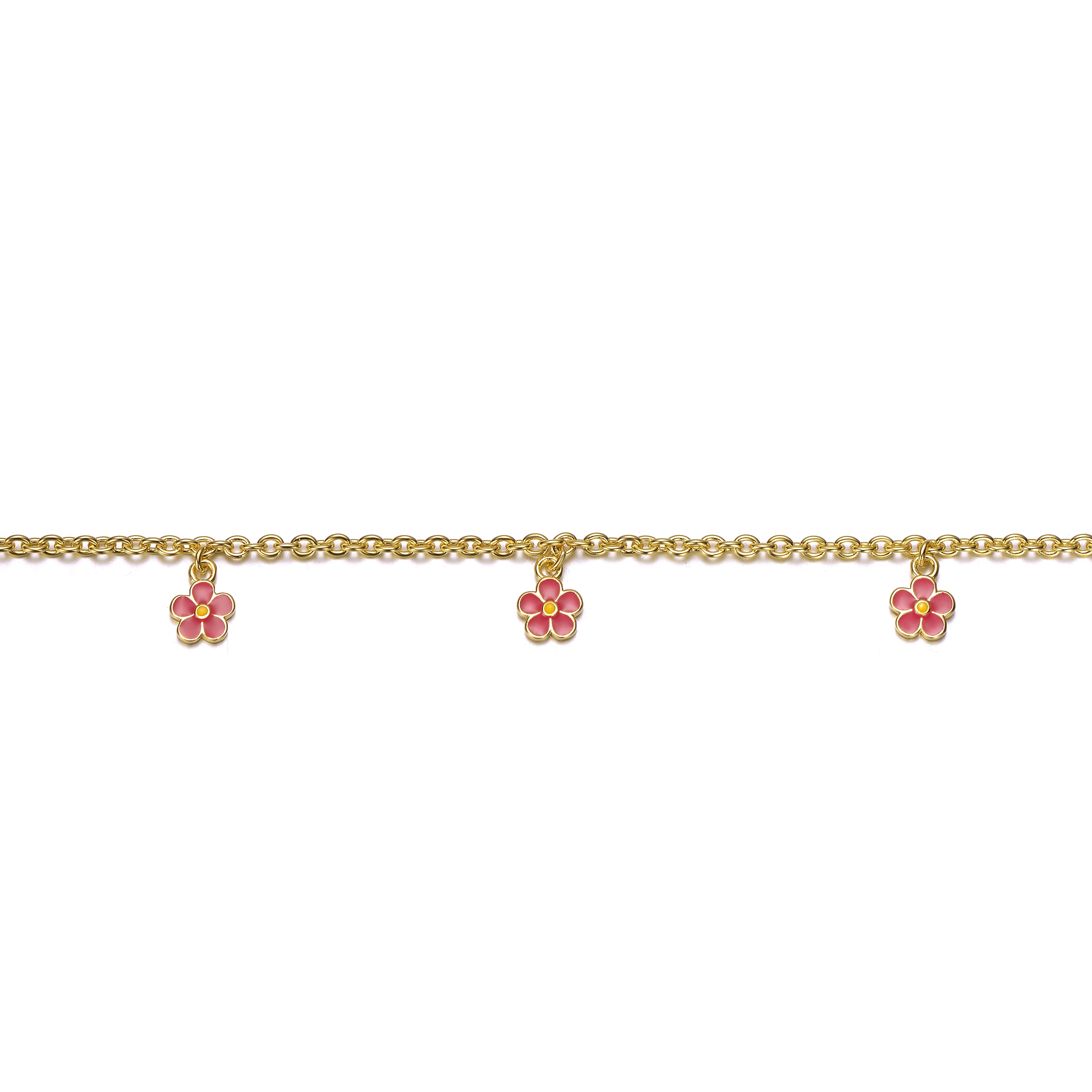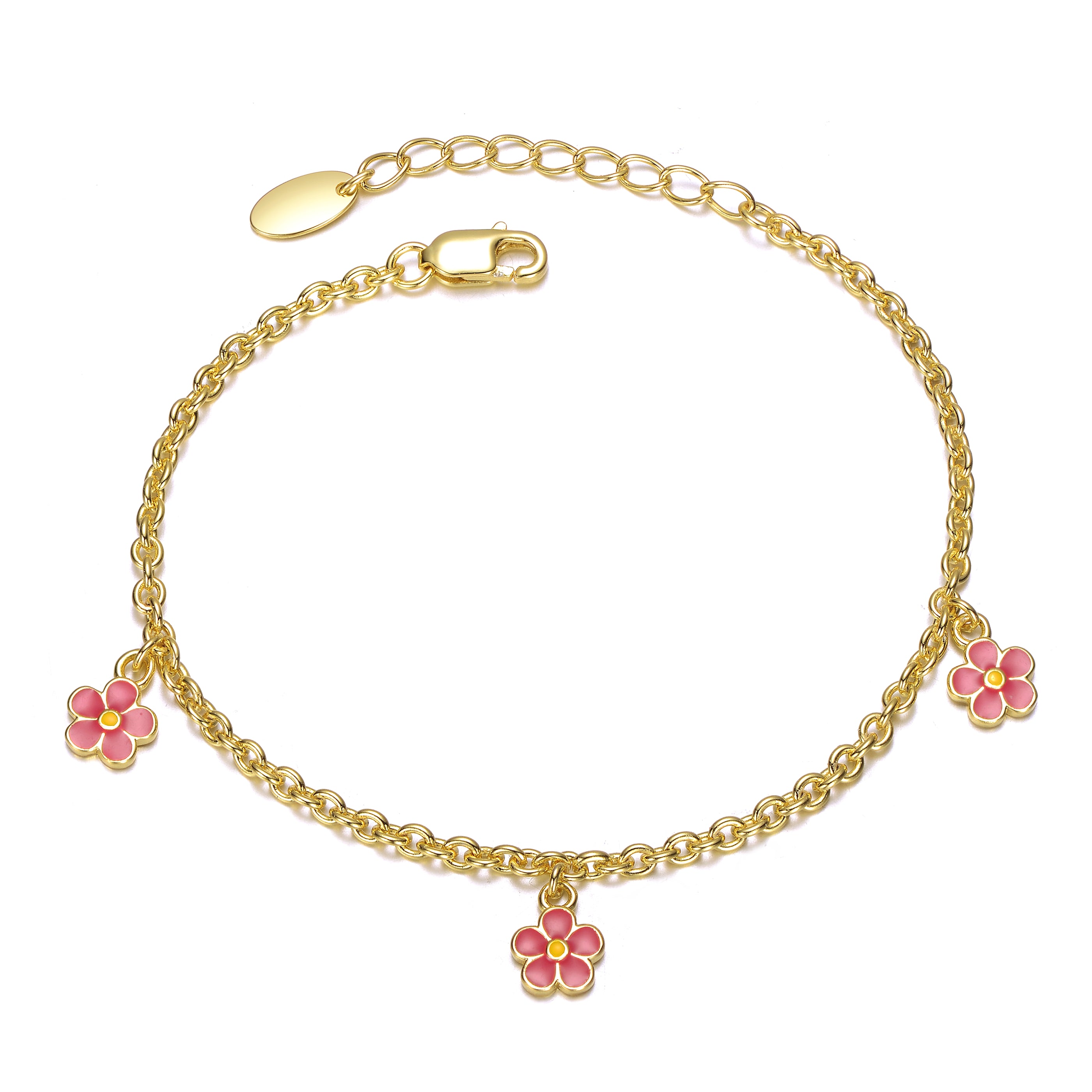 Kids Sterling Silver 14K Gold Plated Fuchsia-Pink & Yellow Enamel Daisy Charm Bracelet