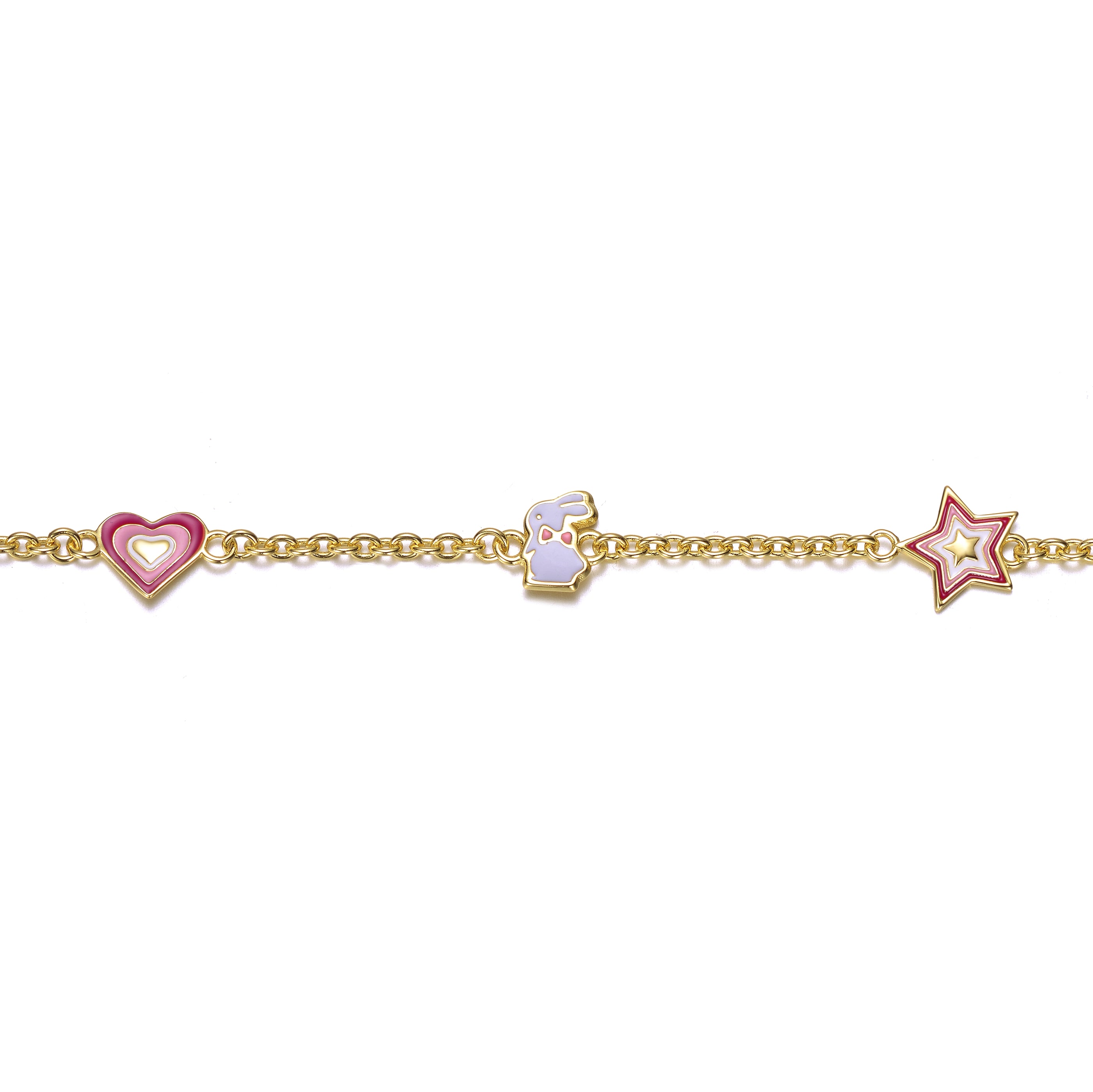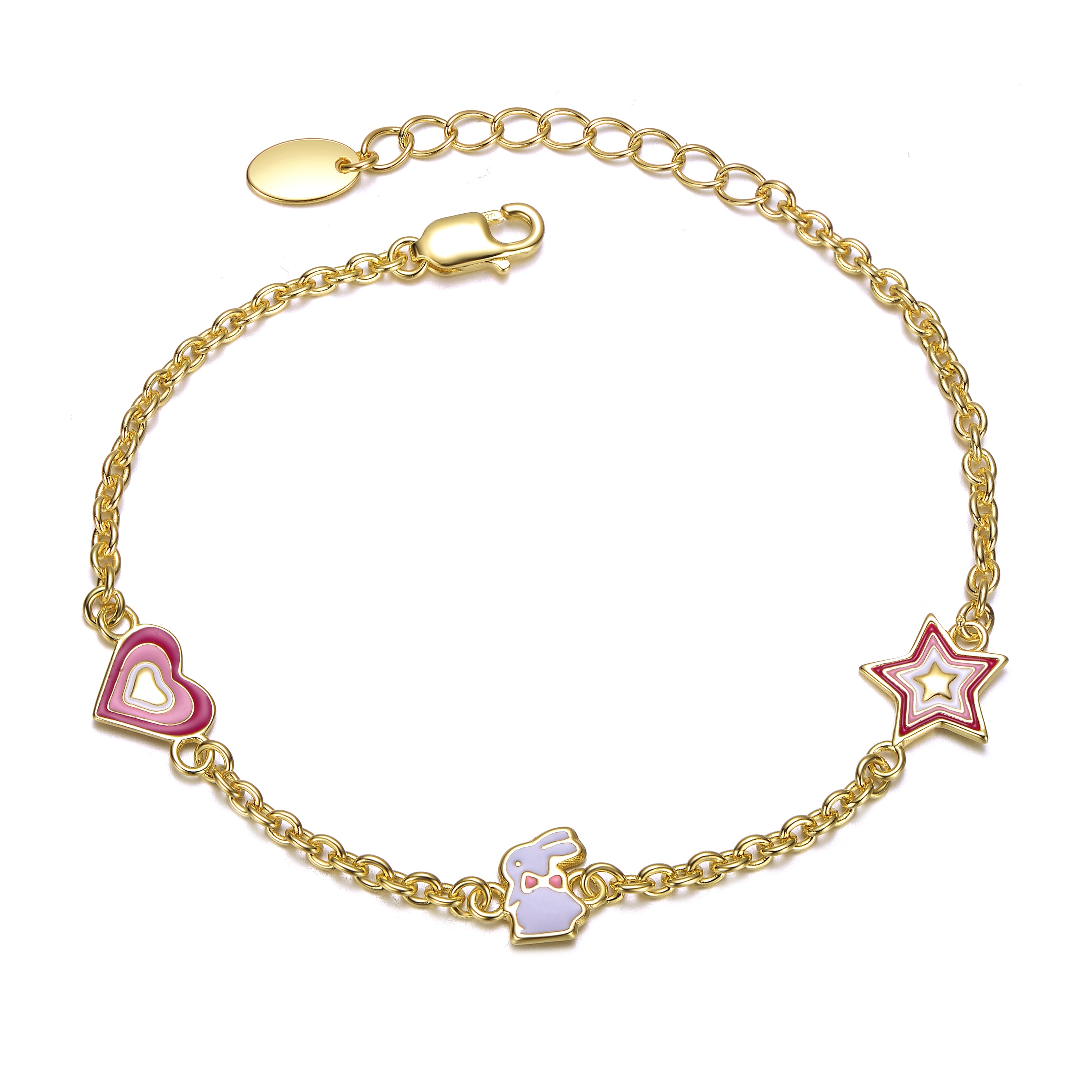 Delight your little ones with this enchanting multi color sterling silver 14K gold plated dainty link bracelet, perfect for birthdays, graduations, holidays, meaningful occasions, or just because. The bracelet features a charming trio of a fuchsia-pink heart, a blue and pink star, and an adorable mother of pearl bunny rabbit. The bright shine emphasizes the chic and playful design, making it a standout accessory. The bracelet is adjustable, measuring 5.5+1 inches, and is secured with a lobster clasp.